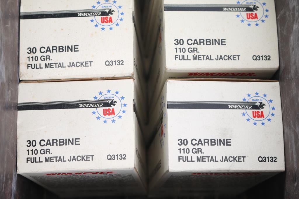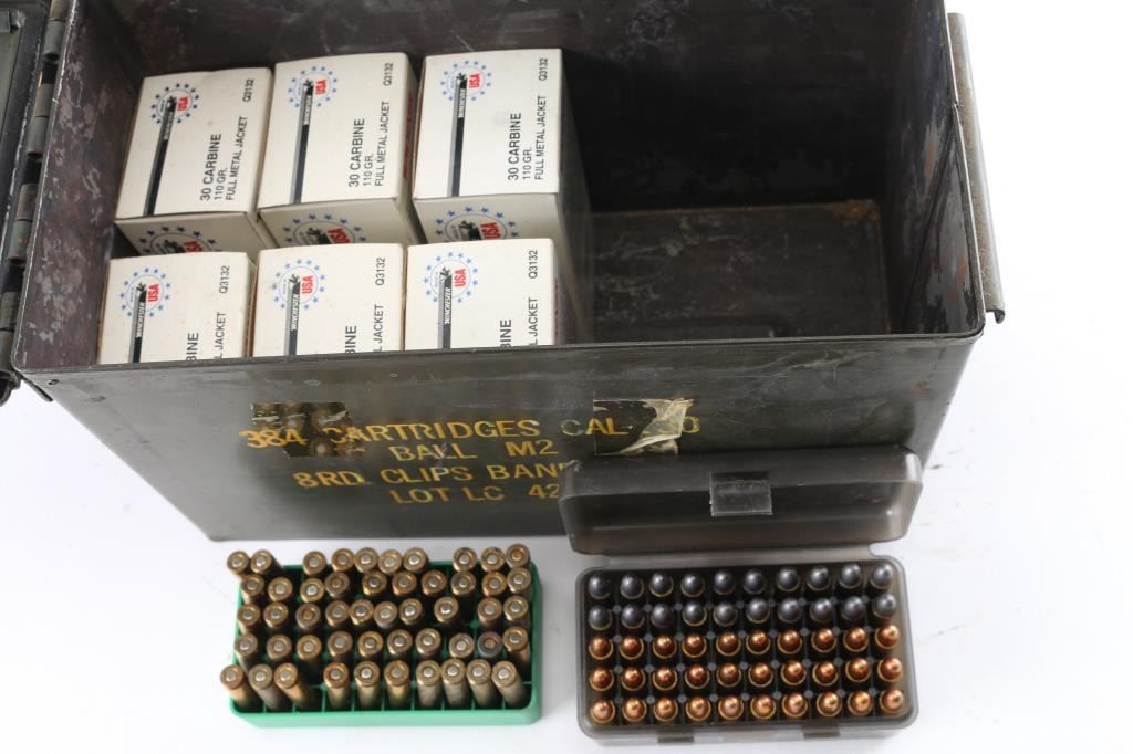 Approx. 407 rounds of factory new 30 Carbine ammunition. 300 rds of Winchester 110 Gr. FMJ & 107 or reloads, in factory boxes and plastic cases w/metal ammo can.