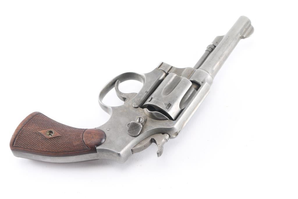 SN: 208967 'Model of 1905 - 3rd Change' double action revolver manufactured circa 1909-1915, built on the five screw square butt "K" frame. Features 4" barrel, half moon fixed front sight, fixed notch rear sight, fluted 6 shot cylinder, checkered wood grips. Bore is very good condition. Retains a dull gray finish. Grips are very good . Serial number repeated under barrel, rear of cylinder. Action is smooth with tight lock up.