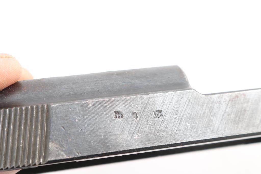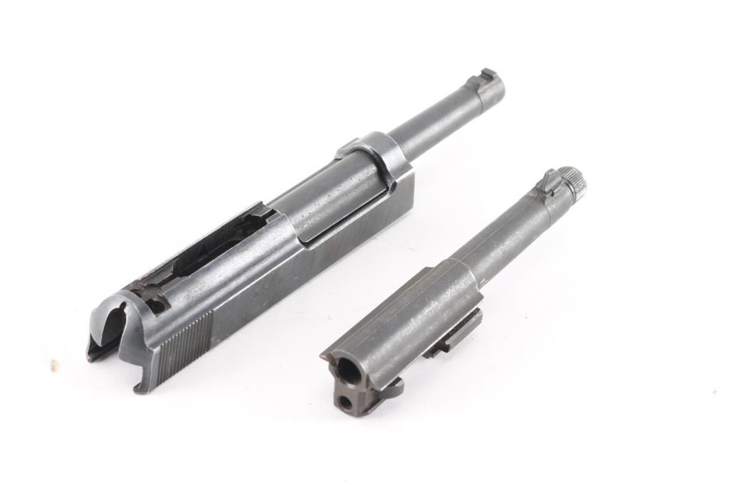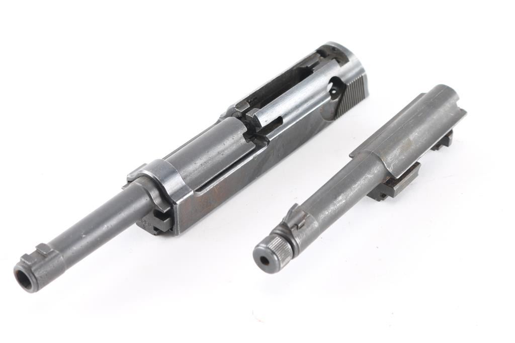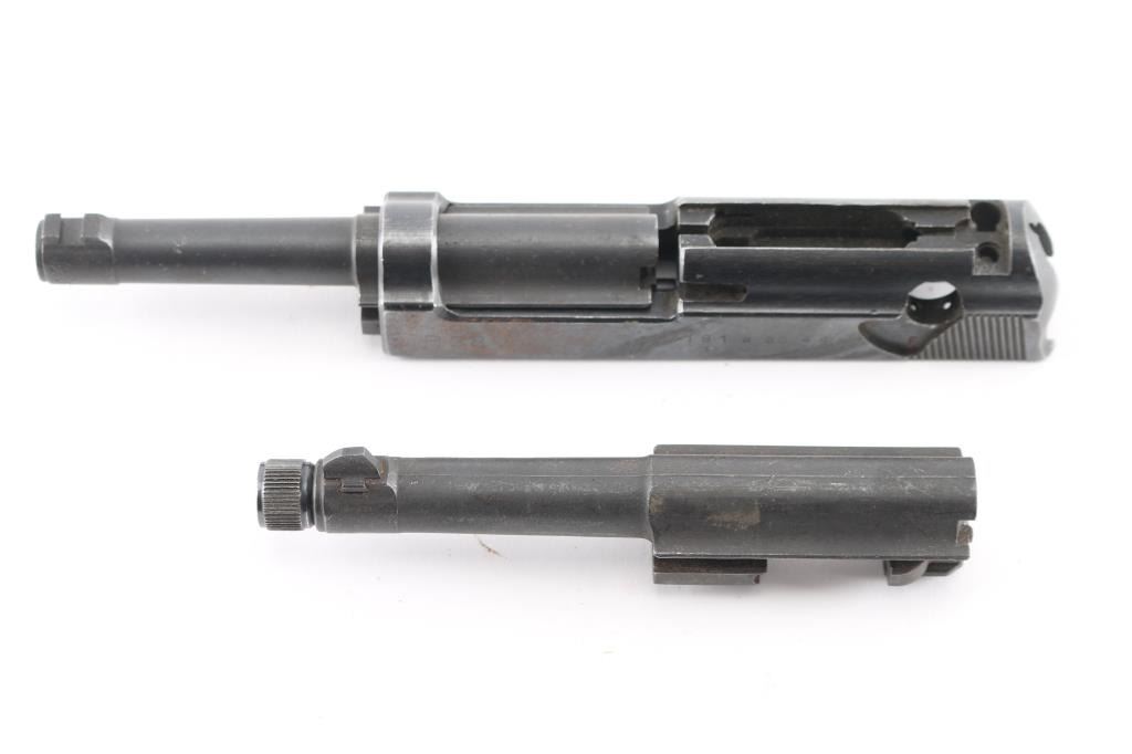 includes 2 barrels, one 5" 9mm & one 5" 9mm w/ internal threads and plug. An incomplete upper receiver slide marked, "P38 7181 a ac 44" on left side and right w/ Waffenamt "359".