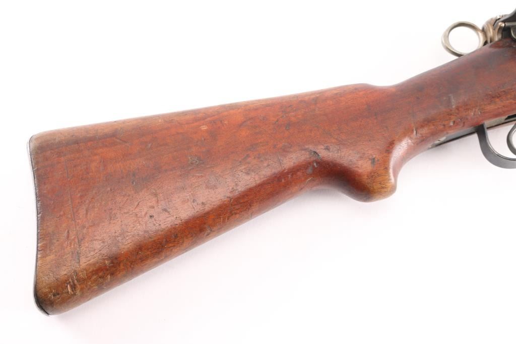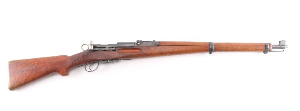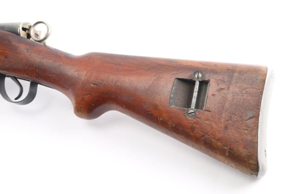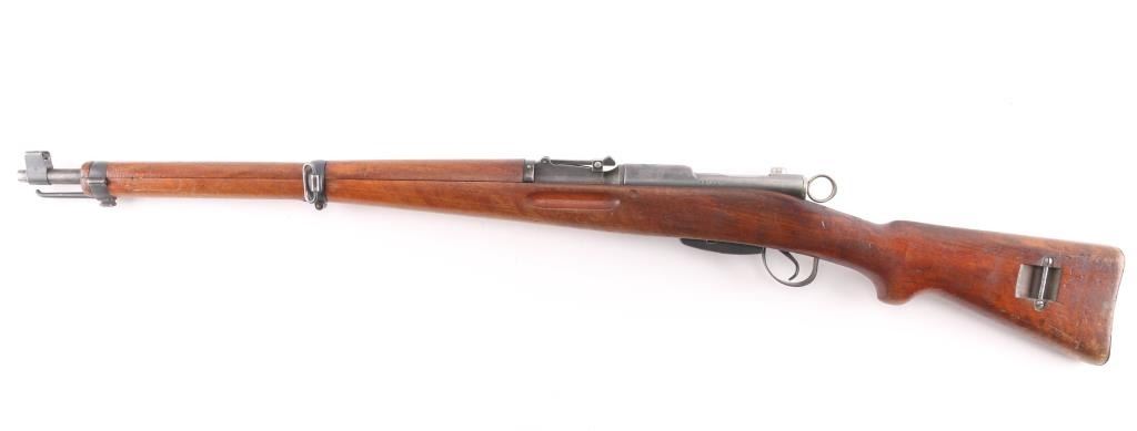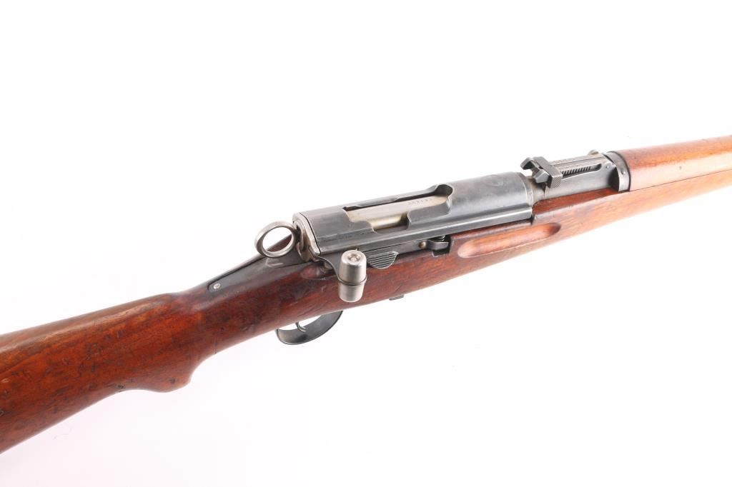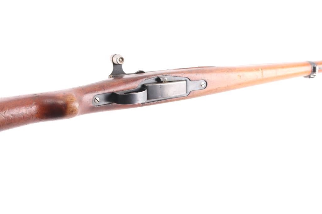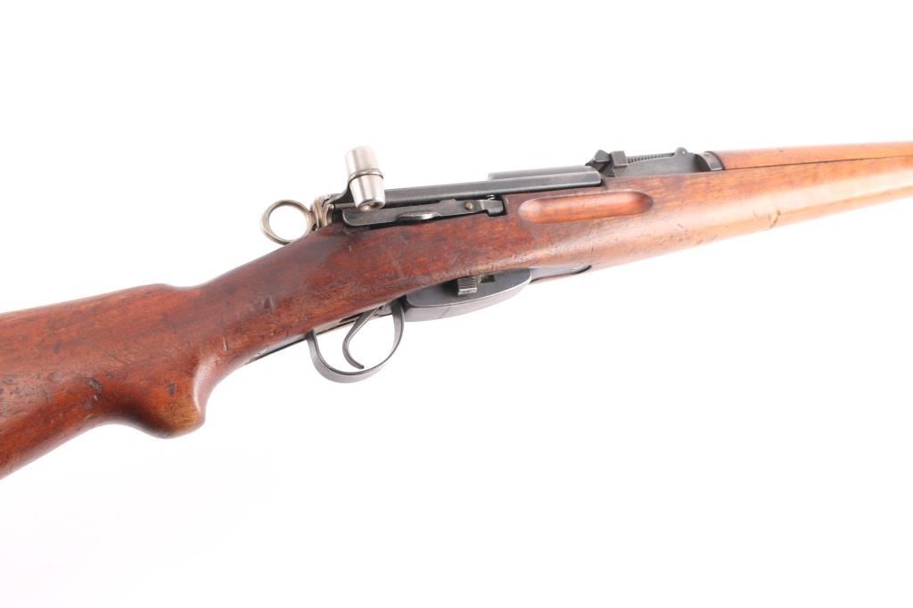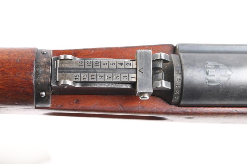 SN: 661421. Schmidt–Rubin' Swiss military straight pull bolt action rifle imported by M&M Co, marked on the underside of the barrel. Features blued finish, wood semi pistol grip stock, 25" barrel, bayonet lug, stacking hook, blade front sight inside protective ears, tangent rear sight, sling swivels, detachable magazine, "beer barrel" shaped aluminum bolt knob. Swiss cross in shield on chamber. Bore is excellent/bright. Retains about 90% coverage of blued finish, showing edge losses & handling marks, handling loss on the floorplate. Bolt assembly is mostly bright polished, some blued pieces, overall in very good condition. Stock is good/sound, there is a couple of small gouges on the underside of the fore stock. Original serial number matched on receiver, barrel, bolt, magazine.