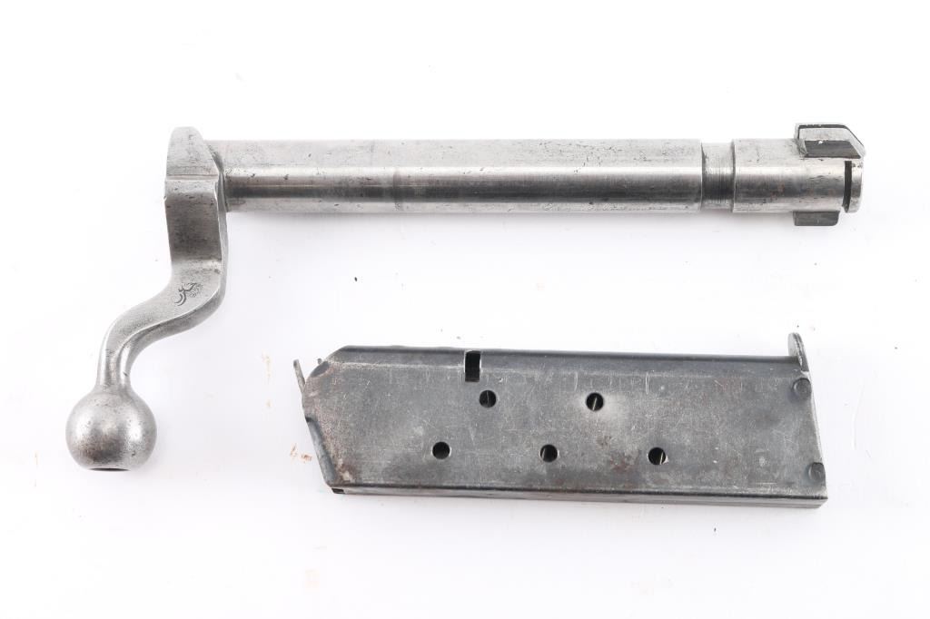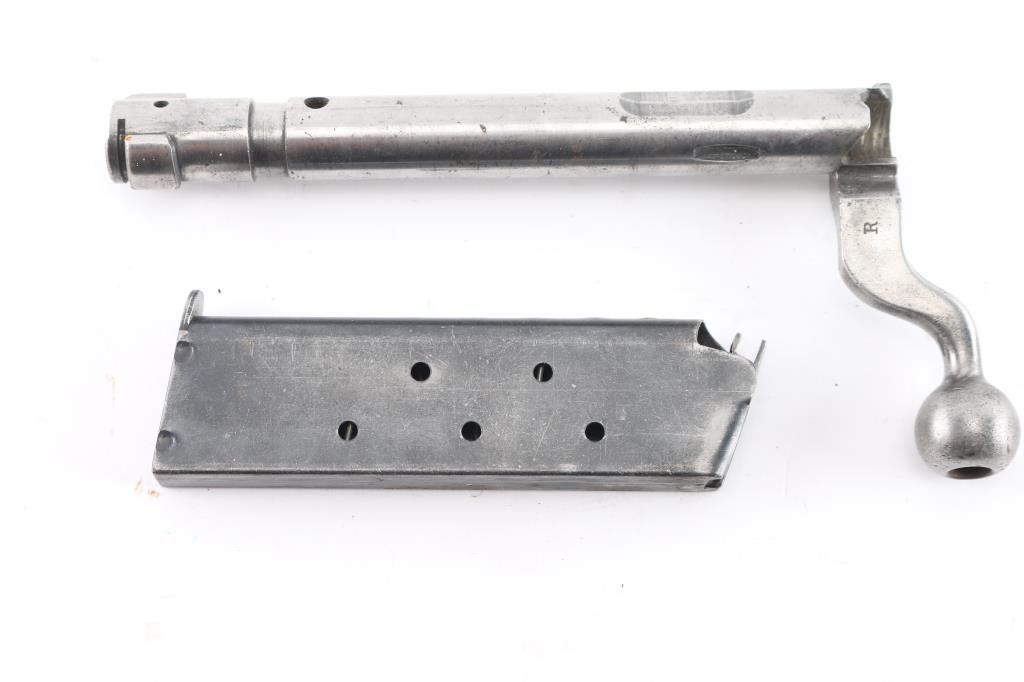 1917 bolt body, stripped w/ bolt band, Remington 'R', and flaming bomb on dog leg bolt handle, 30-06. U.S. M1911 8 round magazine, unmarked. Both in Good condition.