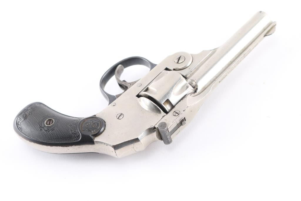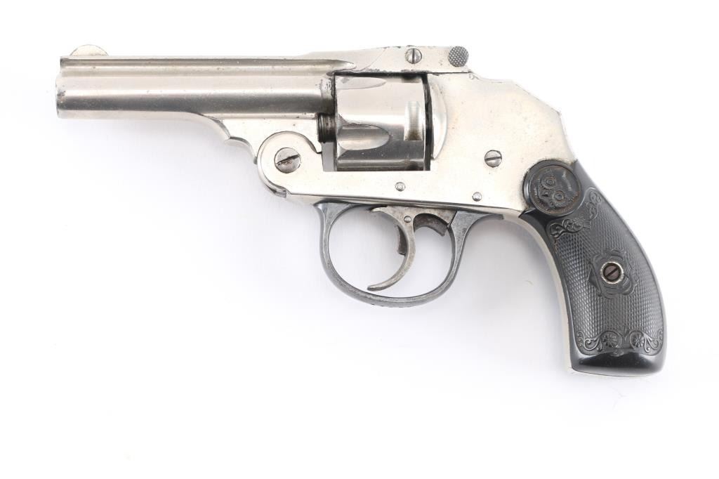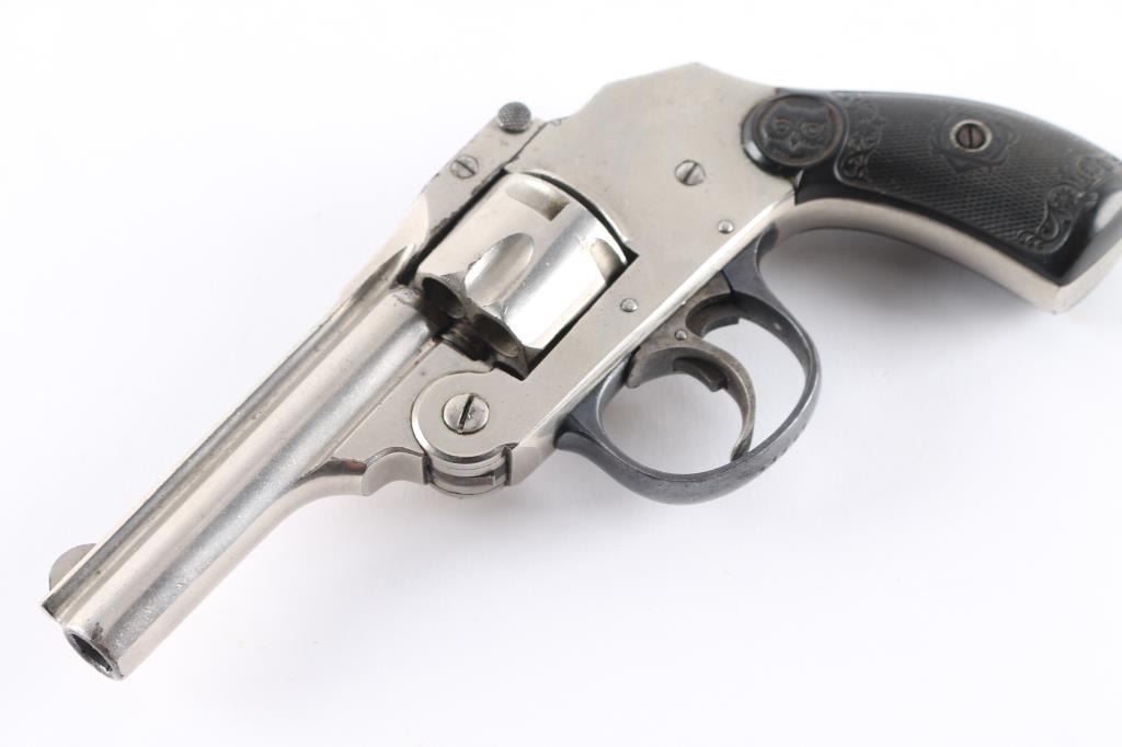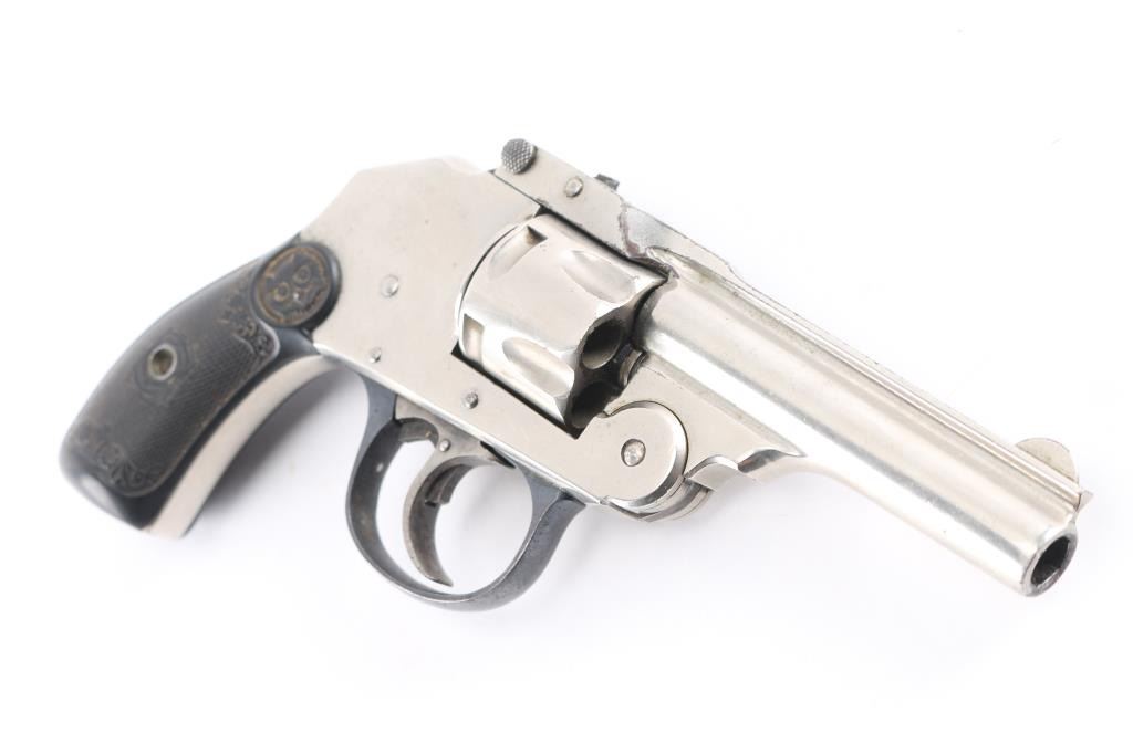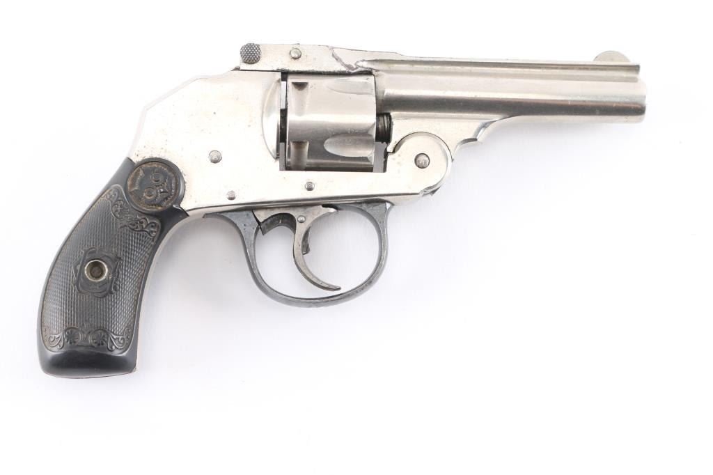 .32 S&W Sn: L43367. .38 S&W Sn: 16079. Second Model' 1896-1908 with safety lever on trigger. Break Top. Features nickel finish, checkered black hard rubber "owls Head" grips, 3 " ribbed barrel, fixed sights, 5 shot cylinder, double action only with internal hammer. Cylinder star ejects cartridges when opened. Bore is excellent. Nickel finish is very good with no flaking. Grips are very good condition. Action is mechanically sound. Blue triggerguard is very good. Iver Johnson Arms& Cycle works address on barrel rib, serial number on underside of triggerguard, patent dates on heel. You don't find many of these in this condition.