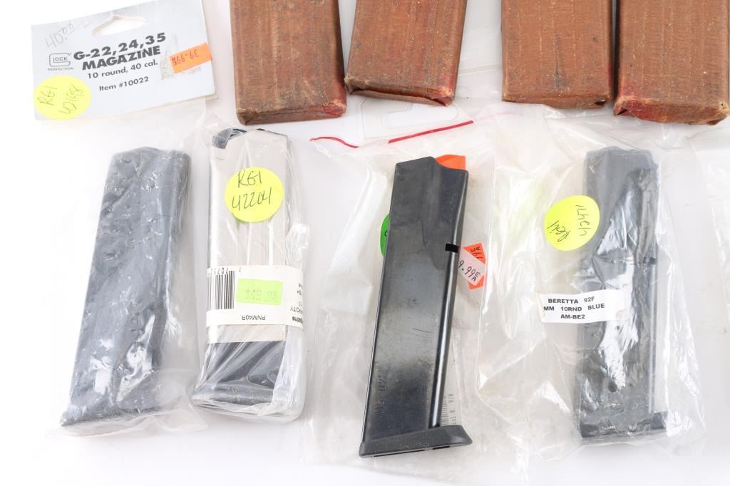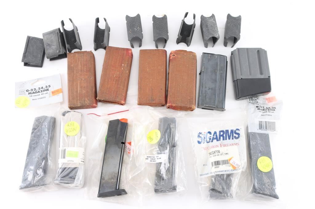 includes 5 - M1 Carbine, 10 rd, 4 new in wax paper; 2 - Glock 10rd 40 Cal. ; 1 - Sig 229, 10rd; 1 - Beretta 92F, 10rd; 1 - Para Ordnance 40 S&W, 10rd; 1 - Witness 40 S&W, 10rd; 1 - Colt AR15, 5rd & 9 - M1 Garand stripper clips. All are in very good to excellent condition & Factory packaging.