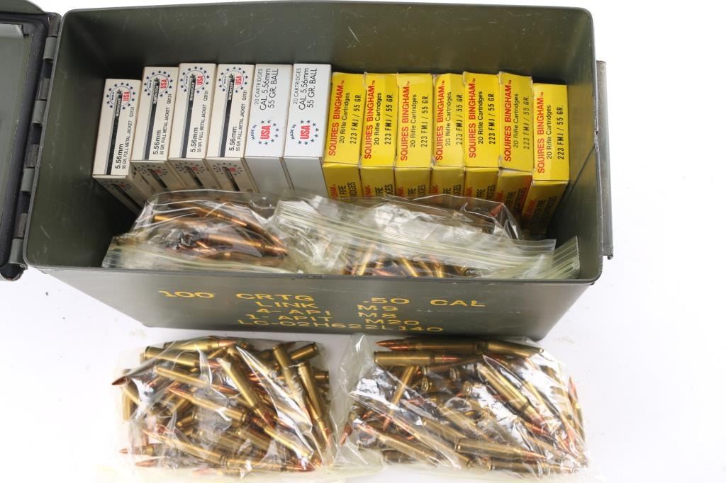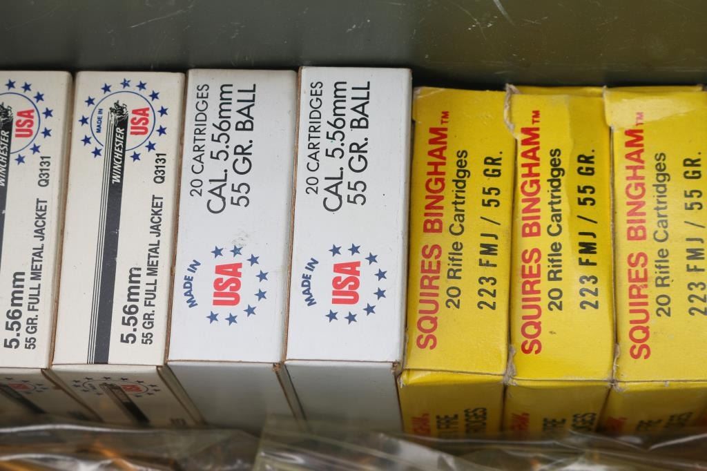 Approx. 560 rounds of 5.56 & .223 factory new ammunition. Winchester 55 Gr. FMJ & SP, Squires Bingham 55 Gr. FMJ. Some Lake City FMJ. In factory boxes and zip lock bags, all in metal ammo can.
