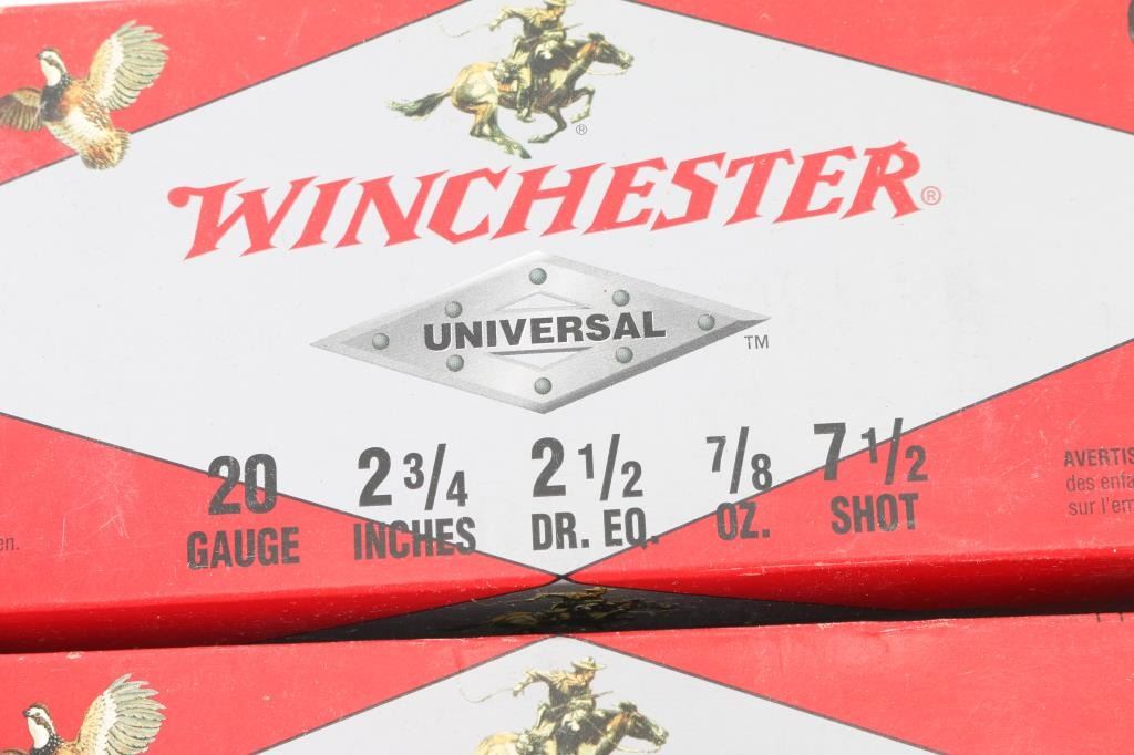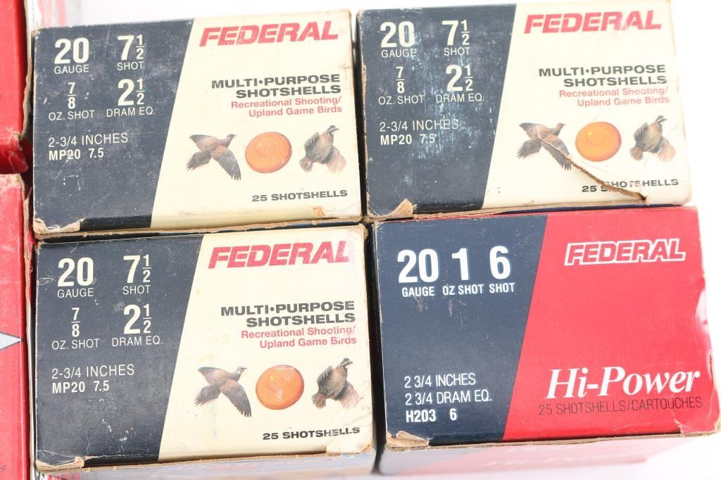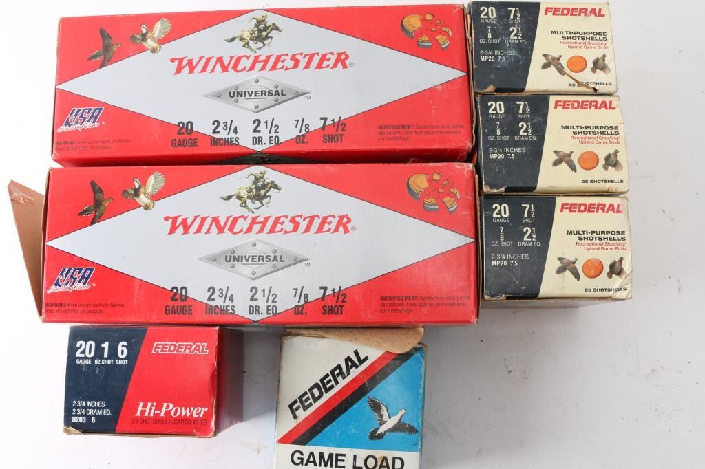 Approx. 325 rounds of 20 Gauge factory new ammunition. 200 rds Winchester 2 3/4" 7 1/2 shot, 125 rds Federal 2 3/4" 6 & 71/2 shot. All in factory boxes.