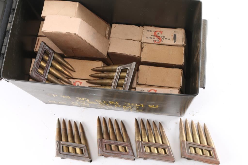 Approx. 240 rounds of German 8mm Mauser factory new ammunition. Boxes have bird and Swastika printed on label & some dated 1938, 10 rd factory boxes, 5 rds per clip. All in metal ammo can.