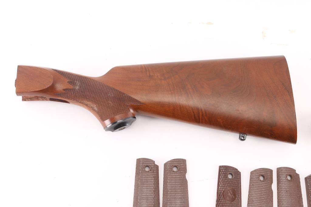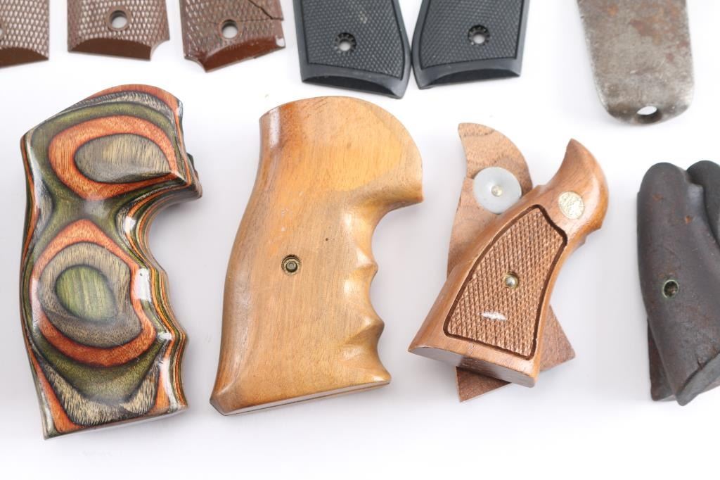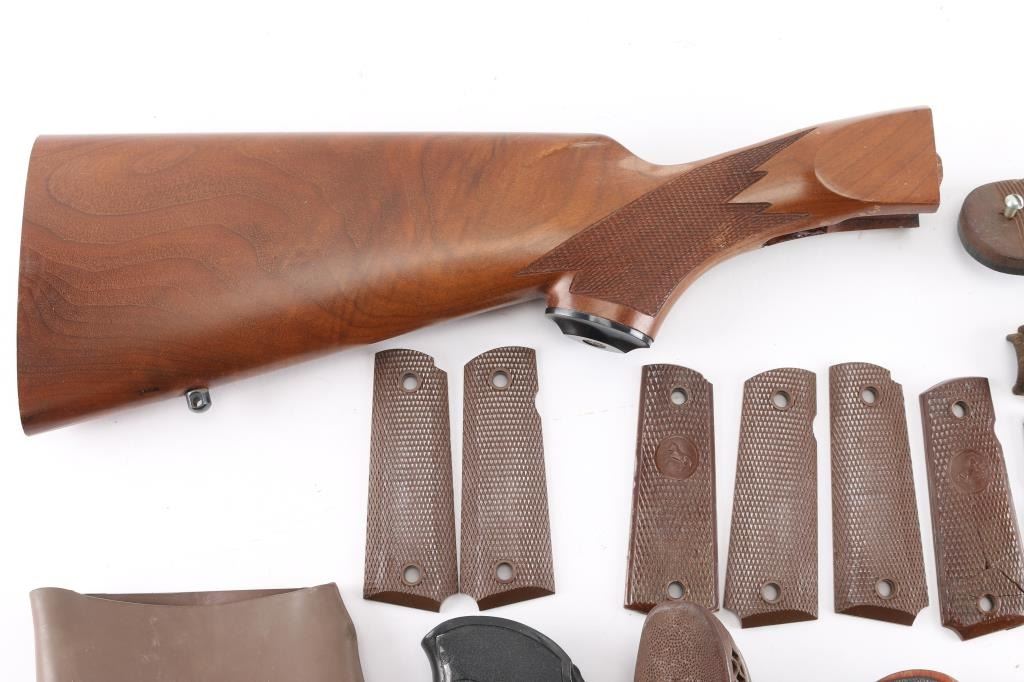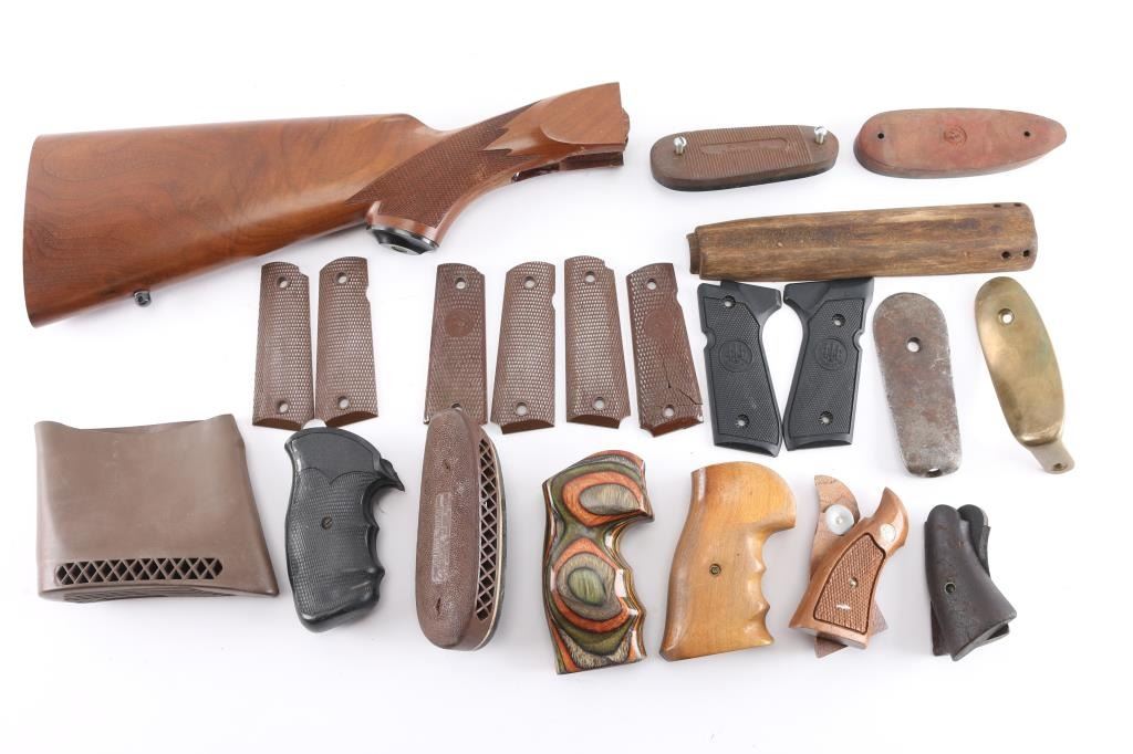 includes Smith & Wesson wood grips w/gold medallions; 3 pairs of Colt 1911 A1's (1 panel is cracked); Pachmayr black rubber revolver; Beretta 92 black plastic & others. Multiple butt pads from Pachmayr, Ruger & 2 unknown, possibly antique rifle metal butt plates. A brown wooden Ruger checkered rifle stock & M1 Carbine wooden top forend.