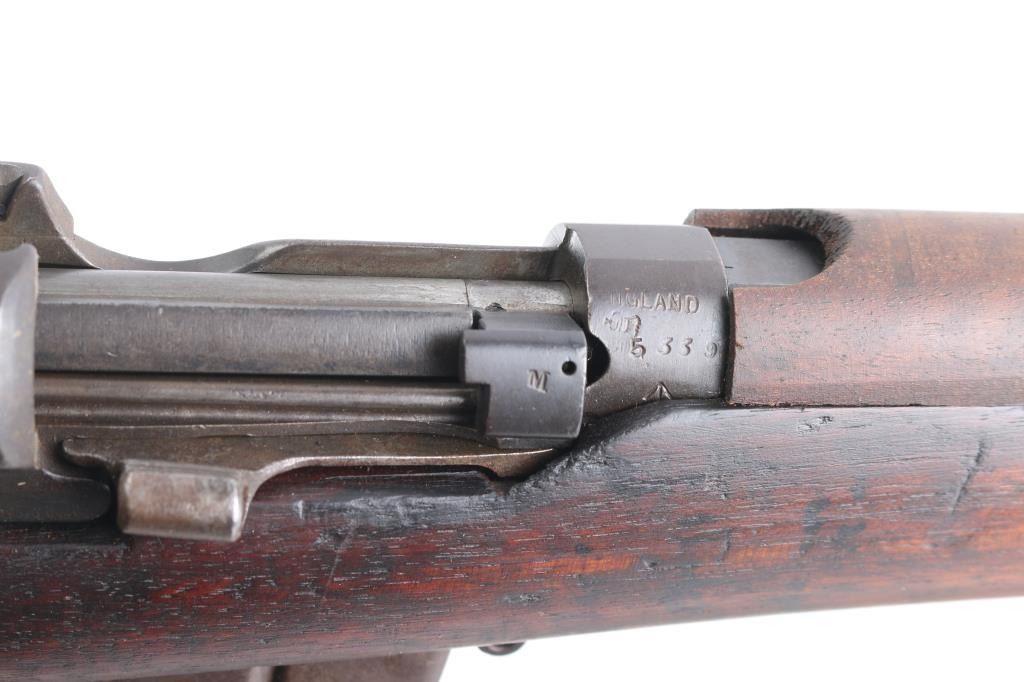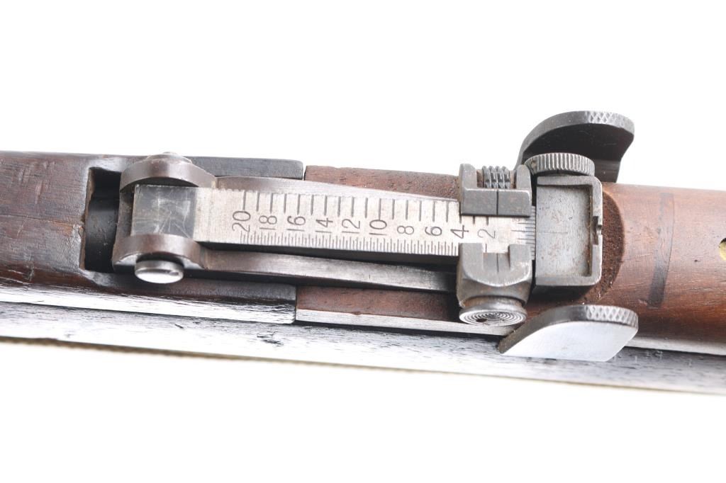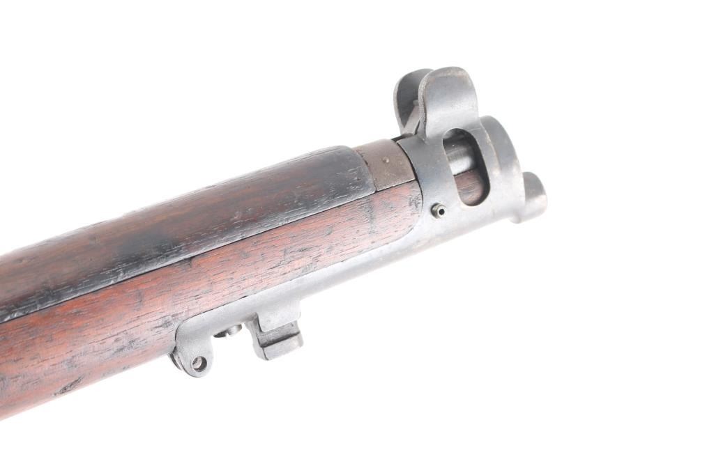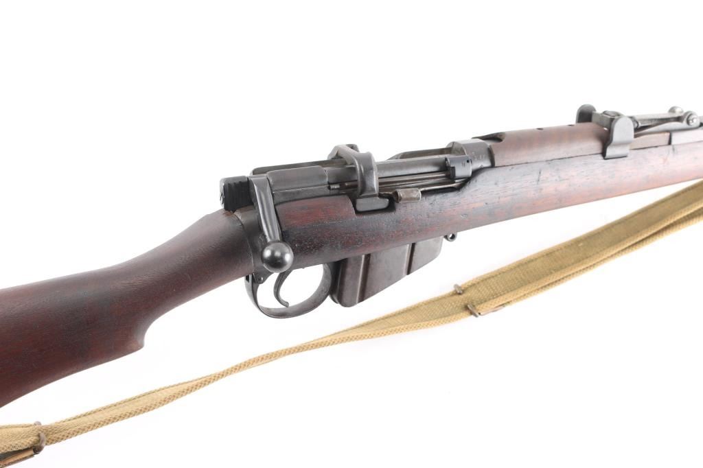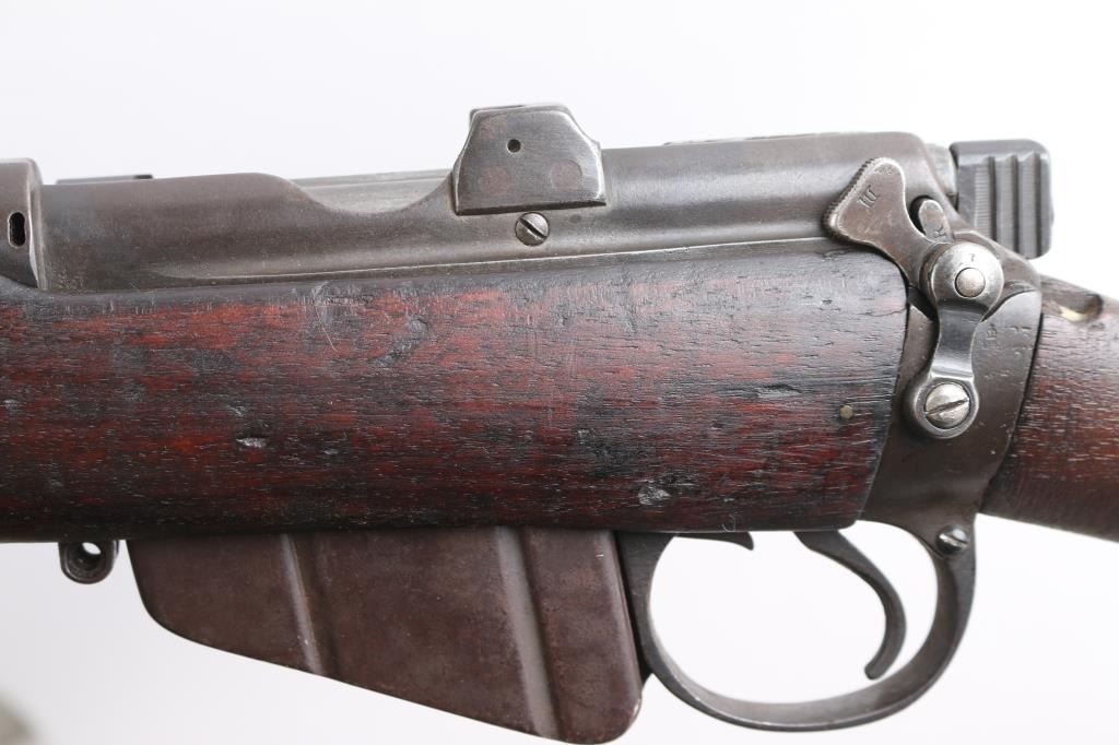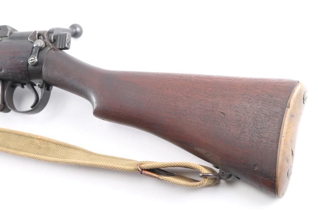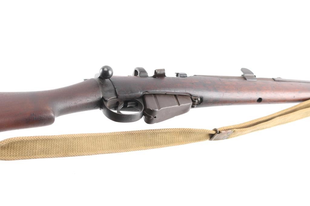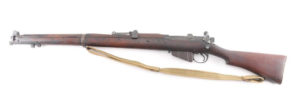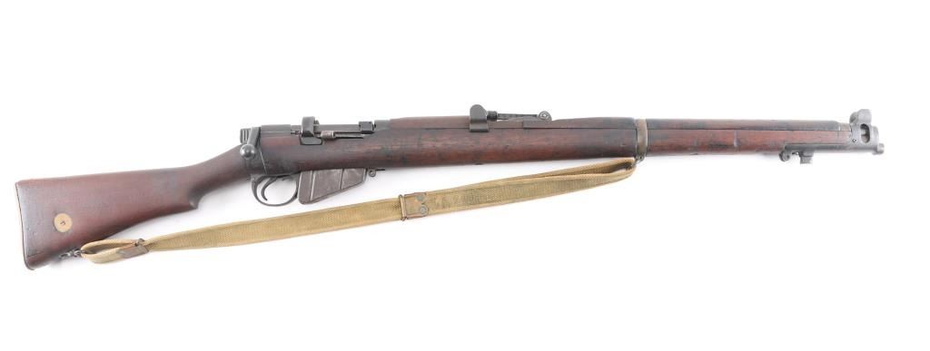 This is a nice example of a Birmingham Small Arms SHT LE Mk III Rifle, issued to the British military during WW1. There are British proofs throughout. Stock collar marked Crown over G.R, stands for George Rex, referencing King George V. 1914/Sht LE/III. This rifle also retains its original magazine cutoff. This feature, which allows for the loading of single rounds in the chamber while keeping the 10 rounds in the magazine untouched, was eventually eliminated from all of these rifles entirely as being unnecessary, so finding an example that still has one intact is uncommon. Slotted charging bridge on receiver. 25" barrel, one band, metal nose cap incorporating protected front blade sight, sling swivel, bayonet lug, tangent type rear sight numbered 1-20, full length stock with brass disc unmarked, brass butt plate with trapdoor, retains most of blue finish, with friction wear on the bolt, handling wear, turning a brown patina in places, bore is very good/bright, strong rifling, action is smooth, wood is good/sound with three old arsenal wood plug repairs on the comb, toe, and under the rear right receiver. Right chamber stamped "England" over the serial number. Correct green web sling attached marked "H, G, & R, Ltd, 1917. No import marks.