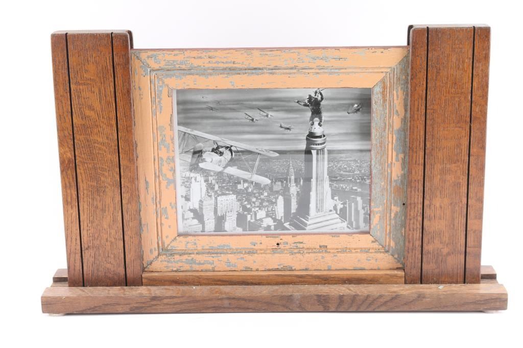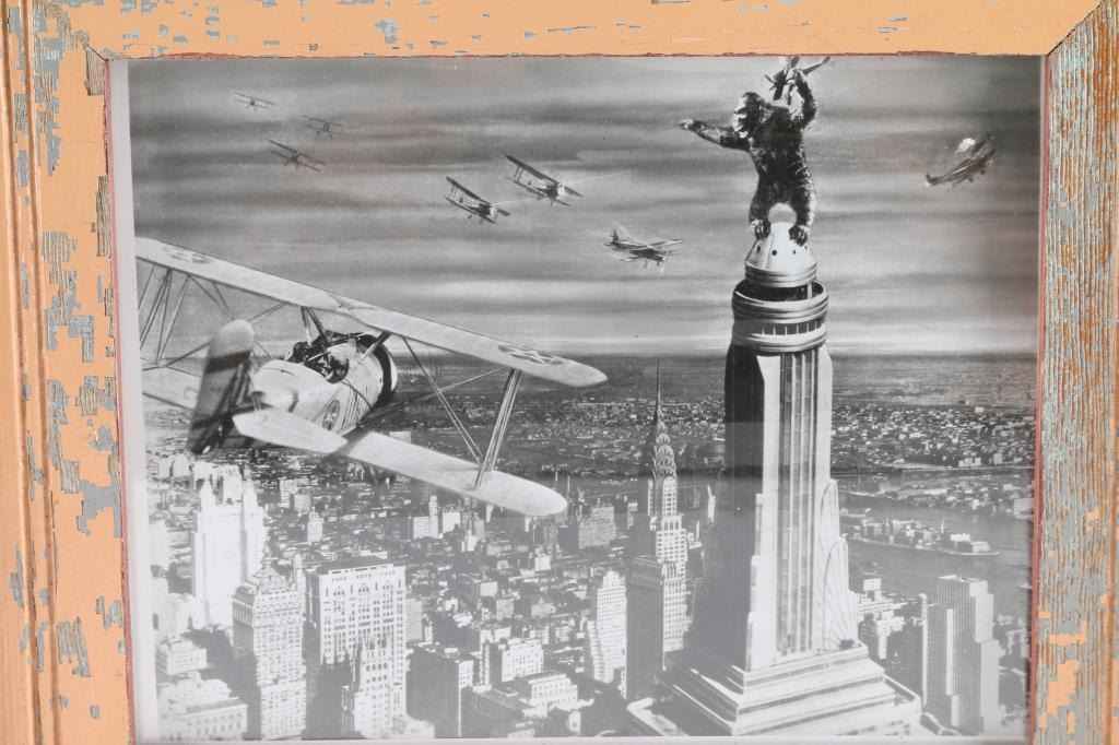Still photo of King Kong fighting biplanes on top of the Empire State Building from the Iconic Golden Age of Movie starring Faye Ray in 1930's. Great custom art deco style "window" frame. Photo measures 9 1/2" wide x 7 1/2" tall. Overall exterior measures 23" long x 4" deep x 14" high.