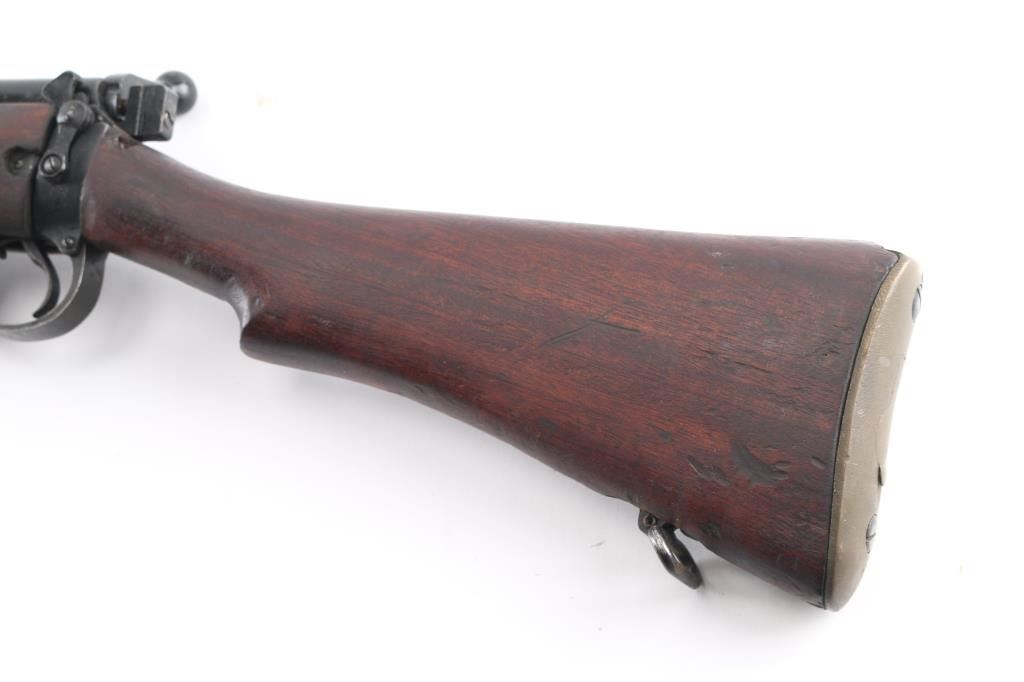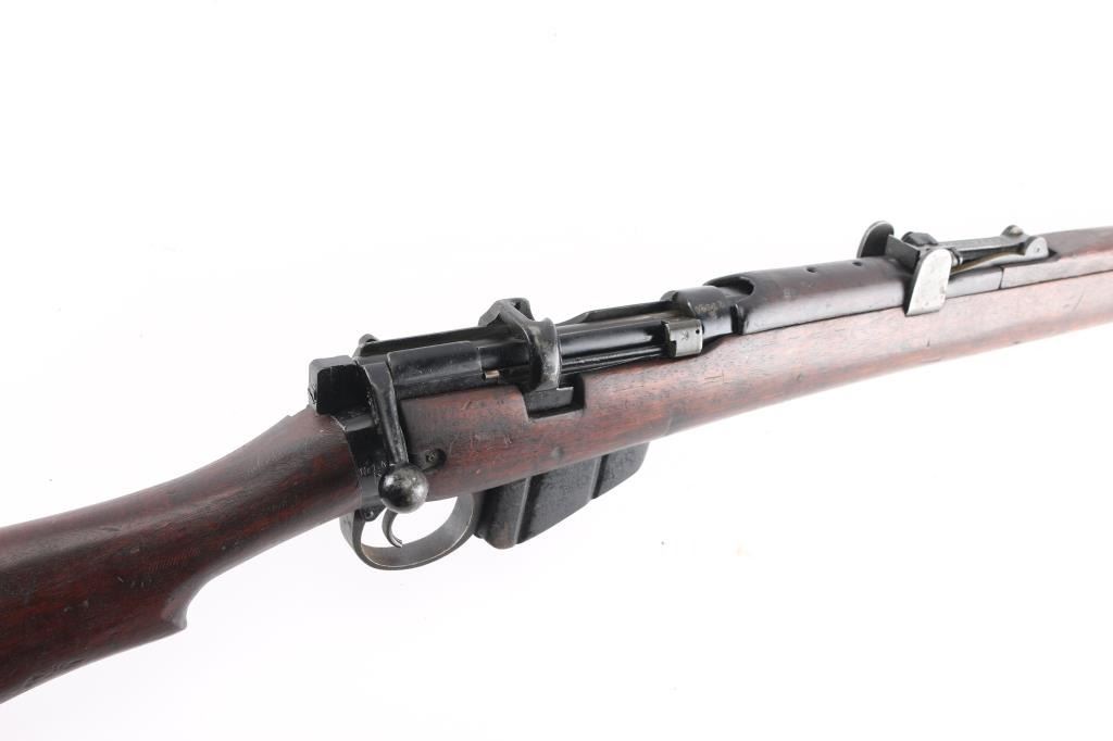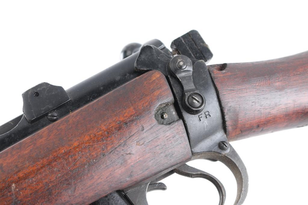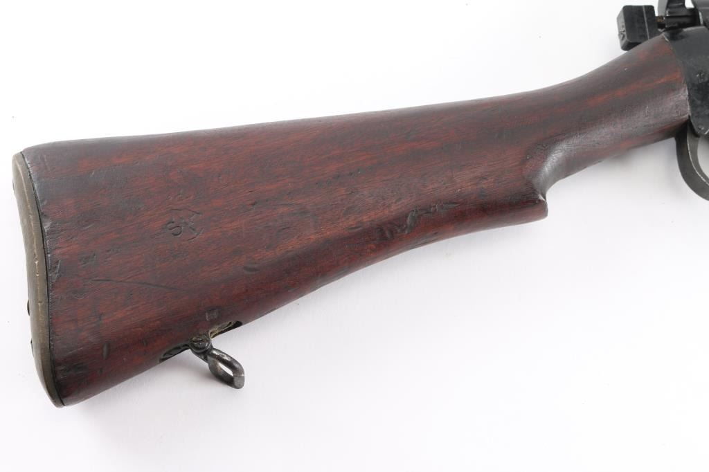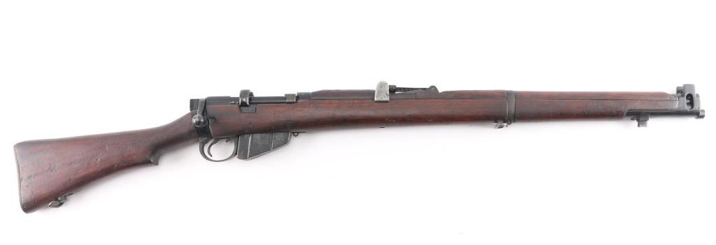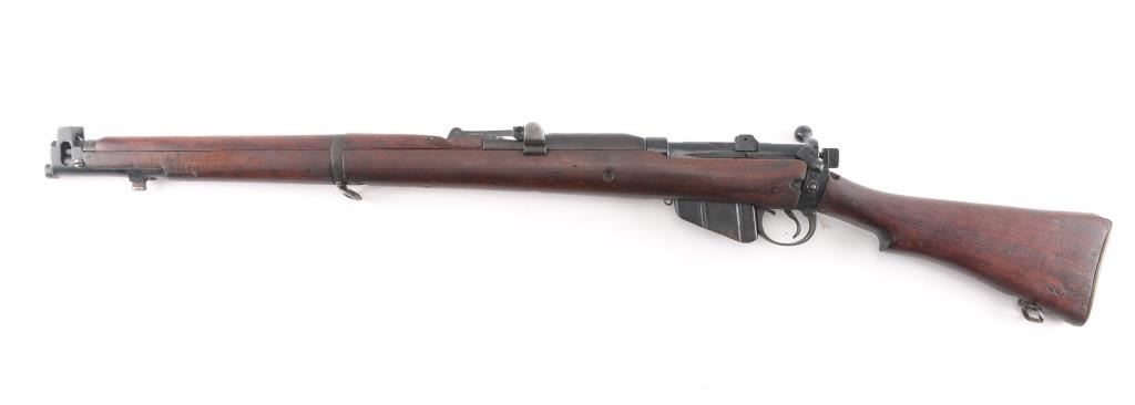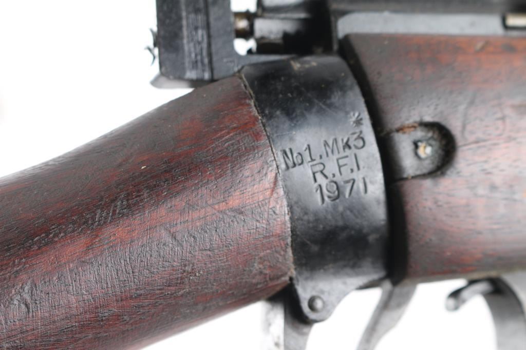 Indian military magazine fed bolt action service rifle chambered in .303 British, manufactured circa 1971 at Ishapore. Features a blued finish, 25.2" barrel, raised patridge front sight, shrouded leaf type rear sight graduated to 2,000 yards, metal nosecap with bayonet lug,no provision for piling swivel & protective front sight ears, single barrel band, serrated trigger, detachable 10 round magazine, manual safety on the left side of the receiver, charge loading bridge on the receiver, smooth full-length wood hand guard & forend and straight grip shoulder stock, brass trapdoor buttplate. Matching serial numbers are found on the receiver, bolt handle, rear sight, mismatched nose cap. The right side of the butt socket is marked "No.1 Mk 3* R.F.I. 1971". Rifle retains approximately 80% of its arsenal black painted finish showing handling marks, thinning, edge wear. Action is smooth, the bore is excellent/bright, wood is good/sound with minor scratches/dings. Butt stock stamped "SA", (Small Arms, Ishapore) No import marks.