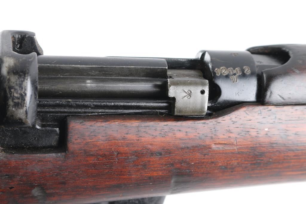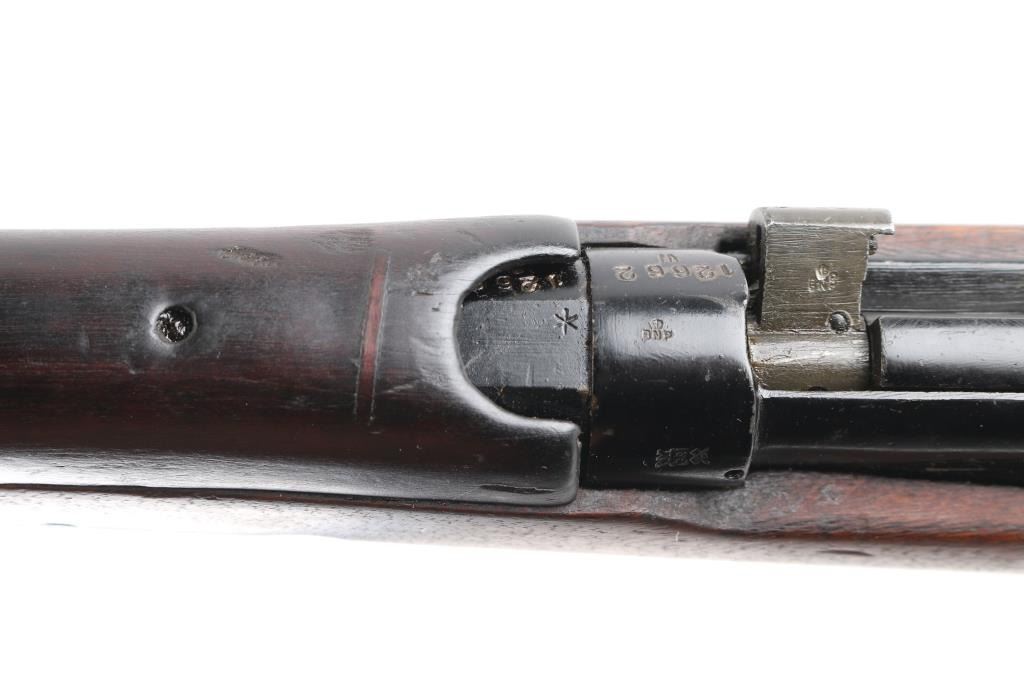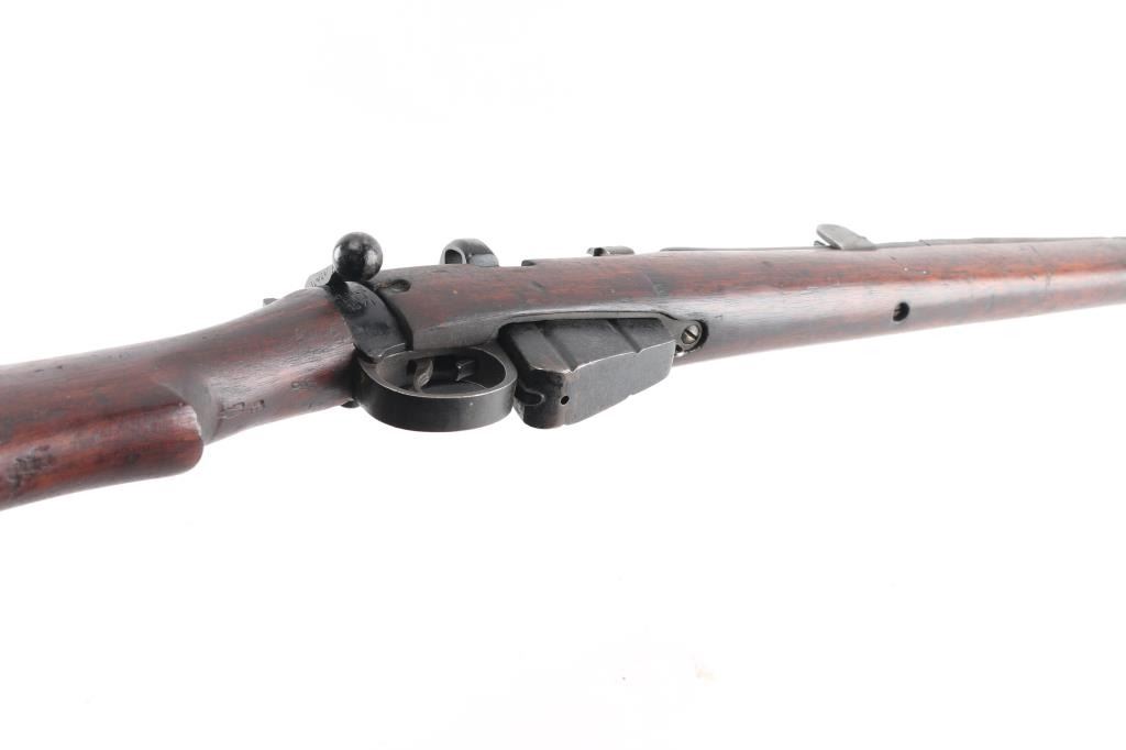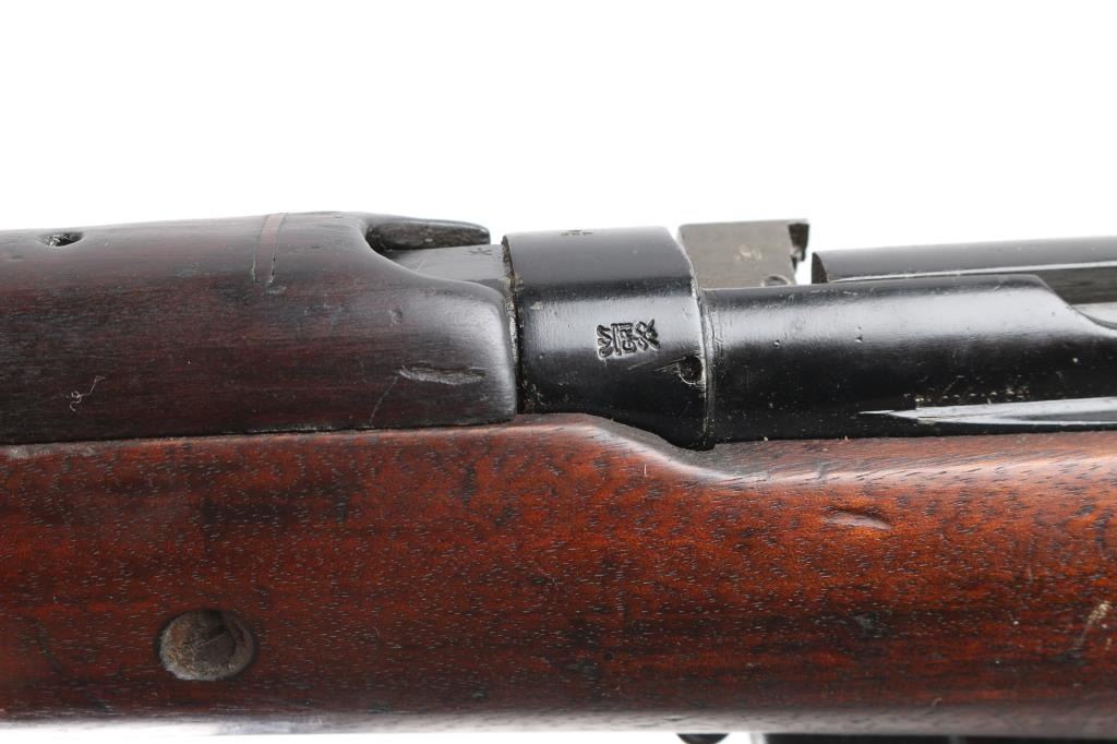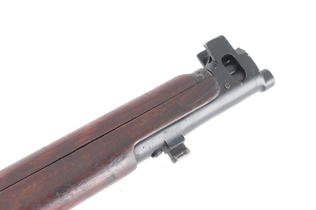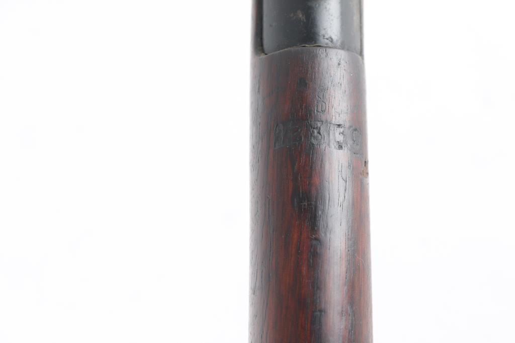Indian military magazine fed bolt action service rifle chambered in .303 British, manufactured circa 1971 at Ishapore. Features a blued finish, 25.2" barrel, raised patridge front sight, shrouded leaf type rear sight graduated to 2,000 yards, metal nosecap with bayonet lug,no provision for piling swivel & protective front sight ears, single barrel band, serrated trigger, detachable 10 round magazine, manual safety on the left side of the receiver, charge loading bridge on the receiver, smooth full-length wood hand guard & forend and straight grip shoulder stock, brass trapdoor buttplate. Matching serial numbers are found on the receiver, bolt handle, rear sight, mismatched nose cap. The right side of the butt socket is marked "No.1 Mk 3* R.F.I. 1971". Rifle retains approximately 80% of its arsenal black painted finish showing handling marks, thinning, edge wear. Action is smooth, the bore is excellent/bright, wood is good/sound with minor scratches/dings. Butt stock stamped "SA", (Small Arms, Ishapore) No import marks.