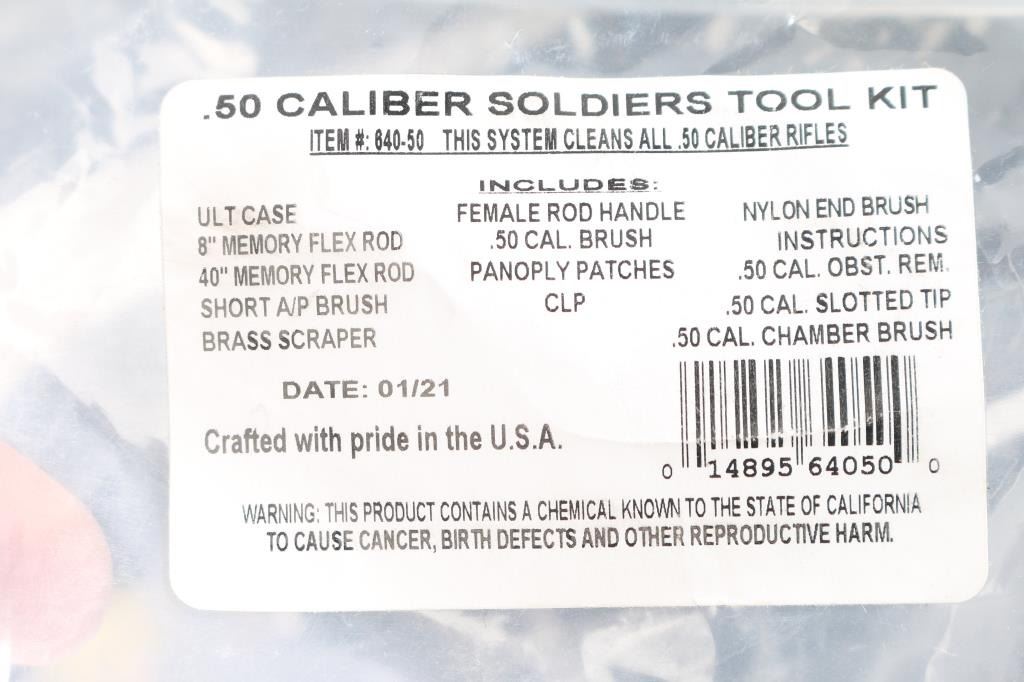 Includes : Case, 8" Memory Flex Rod, 40" Memory Flex Rod, Short A/P Brush, Brass Scraper, Female Rod Handle, .50 Cal Brush, Panoply Patches, CLP, Nylon End Brush, Instructions, .50 Cal Obst. Rem., .50 Cal Slotted Tip and .50 Cal Cleaning brush.
