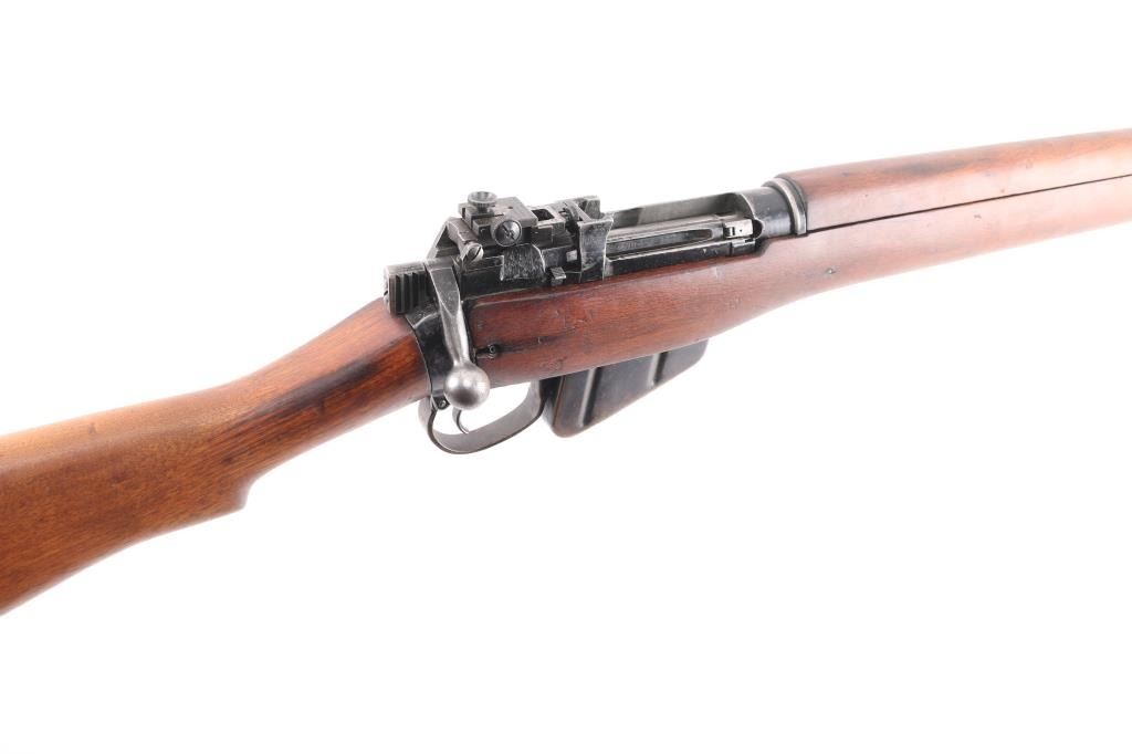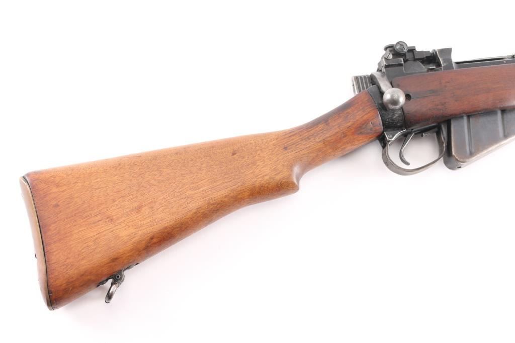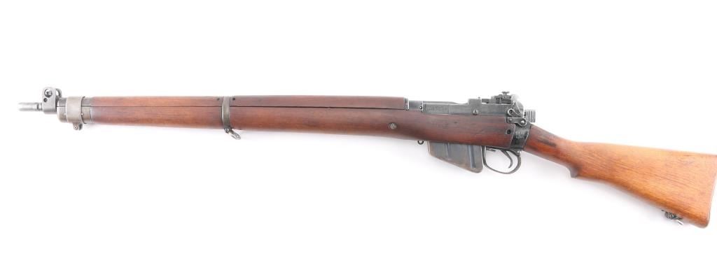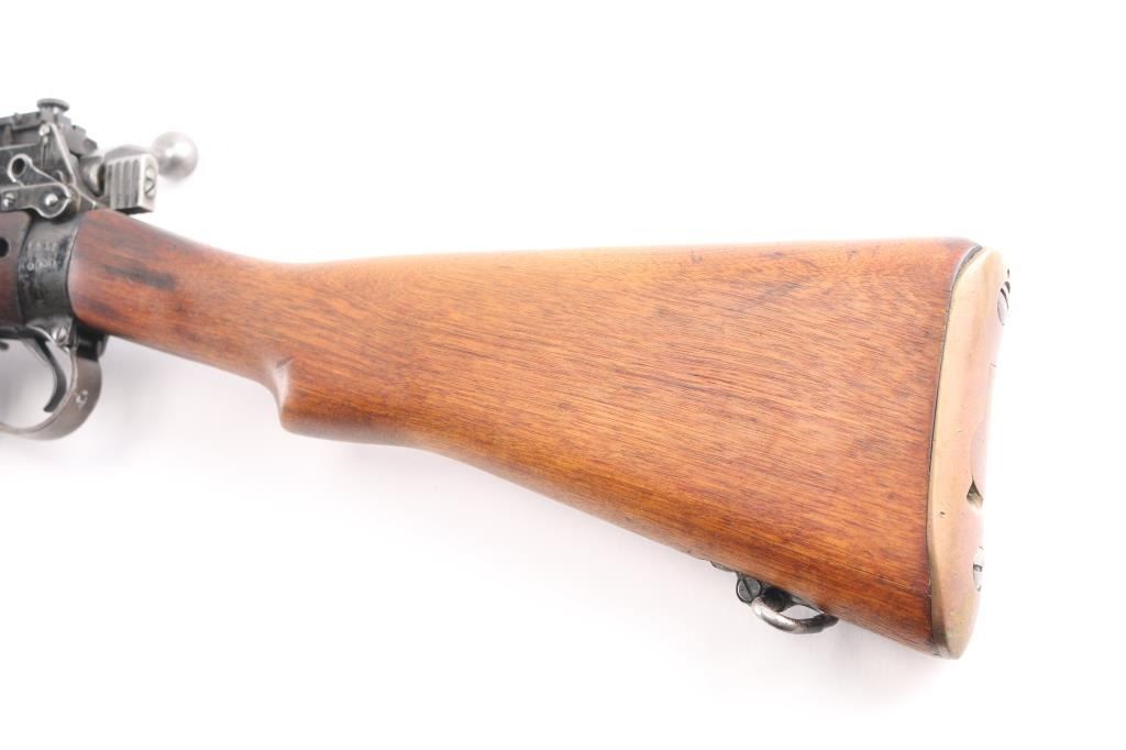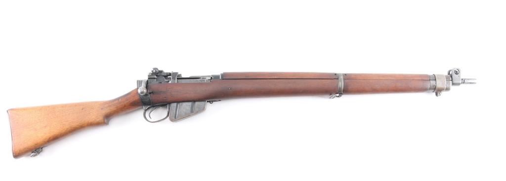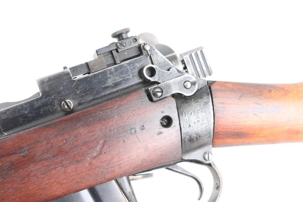 British military bolt action rifle dated 1955, imported by CAI, St Albans VT. (Left Receiver) Features black finished metal, two piece straight gripped stock with full length handguards, brass buttplate with trapdoor, 25" barrel, bayonet lug, protected blade front sight, rear peep sight with flip-up screw adjustable elevation ladder, sling swivels, detachable 10 round magazine, manual safety. Dated 1942, serial number matches on the receiver, bolt & butt socket. Bore is fair, strong rifling, frosting in the grooves. Black painted finish is about 60% with scratches/edge wear, handling loss. Some light pitting on the magazine. Action is smooth, wood is very good/sound. Butt stocks finish is lighter than the rest of the rifle.