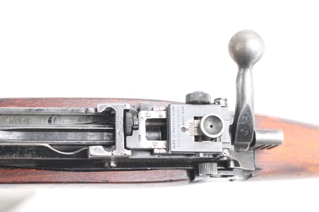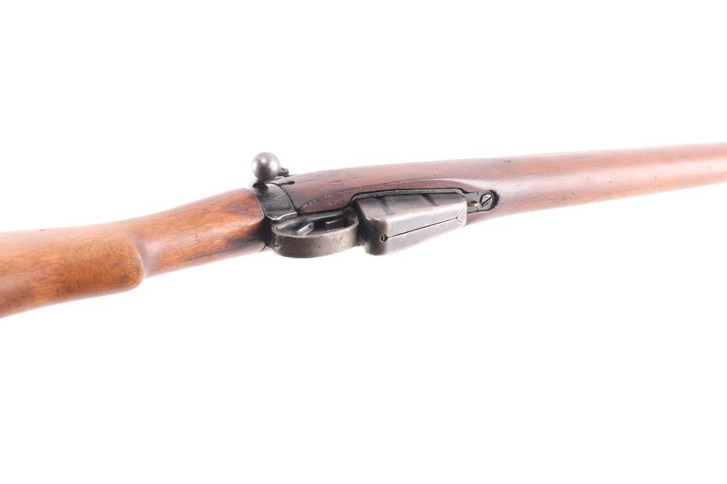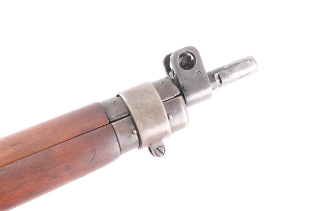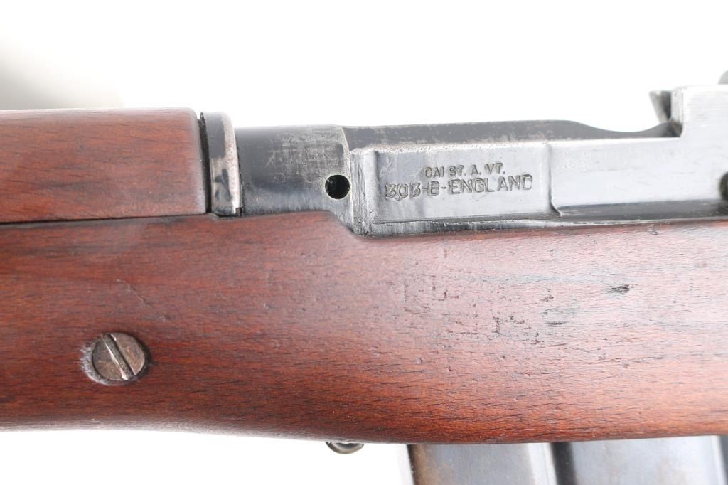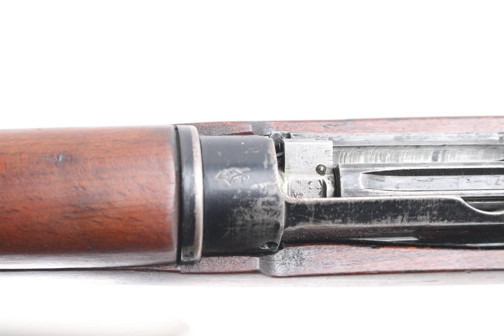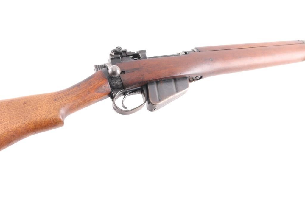 British military bolt action rifle dated 1955, imported by CAI, St Albans VT. (Left Receiver) Features black finished metal, two piece straight gripped stock with full length handguards, brass buttplate with trapdoor, 25" barrel, bayonet lug, protected blade front sight, rear peep sight with flip-up screw adjustable elevation ladder, sling swivels, detachable 10 round magazine, manual safety. Dated 1942, serial number matches on the receiver, bolt & butt socket. Bore is fair, strong rifling, frosting in the grooves. Black painted finish is about 60% with scratches/edge wear, handling loss. Some light pitting on the magazine. Action is smooth, wood is very good/sound. Butt stocks finish is lighter than the rest of the rifle.