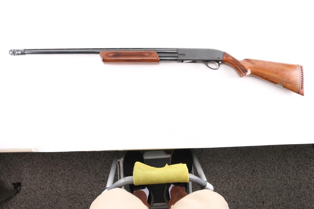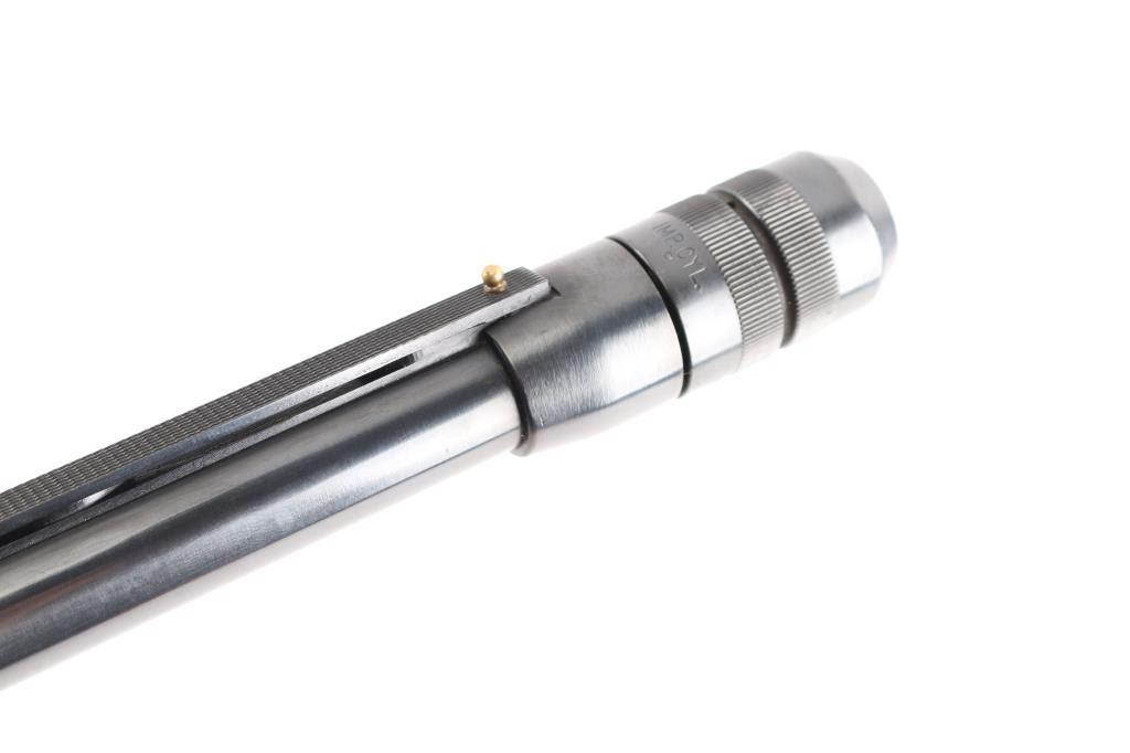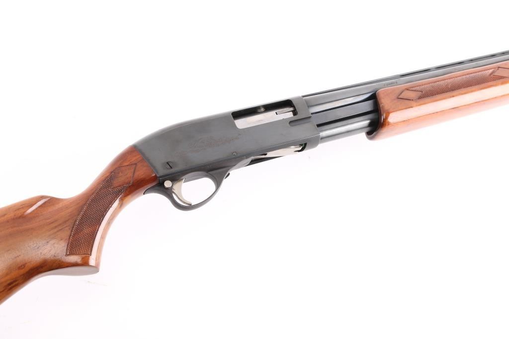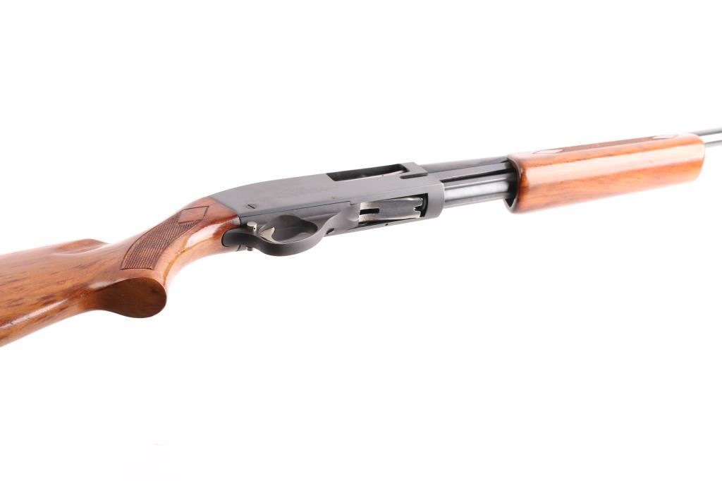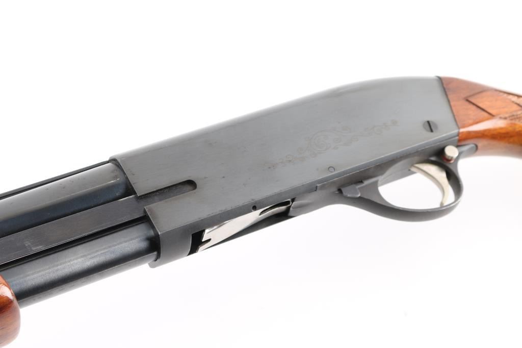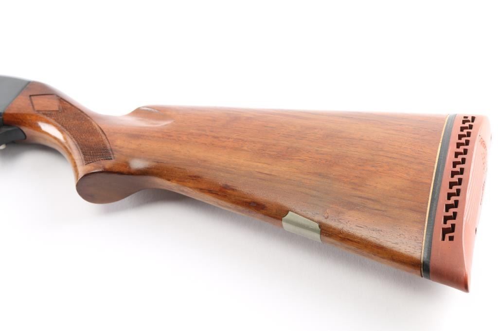 Made by High Standard, pump action 20 Ga. shotgun, 27" vented-rib blued finished barrel with single brass bead sight, chambered for 3" shells. Retains 90% finish with a faint scratch on left rear of receiver, two small scratches on right side of receiver above take down screw, shows slight edge wear on trigger guard and some rust on shell carrier. Checkered wood forend and butt stock grip is very good with little to no scratches or dents. Bore is very good and bright.
