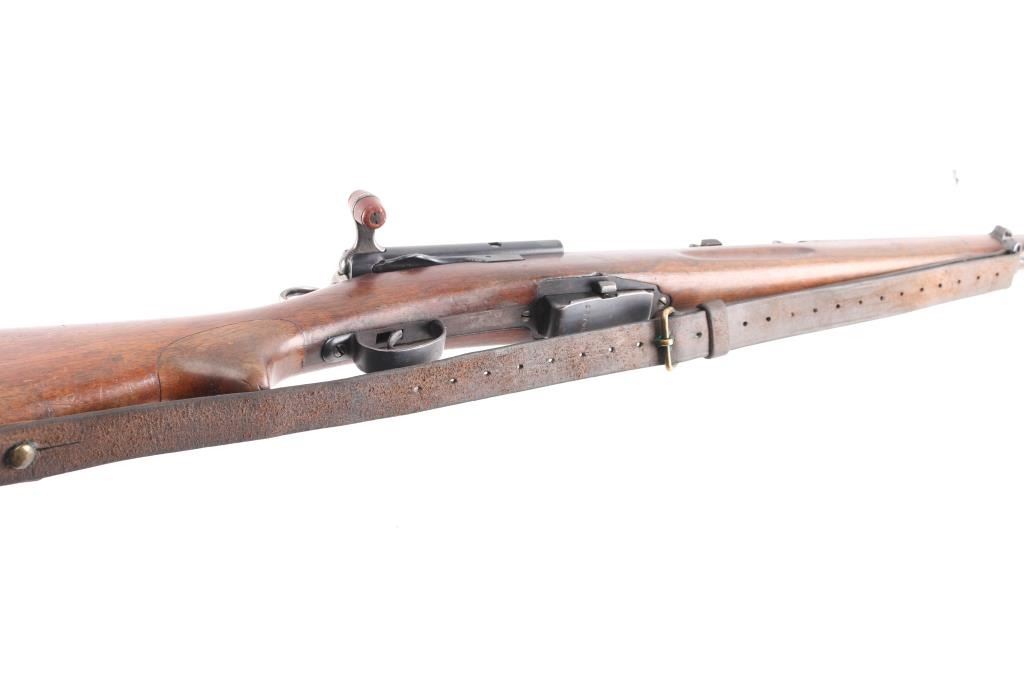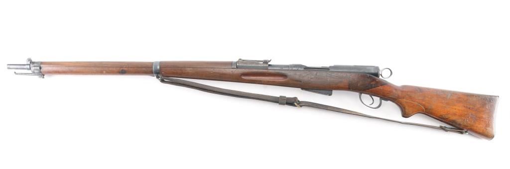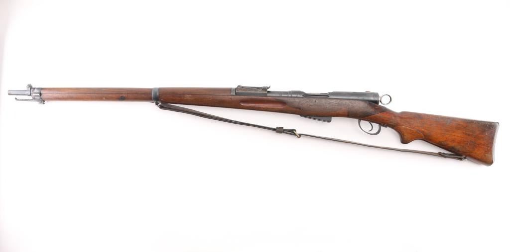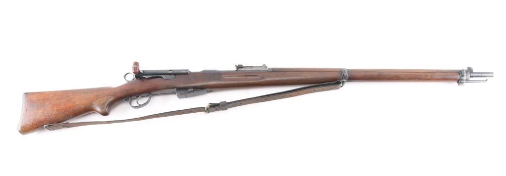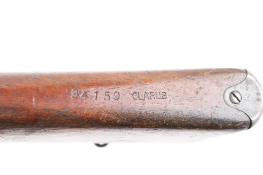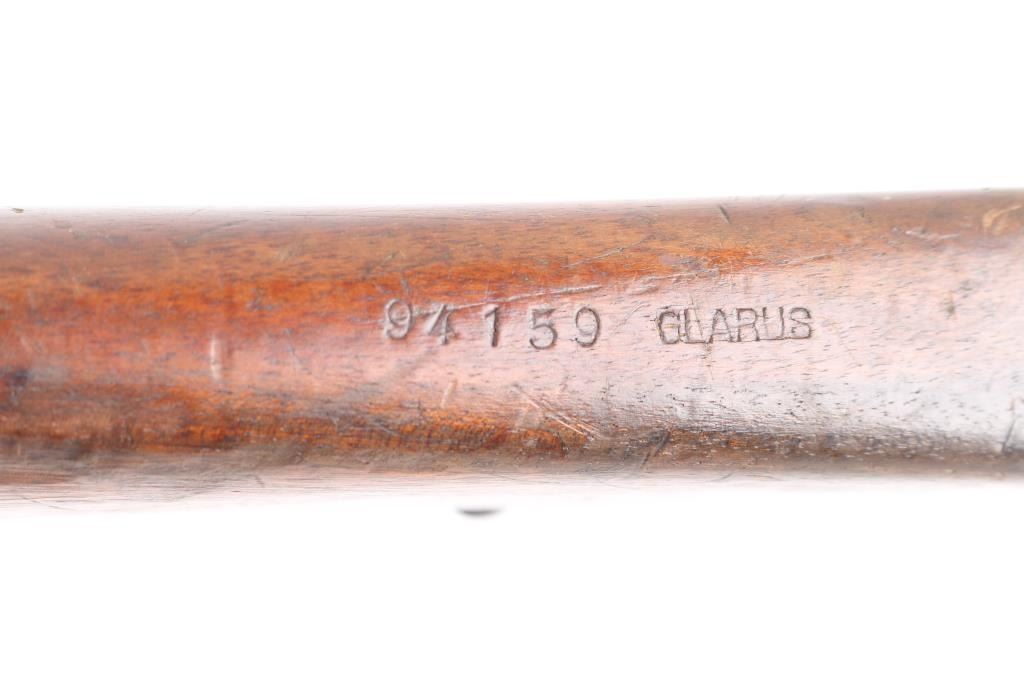 "Schmidt Rubin" Swiss military 1896 pattern magazine fed straight-pull bolt action service rifle chambered in 7.5x55mm. Manufactured circa 1900 and modified to 1911 configuration between 1911-1920. No importer marks observed. Features a blued finish, 30.7" barrel, dovetailed patridge front sight, leaf style rear sight graduated to 2,000 meters, two barrel bands with a stacking hook & bayonet lug on the front band, smooth trigger, detachable 6 round magazine, synthetic red "beer barrel" shaped bolt handle, cocking ring, dark leather sling, smooth wood handguard and full-length shoulder stock with finger grooved forend, inlet pistol grip & smooth metal buttplate. Serial numbers match on the receiver, barrel, bolt, magazine and buttplate. The top of the stock is marked "94159" & "GLARUS." Rifle exhibits approximately 60% of it's blued finish showing scattered wear and a small amount of surface rust & dark pitting. Action is sound, the bore appears excellent and the wood stocks are good.