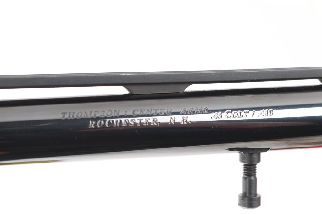 Includes TC 10" barrel chambered in .45 Colt/.410. Blued finish, vent rid with silver bead, and fixed U-notch rear sights, finish, & bore are excellent. In original factory box. Also included is a Bipod barrel attachment, Super 14 swivel/sling set for use with Pachmayr grips still in package, TC combination tool .45/410, still in package, and Duo-Ring quick release mount, in box. All like-new condition.