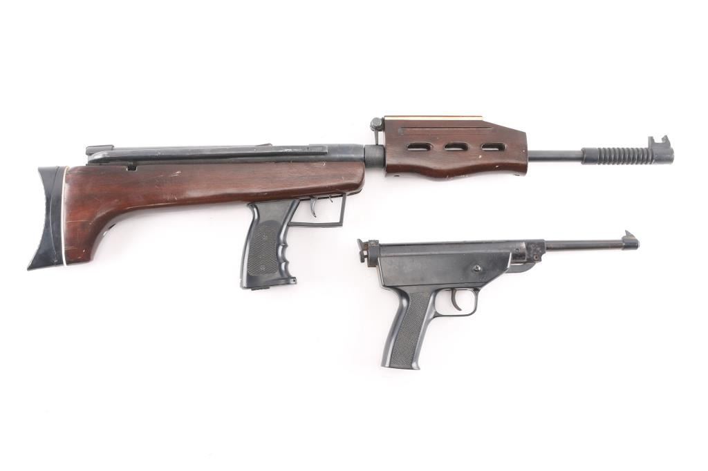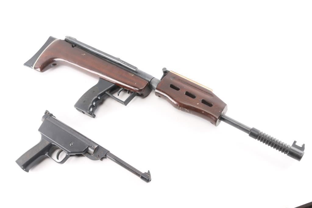 Vintage Chinese Model XS-S2 Pellet Pistol Gun, Black plastic grips,break Barrel, adjustable sights, .177 Cal. Some surface rust. In good working order. Vintage Chinese. .77 Cal. side tension air rifle, inspired by the bull pup. The SNIPER TACTICAL QB57 is a tactical side clamp airgun. The air rifle is equipped with precision drawn barrel and pistol grip. There is a mounting rail on which a rifle scope / red-dot can be mounted. The rifle can also be taken apart in two parts, compartment for pellets in the pistol grip. In good working order, the front sight is broken.