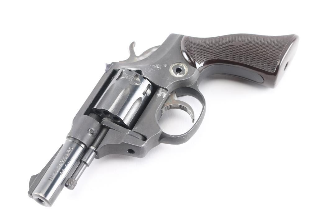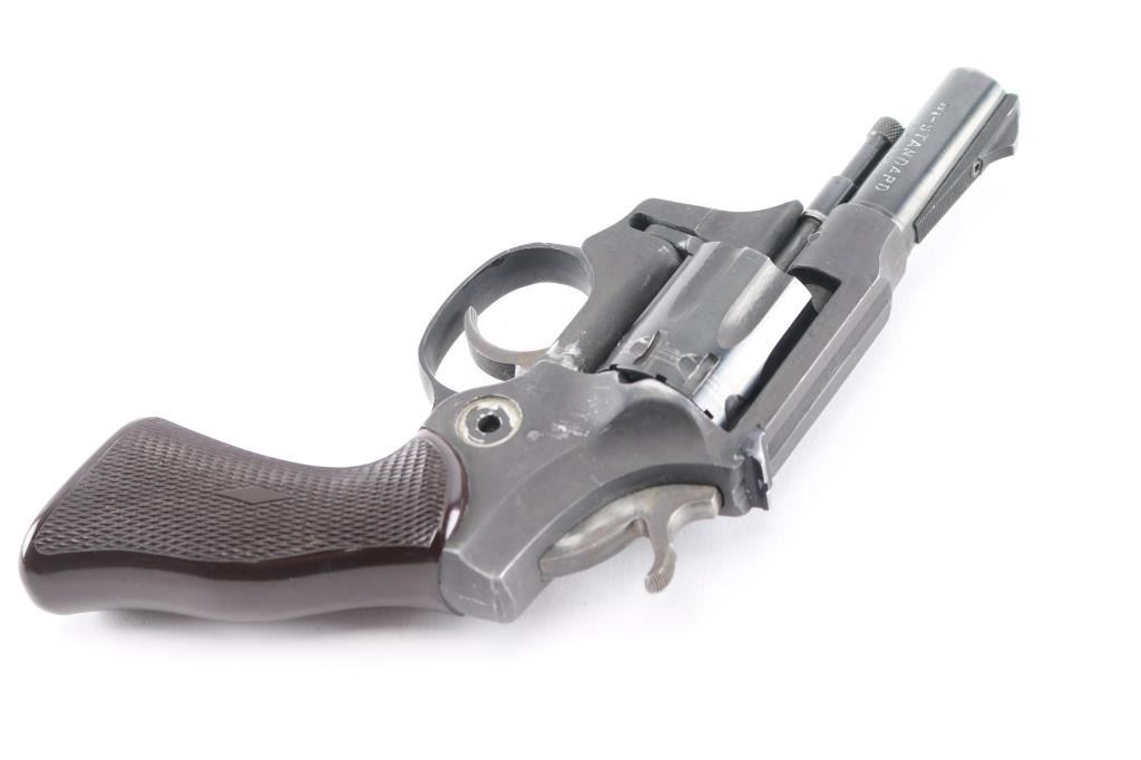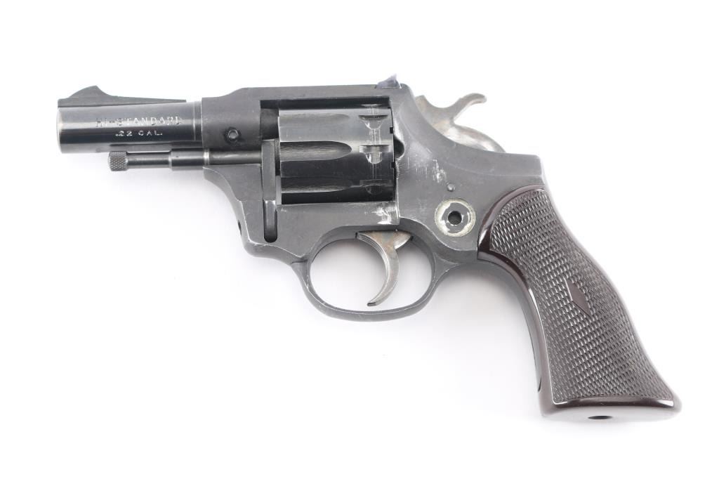 'Sentinel' double/single action rimfire revolver manufactured circa 1955-1960. Features a blued finish, checkered brown plastic grip, fluted 9-shot cylinder, blade front sight, notch rear sight in dovetail, cylinder pin pulls forward to open cylinder. Bore is very good condition and slightly dirty. Retains 85% finish, with scratches & scuffs, edge losses, missing medallion from left side of frame. Grips are very good. Action is smooth.