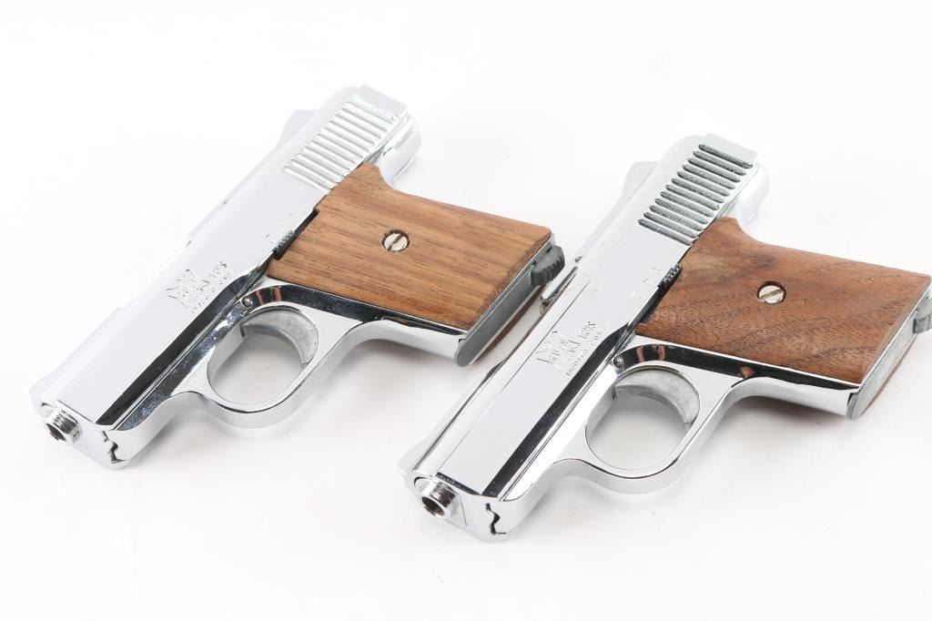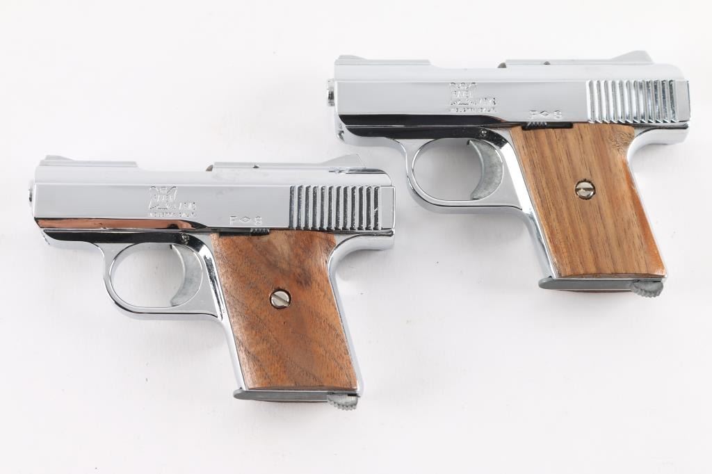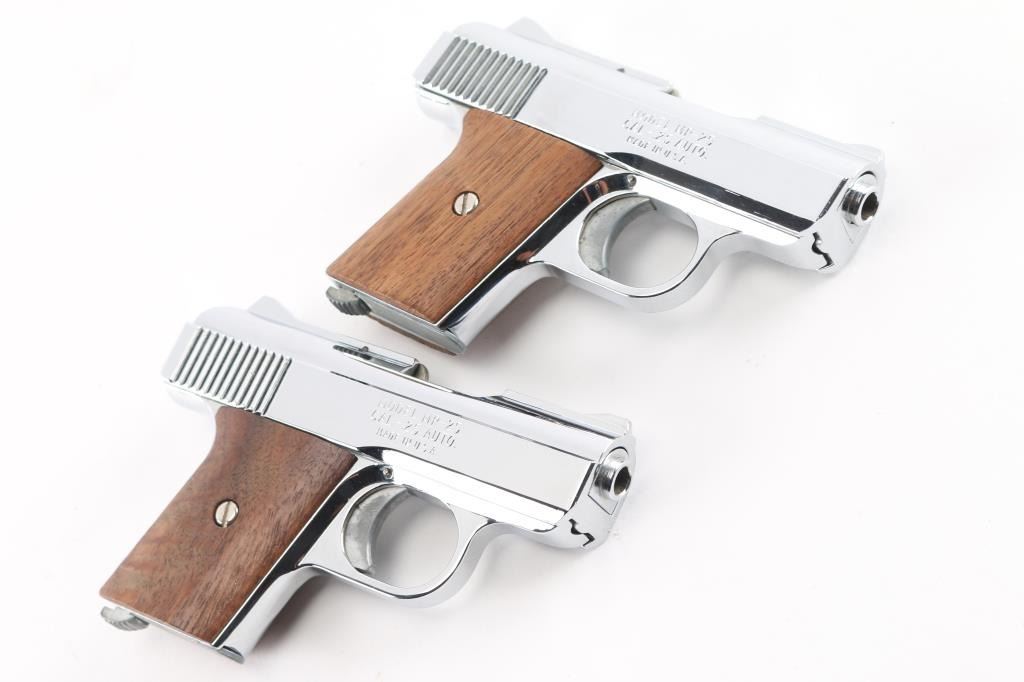 SN: 836454 & 836455 Consecutive Numbered semiautomatic pistols feature 2.4" barrels, fixed sights, chrome plated finish, smooth wood grips, heel magazine releases. Condition is near excellent with few minor handling marks. Each pistol is in factory box with one magazine. One box lid has a damaged corner.
