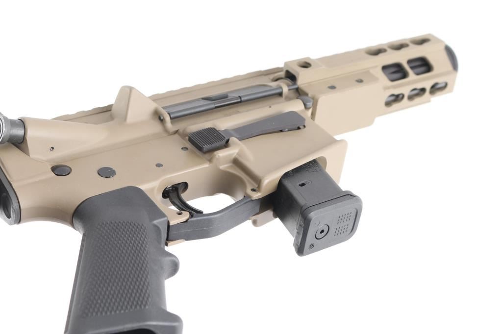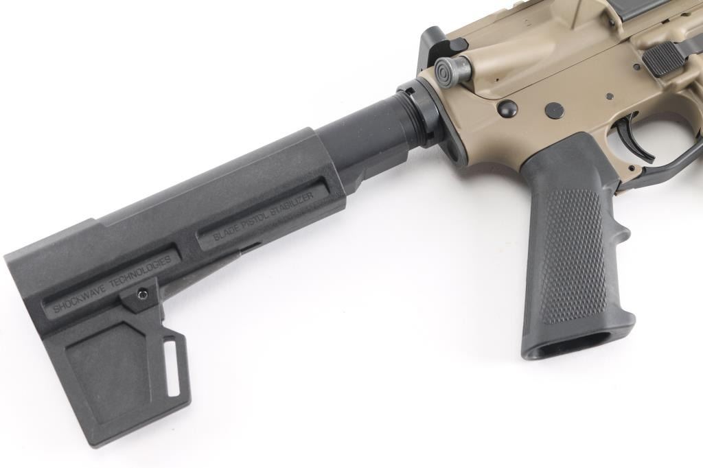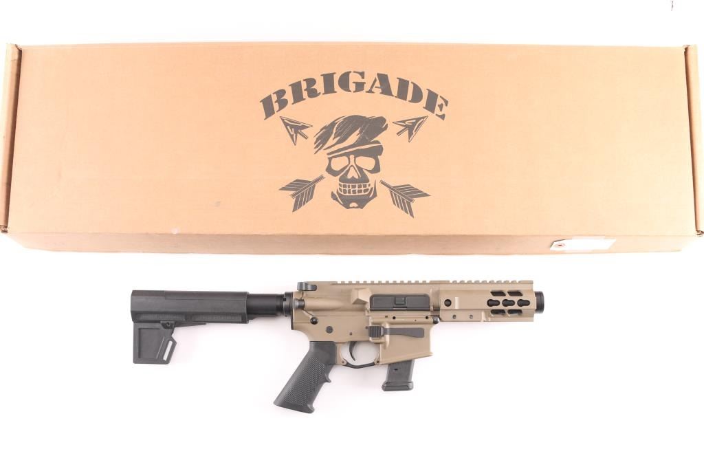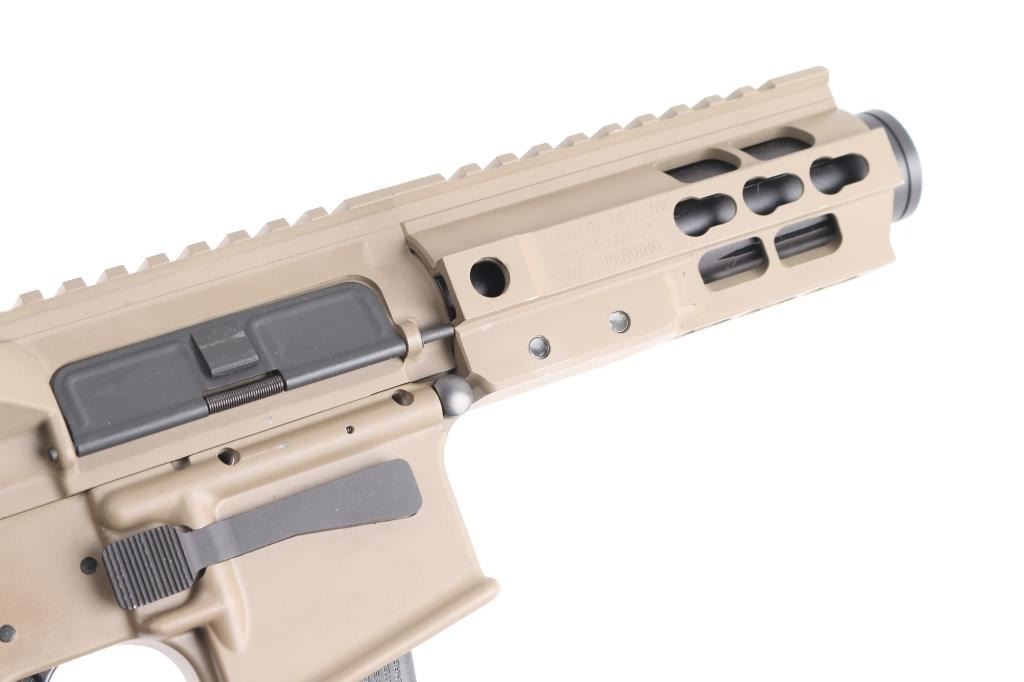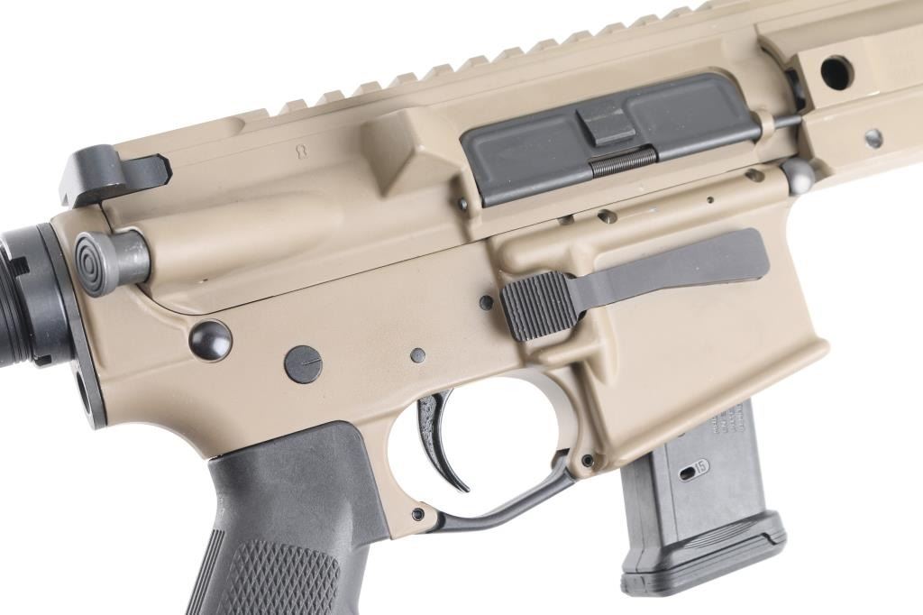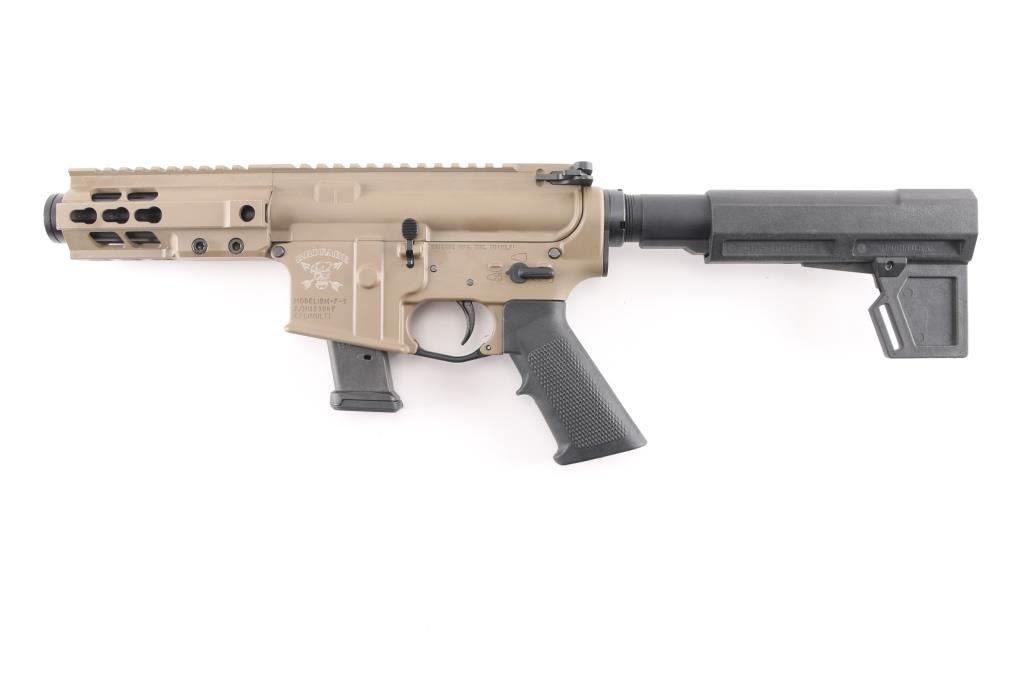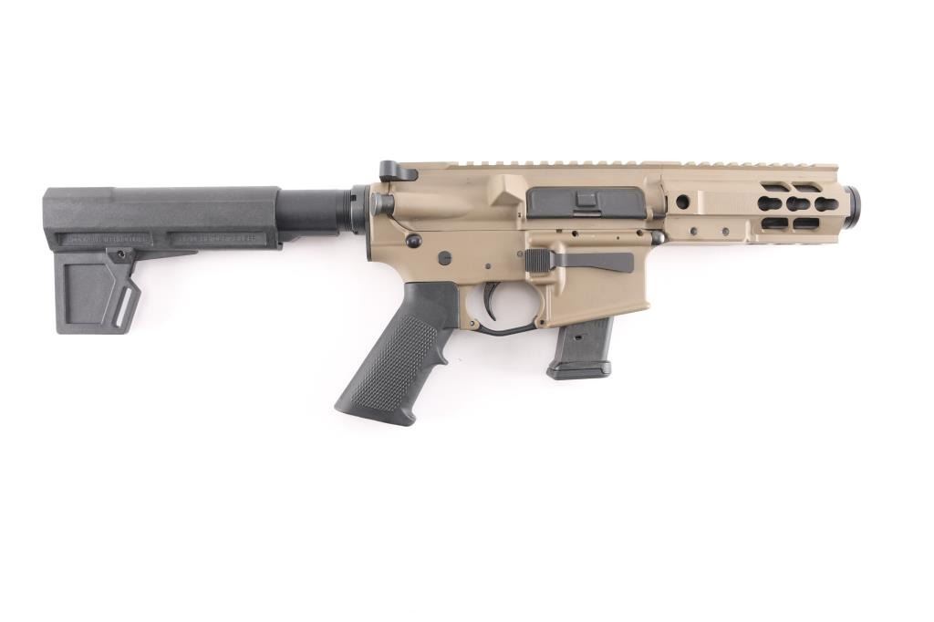 Braced semiautomatic pistol based on the AR15 design, chambered for 9x19mm, using Glock type magazines. Features flat tan/FDE color finished receivers and handguard, matte black on other parts, approx 5.5" barrel, flat top Picatinny rail with no optic provided, large paddle mag release, forward assist & ejection port cover, Shockwave Blade brace, QD swivel sockets and keymod slots in handguard, sling points behind receiver, "mini can" faux suppressor. Bore is pristine. Retains 95% finish with some edge losses & handling marks. Includes factory cardboard box with manual, one PMAG 15 magazine.