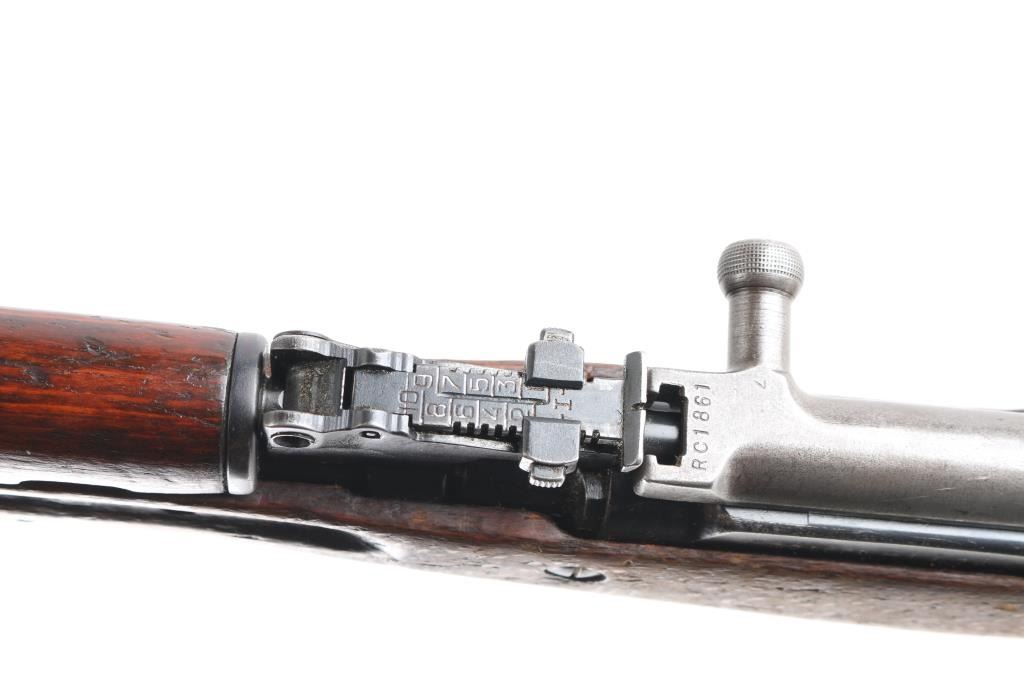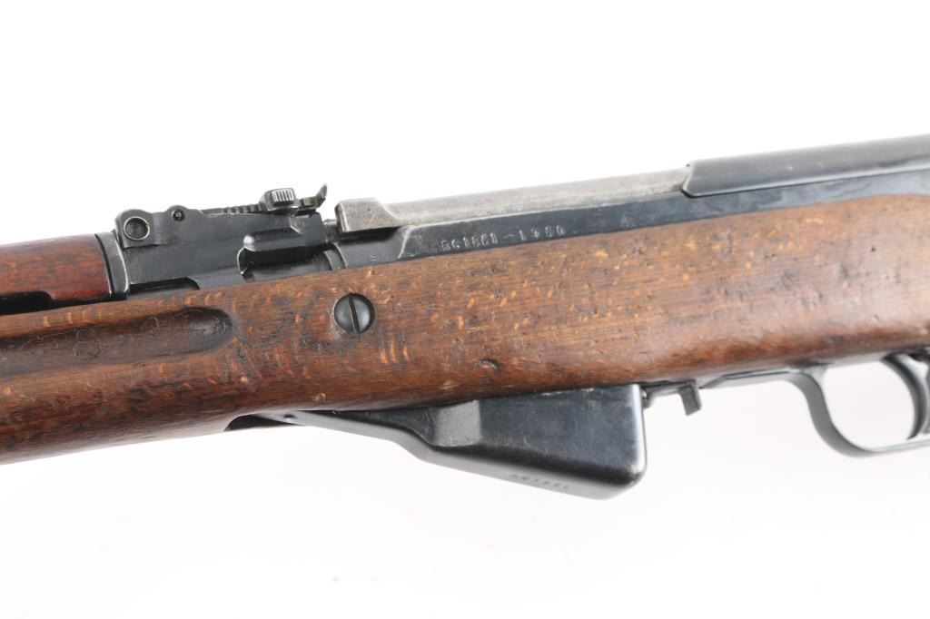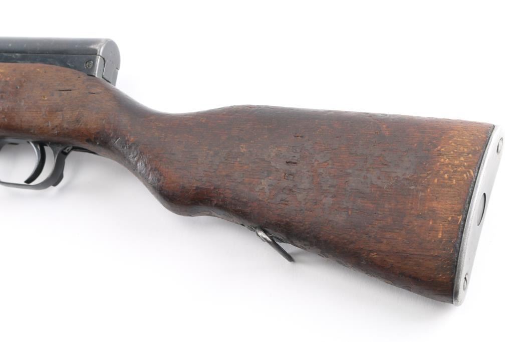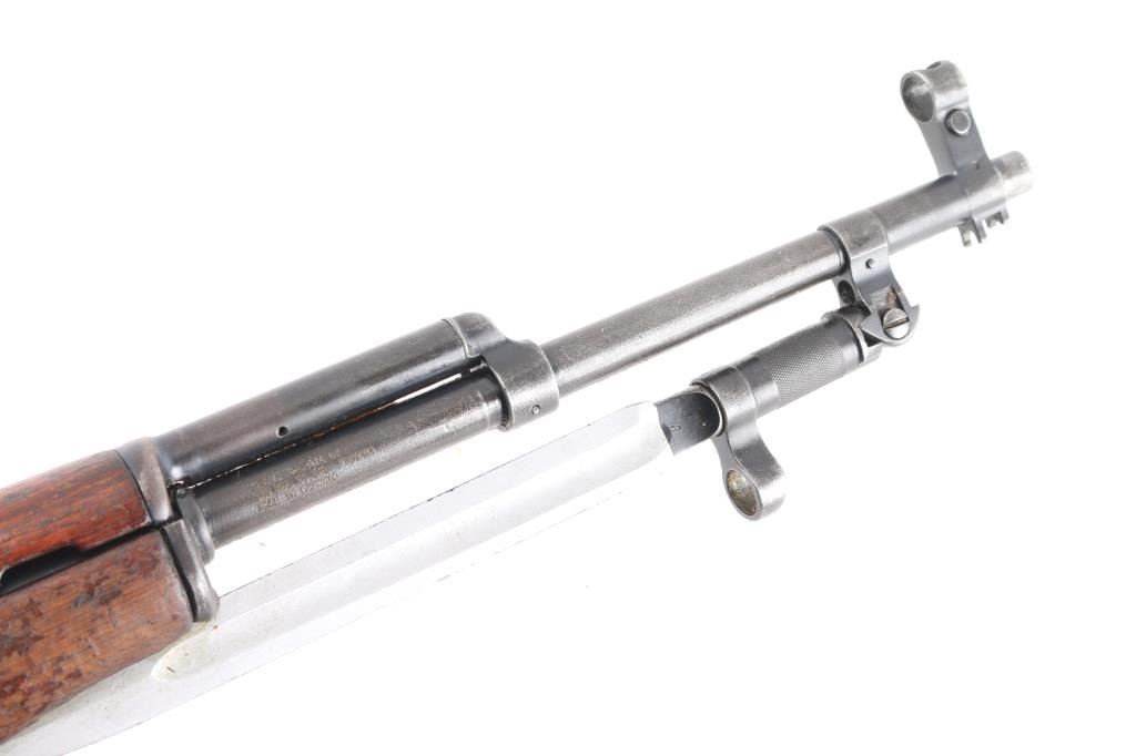 SN: RC1861-1960. Note* Parts/Repair Gun. Does not fire, we believe the disconnect lever in the trigger assembly might be to short, or assembled wrong. Needs adjustment or repair. 'M56' Romanian made gas-operated semi automatic rifle chambered in 7.62x39mm. Cugir factory mark on left receiver. Dated 1960. Features a blued finish, 20.4" barrel, hooded front sight, adjustable tangent rear sight, cleaning rod missing, folding blade bayonet, safety selector, fixed 10 round magazine, smooth wood handguard and pistol grip shoulder stock with trapdoor metal buttplate. Matching serial numbers on receiver, bolt carrier, triggerguard, and magazine. Import marks on barrel. Rifle retains approximately 75% of it's blued finish showing minor edge wear, handling loss. Action is smooth, bore is a little rough,scattered areas of pitting, strong rifling and wood stock is sound with several blemishes, Finish loss..