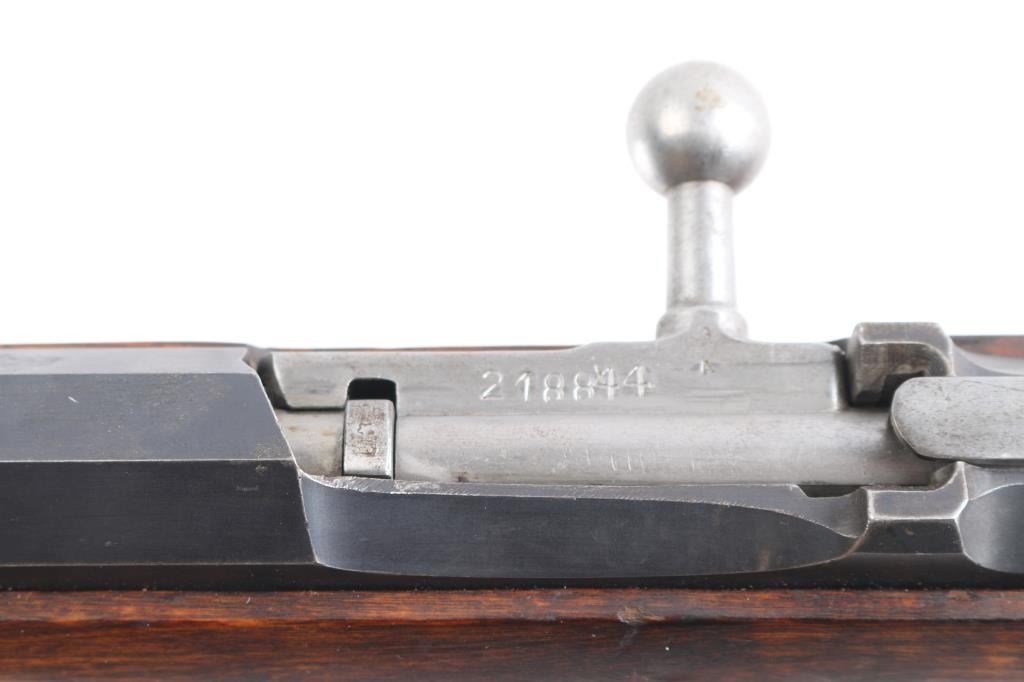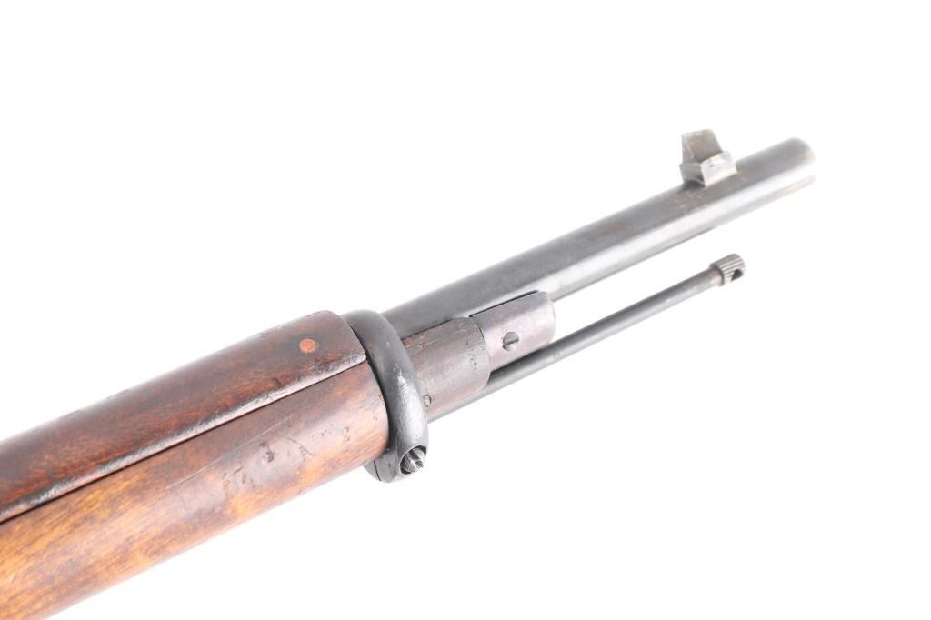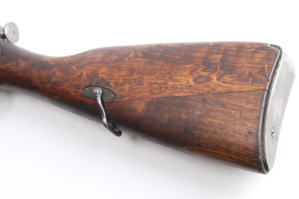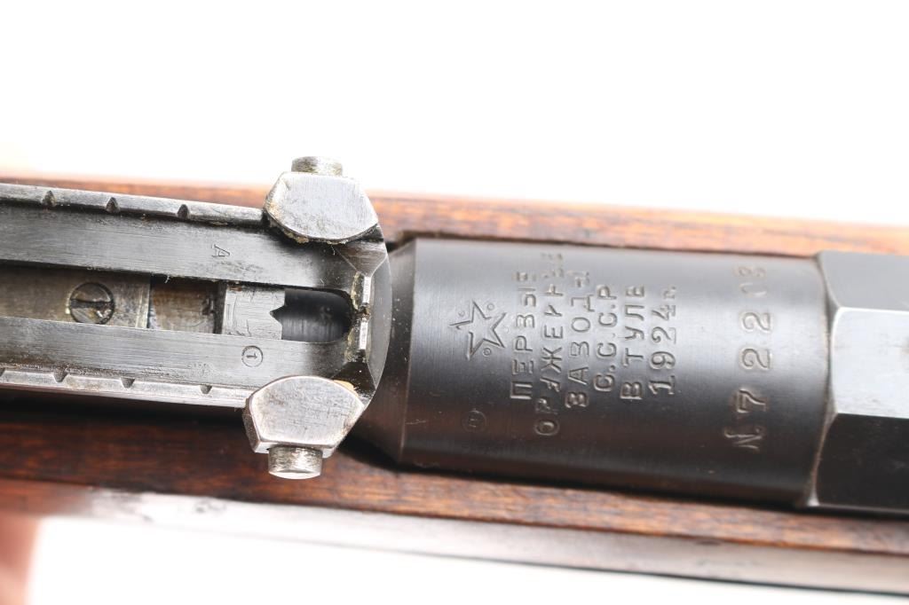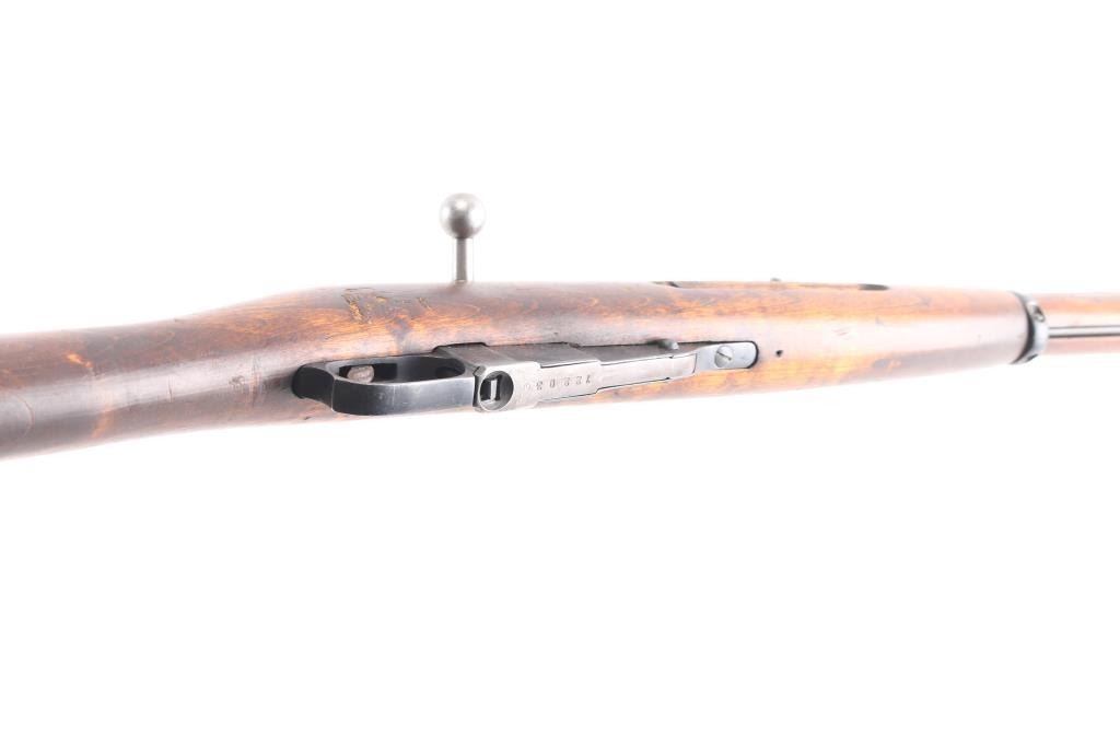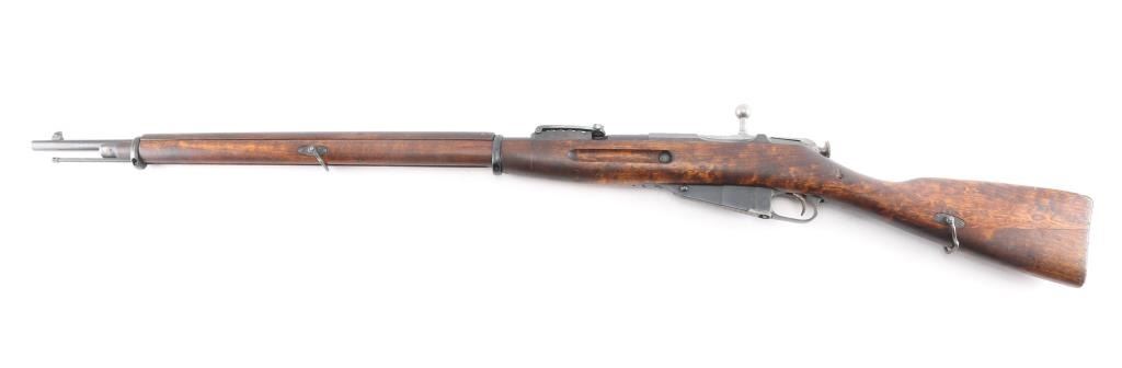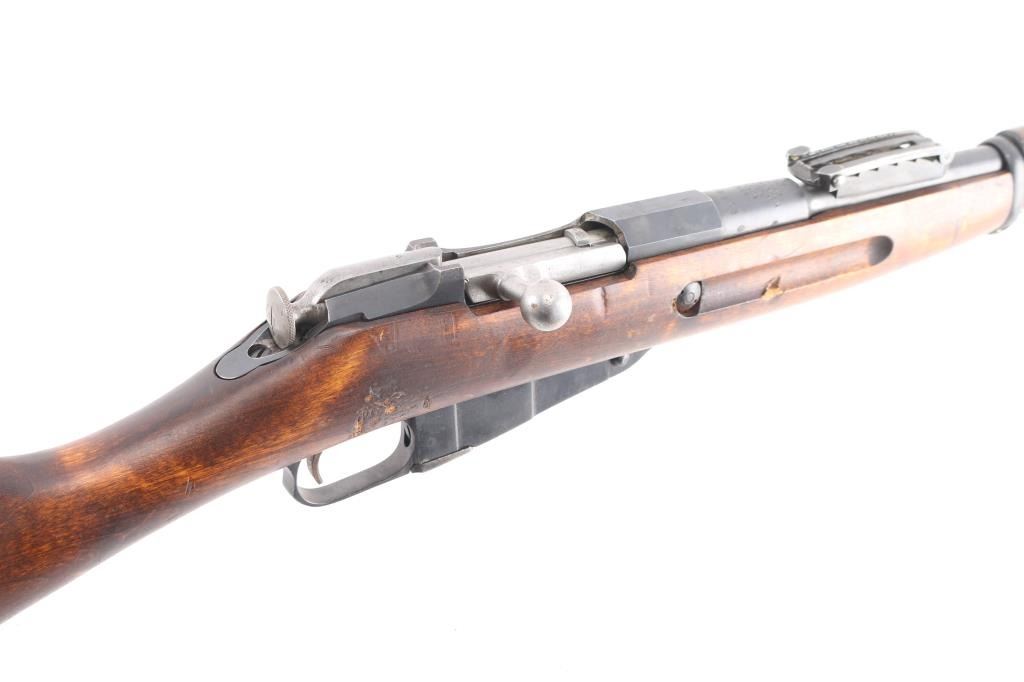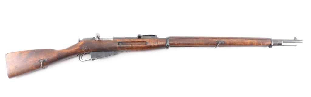 Russian bolt action service rifle chambered in 7.62x54R, circa 1922. Features a blued finish, 31.6" barrel, cleaning rod, blade front sight, ladder rear sight, 5 round internal box magazine, hex receiver, Tula "C.C.C.P.", 5th pattern marking, The right side of the barrel is marked with SA inside a rectangle, for Suomi Armeija (Showing use by the Finnish Army). straight bolt handle, smooth wood handguard and full length straight grip shoulder stock with metal buttplate. Matching serial numbers on barrel & magazine, mismatched bolt. CAI import marks on barrel. Finish is approximately 85% intact showing edge/handling wear. Action performs well, bore is very good with good rifling and wood stock is very good.
