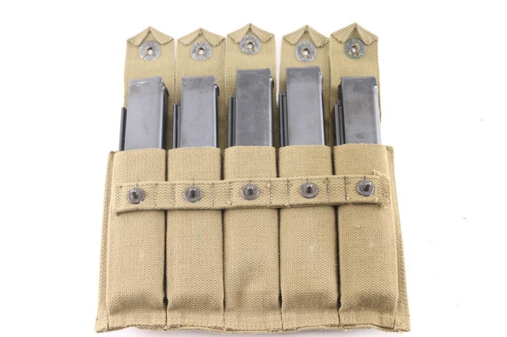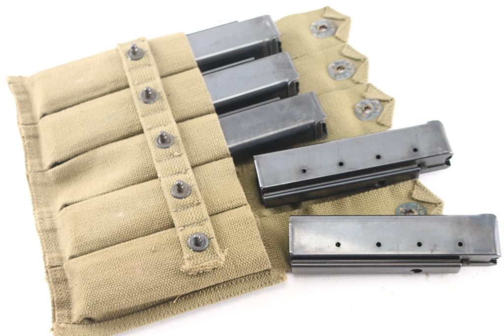 Five 20rd mags, three Auto Ordnance and two by Seymour. Very good condition, blued, in khaki belt pouch.