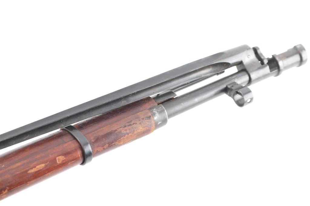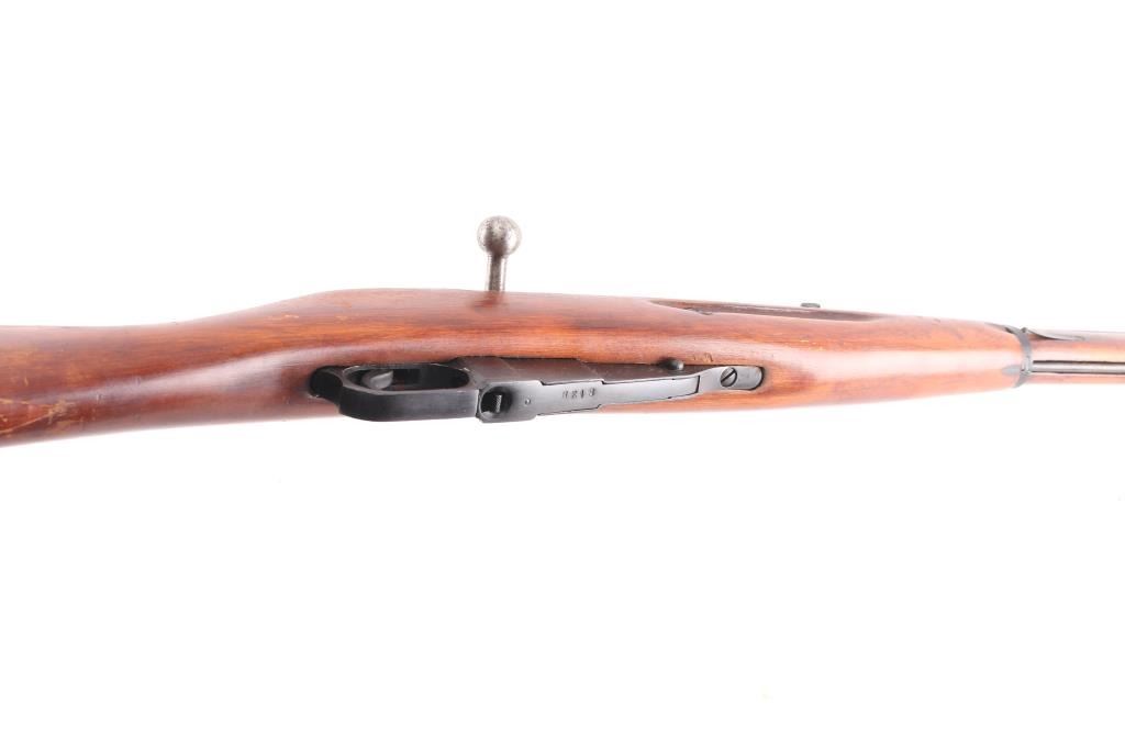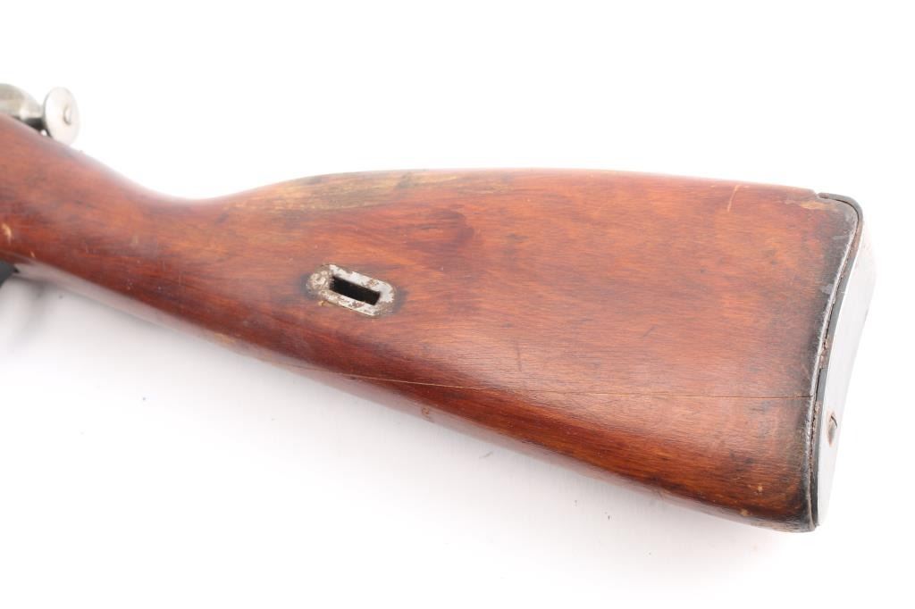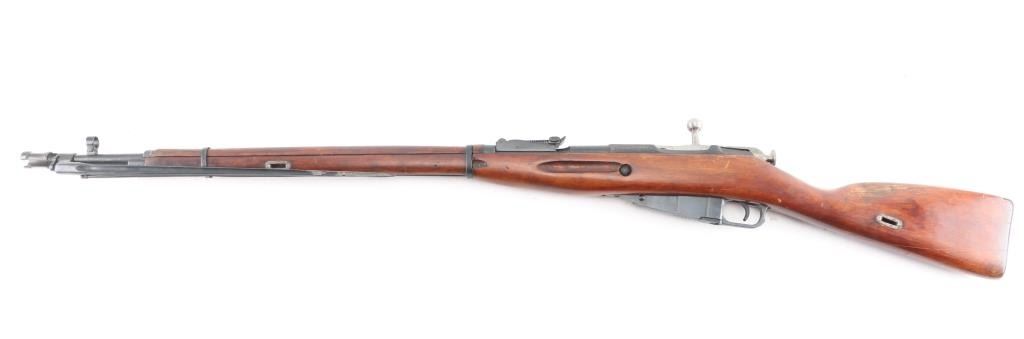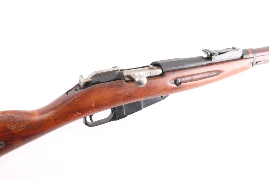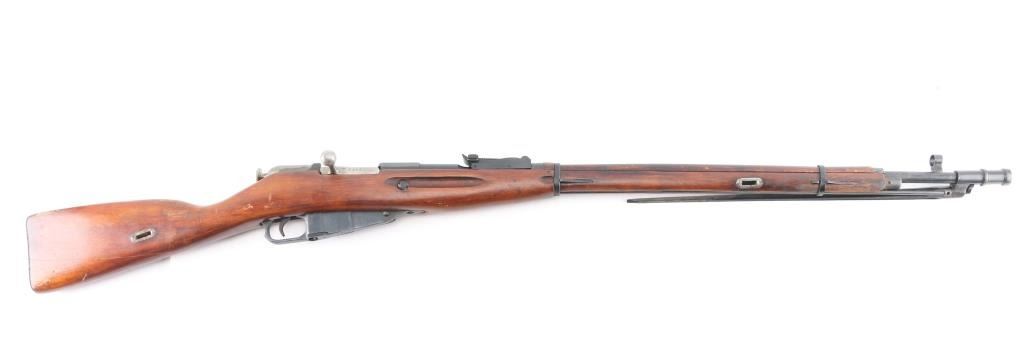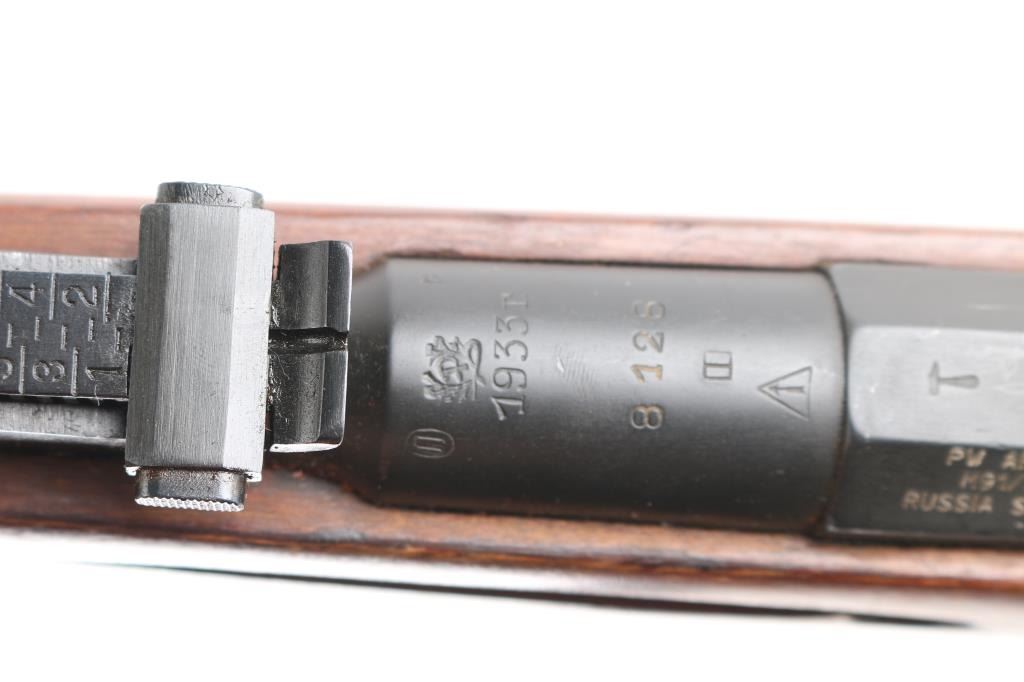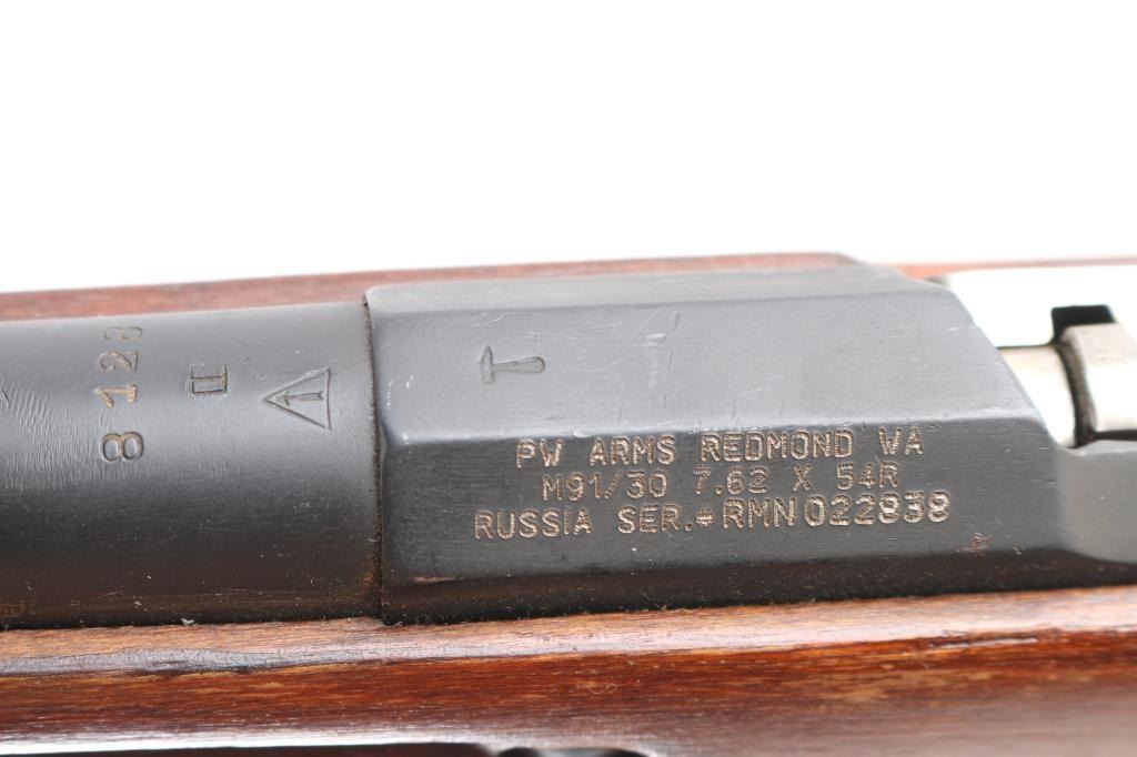 SN:RMN022838. Russian military bolt action rifle manufactured circa 1933, imported by PW Arms, Redmond WA. 4th Pattern Izhevsk wheat, hammer, & sickle barrel shank markings. Arsenal re-finish. Features 29" barrel, post front sight inside protective ring, tangent style rear sight, manual safety, straight bolt handle, sling slots, cleaning rod under barrel. Bore is good condition, showing some frosting in grooves, strong rifling. Retains 90% dark blued arsenal refinish with small scratches and handling marks, some blemishes and areas of discoloration. Bolt assembly is very good polished bare metal. Wood is good condition, arsenal varnish. Importer serial number applied to receiver. Original Matching Cyrillic serial number is found on the bolt, barrel, floorplate, & steel butt plate. Comes with bayonet matched to the rifle