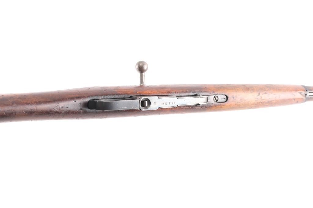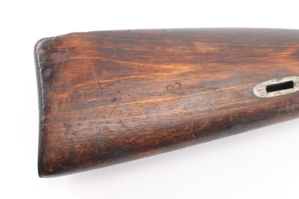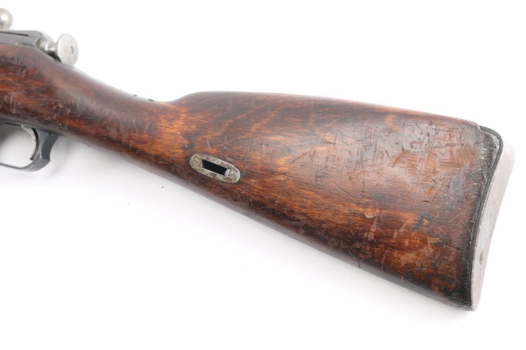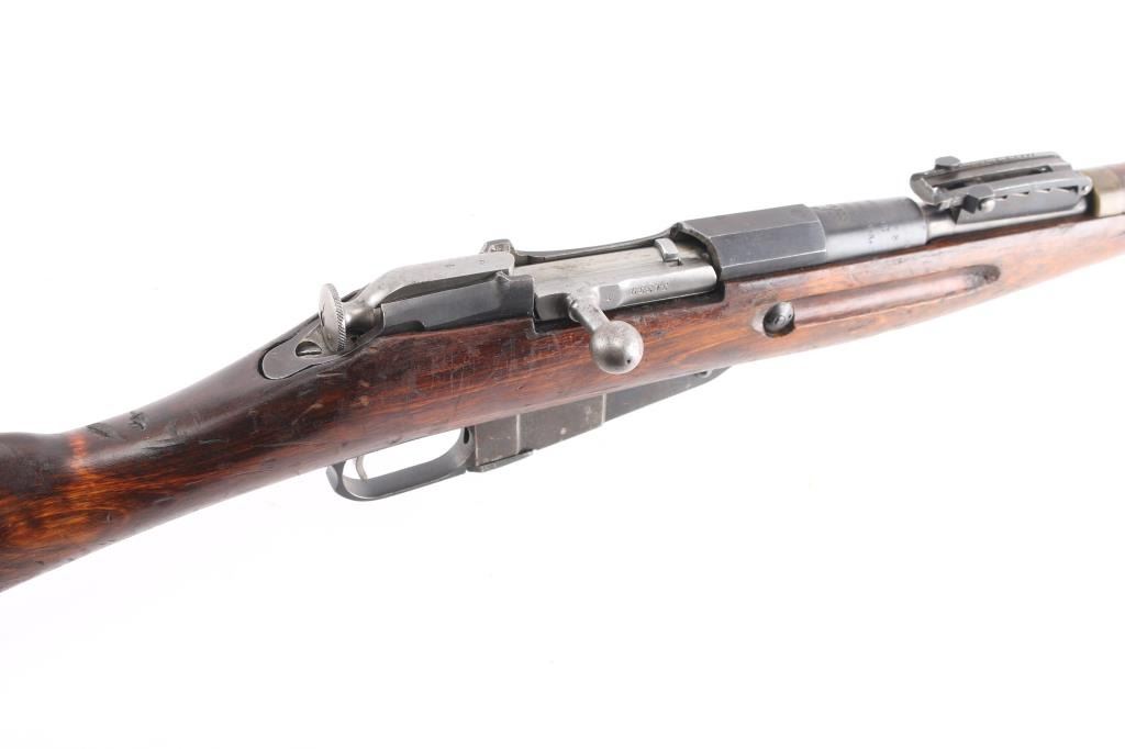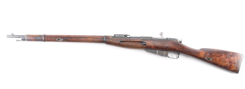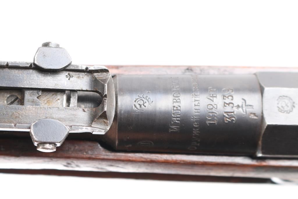 Russian (Soviet Union) military bolt action rifle dated 1924. No importer marks observed. Features blued finish, wood stock & handguard, 29" barrel, blade front sight, tangent rear sight, sling slots. Buttplate 2nd pattern wheat, hammer, & sickle Izhevsk barrel shank markings. Bore is good/bright, with strong rifling. Metal retains 90% dark finish with edge wear. Bare metal bolt is very good. Wood is very good. Matched numbers on barrel, bolt, floorplate, and steel butt plate. cleaning rod present.