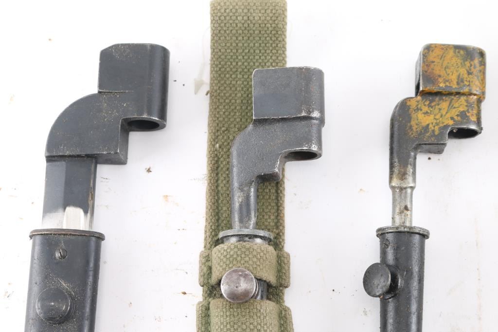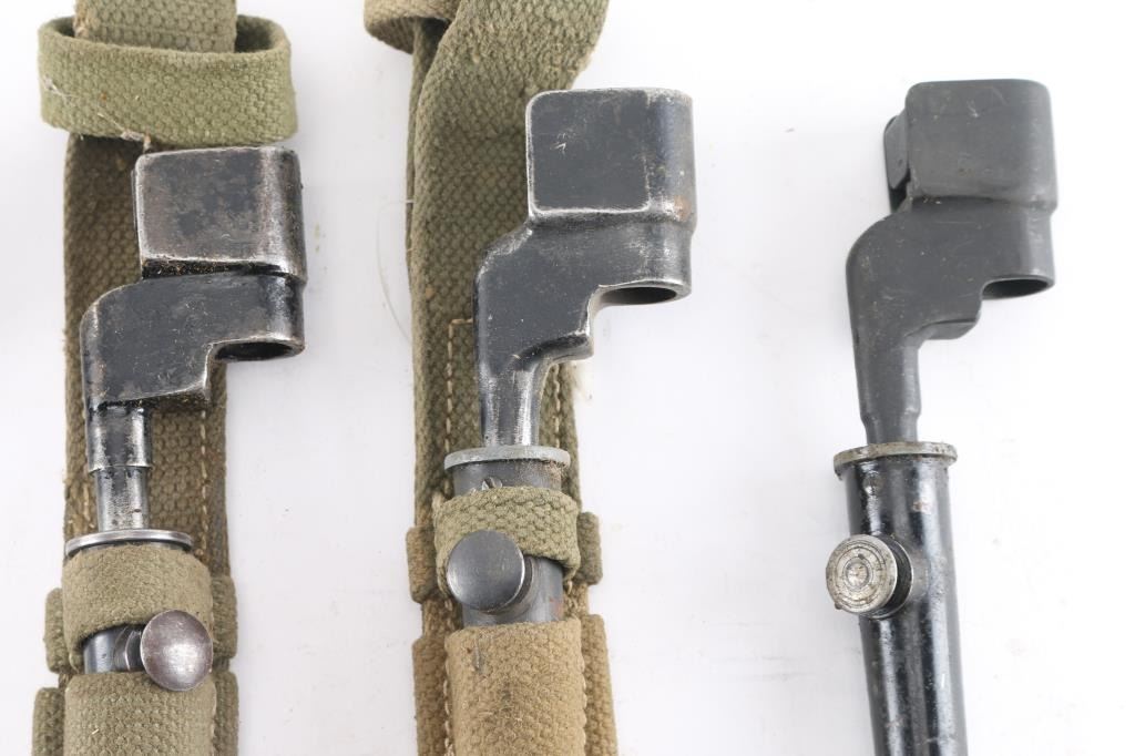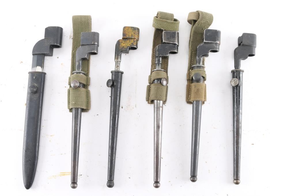 Six total. Includes 5 Enfield No.4 Spike bayonets with steel scabbards, 3 have green canvass frogs,and 1 No. 9 Mk I blade bayonet, dated 1954, serial number matched to scabbard. All the No. 4's have dried cosmoline from storage.