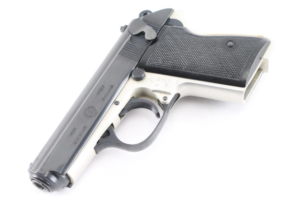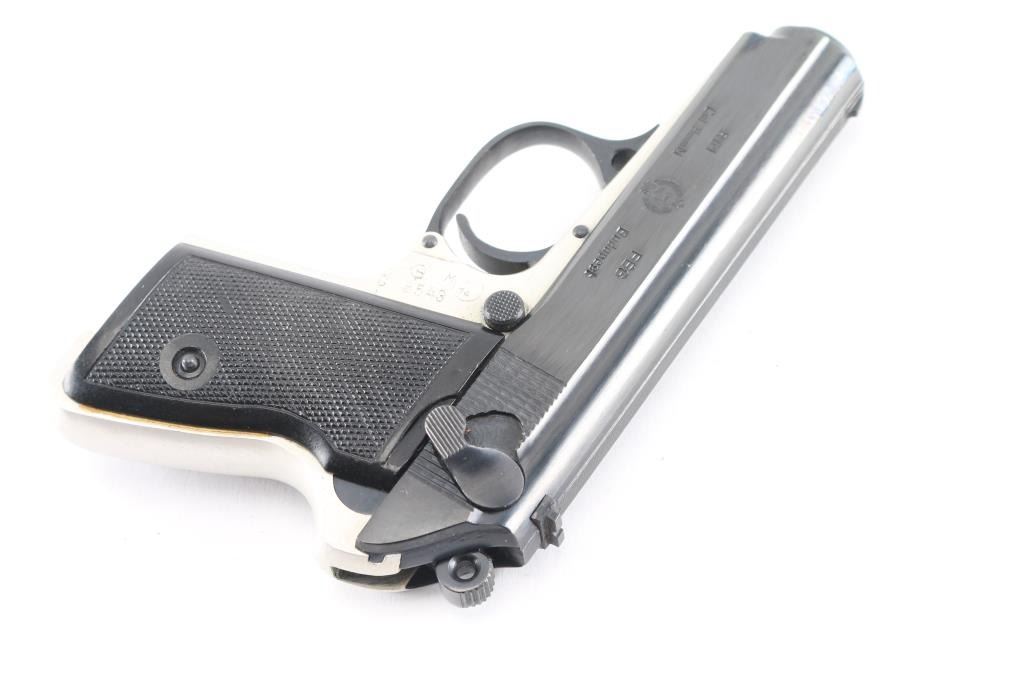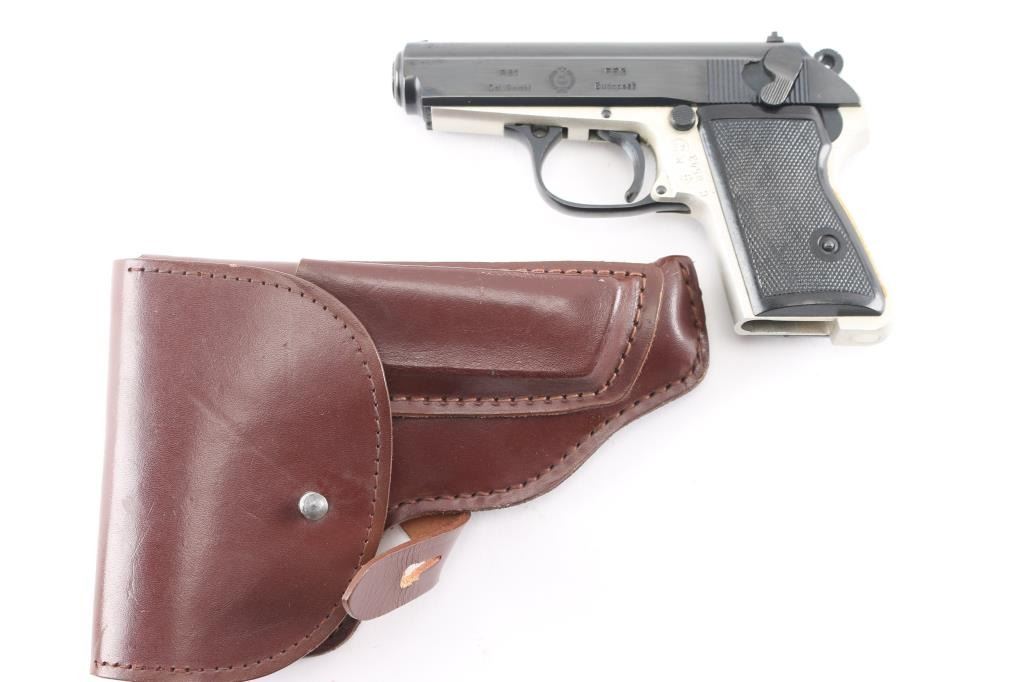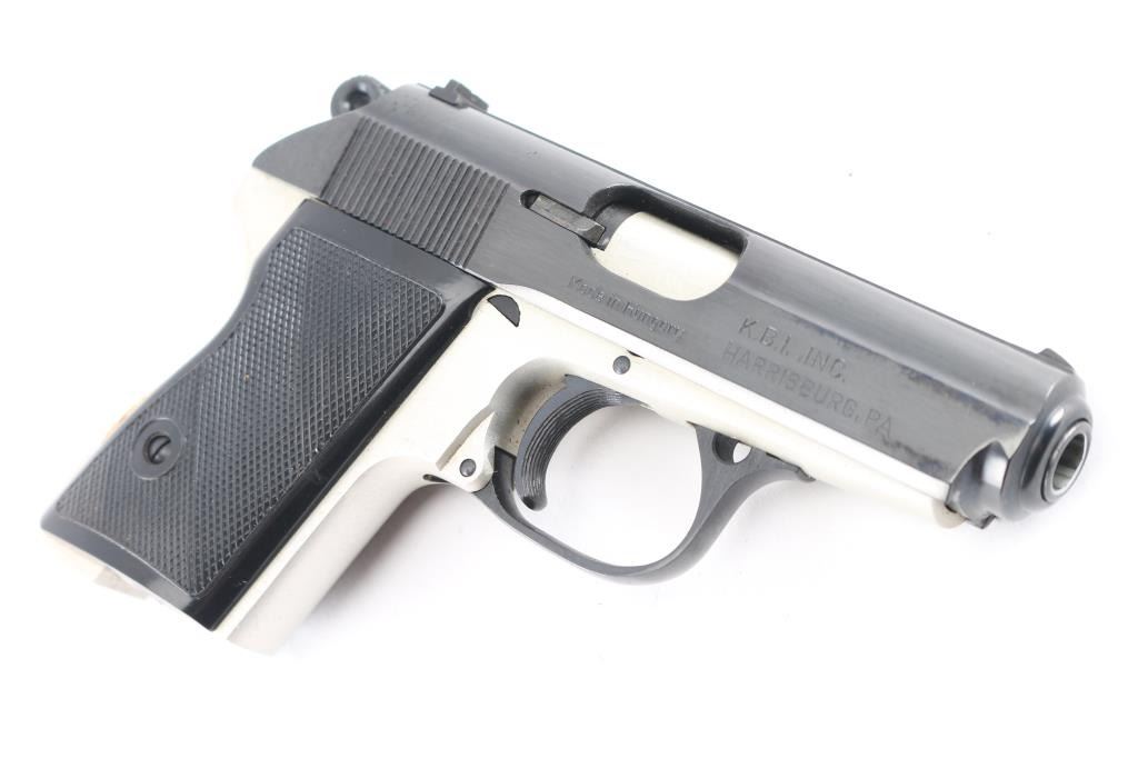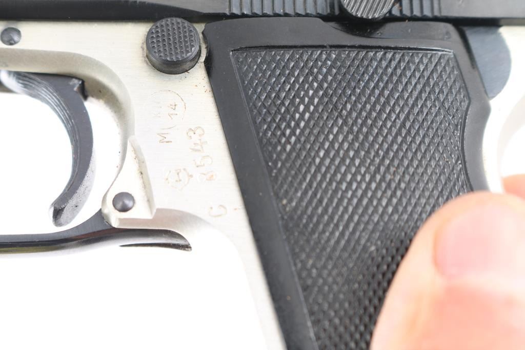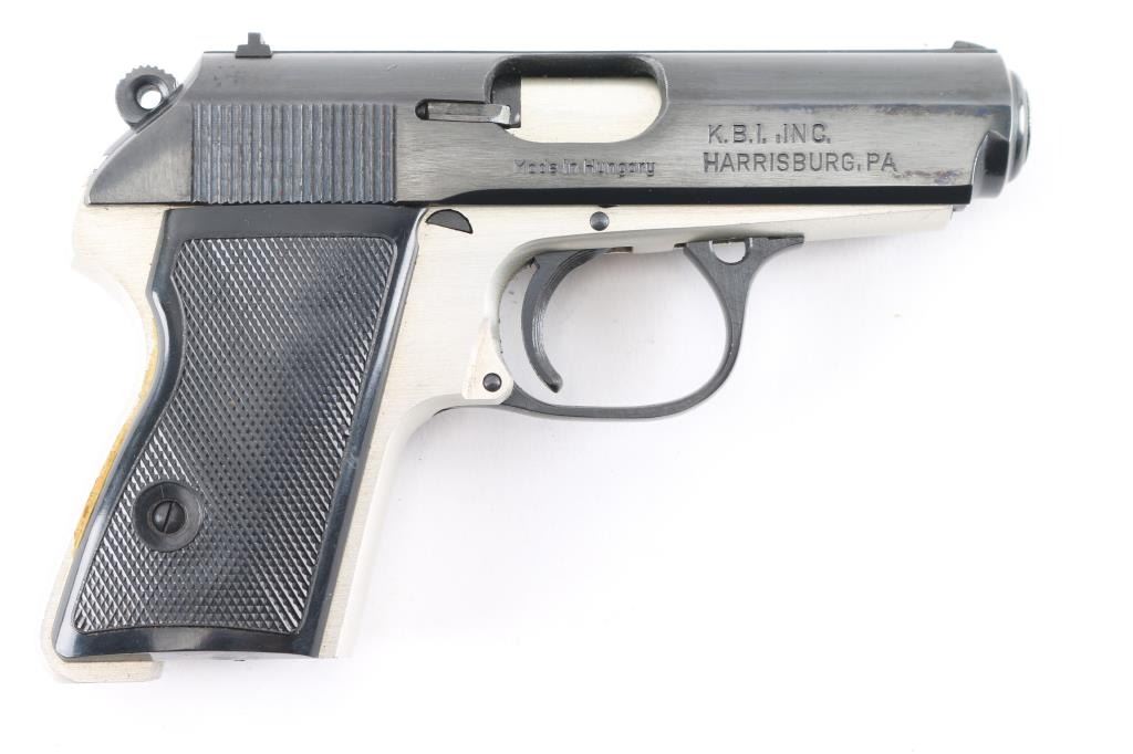 Hungarian made compact pistol, imported by KBI, Harrisburg PA. Features Walther PPK styling and design influence, with double action trigger, slide mounted decocking safety, push button mag release, trigger guard hinged for disassembly. Blued finish, bare metal or silver anodized aluminum alloy frame, checkered black plastic grips, 3.4" barrel, fixed sights. Bore is very good bright condition. Retains 95% finish with handling marks. Grips are very good condition. Includes brown leather full flap holster (appears to be for a PM Makarov pistol). No magazine provided.