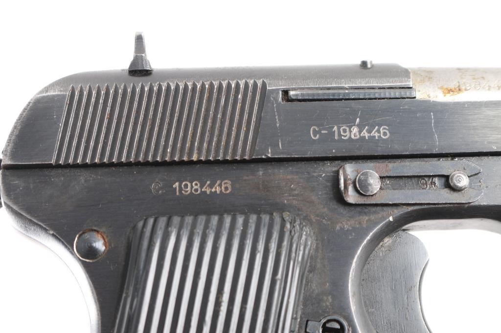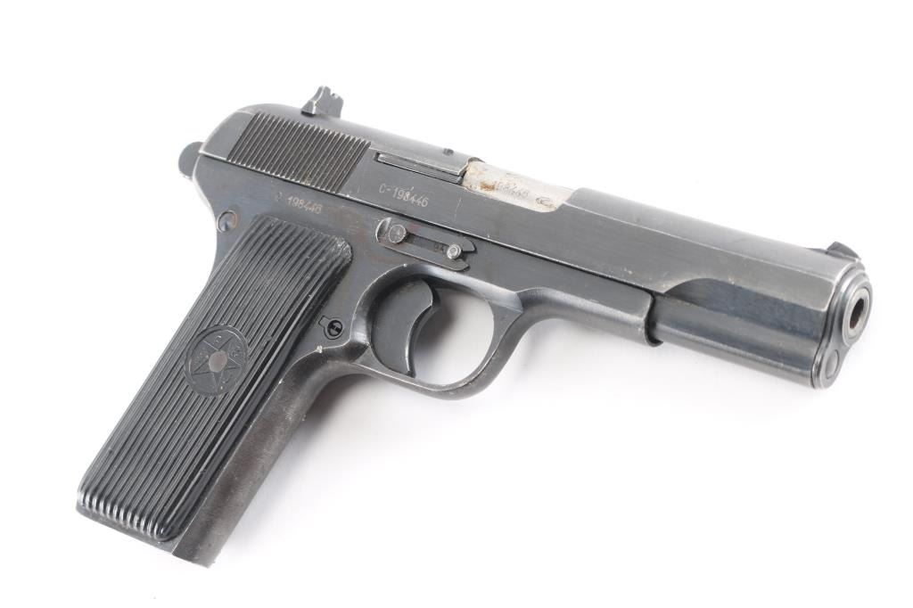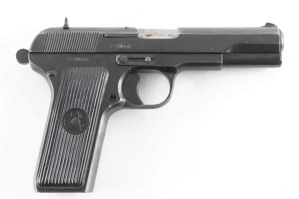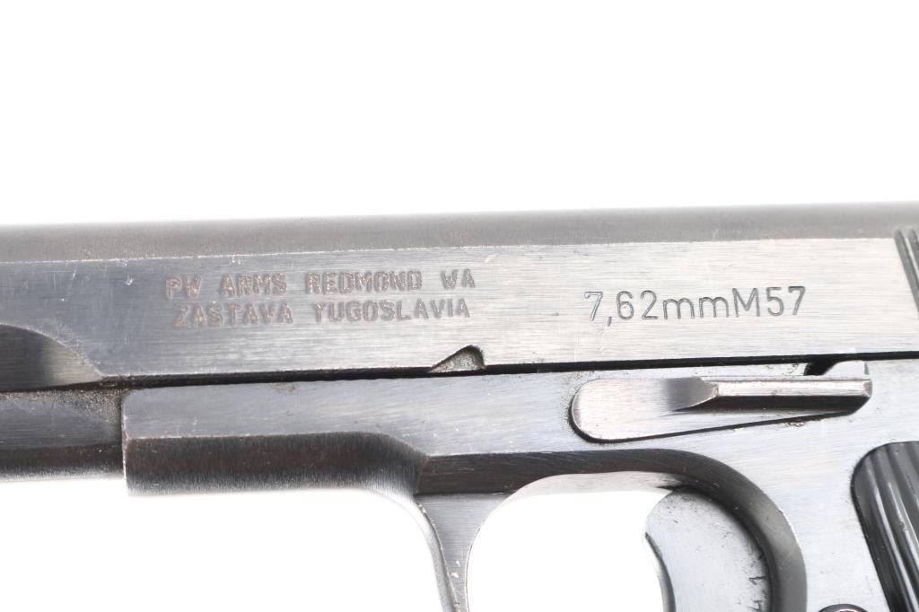 Yugoslavian military pistol imported by PW Arms, Redmond WA. Tokarev type pistol with slightly longer frame, takes a longer magazine that standard TT-33's. Features approx 4.5" barrel, fixed sights, detachable magazine, magazine safety, frame mounted manual safety, grooved plastic grips with "SFRJ" star, single action trigger. No lanyard loop installed. Bore is very good condition. Finish is blued with 85% coverage, some scratches and scuffs, several small patches of bare metal, some rust in safety notch on slide. Black plastic grips in very good condition. Observed numbers match. Sticky action, from dried grease No Magazine.