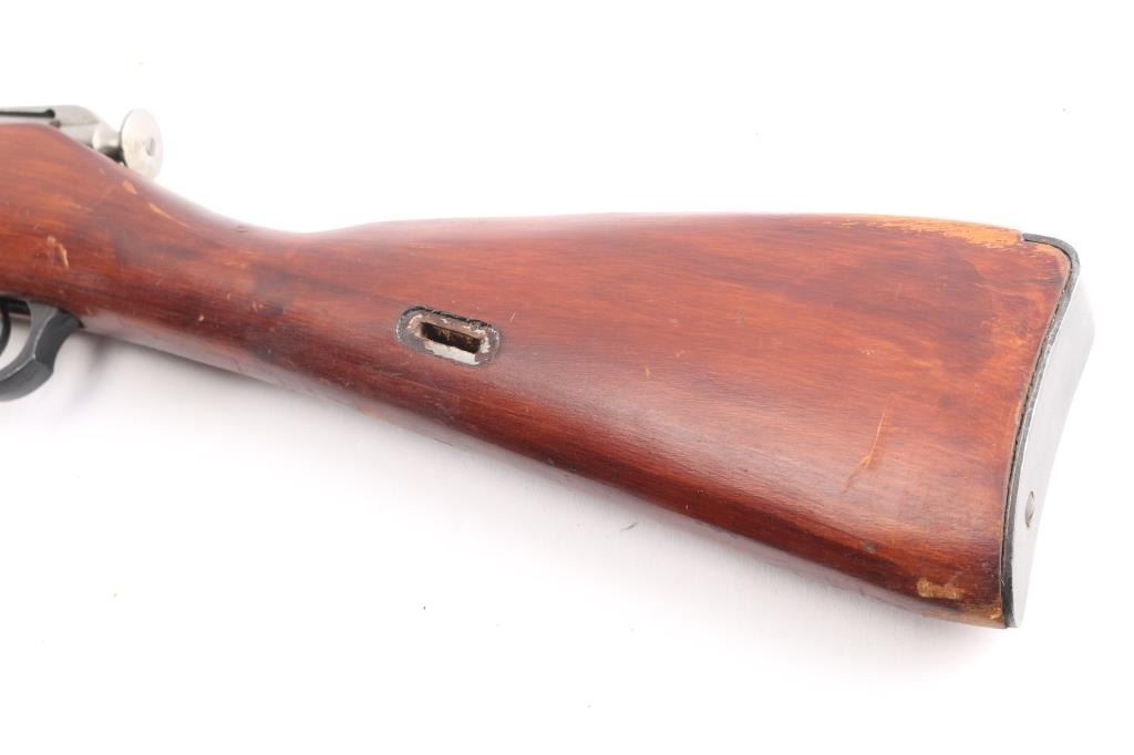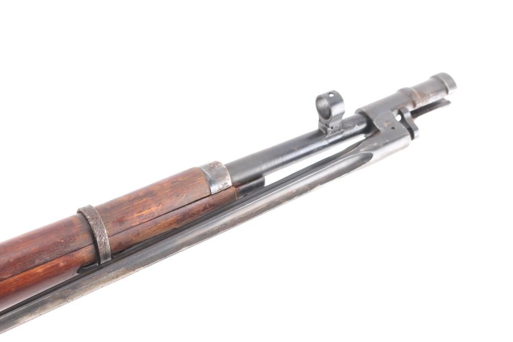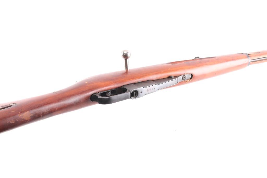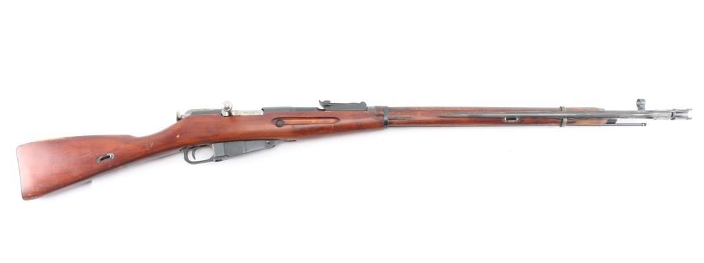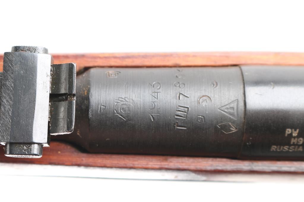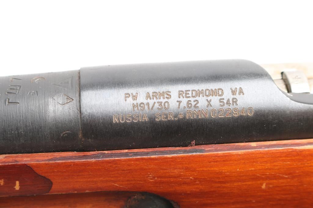 SN:RMN022840. Russian WW2 military bolt action rifle manufactured circa 1943, imported by PW Arms, Redmond WA. 4th Pattern Izhevsk wheat, hammer, & sickle barrel shank markings. Arsenal re-finish. Features 29" barrel, post front sight inside protective ring, tangent style rear sight, straight bolt handle, sling slots, cleaning rod under barrel. Bore is rough, frosting in the grooves, strong rifling, may improve with cleaning. Retains 94% dark blued arsenal refinish with minor scratches, some edge wear. Bolt is polished. Wood is good/sound, with a couple of areas of finish loss. Importer serial number applied to receiver. Original Matching Cyrillic serial number is found on the bolt, barrel, floorplate, & steel butt plate. Comes with matched bayonet, has some finish loss.