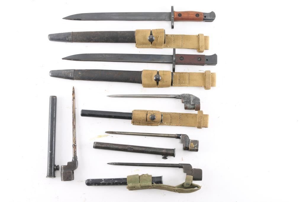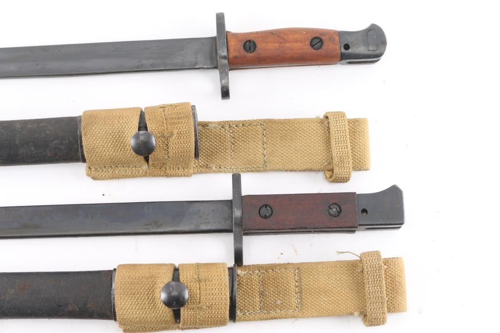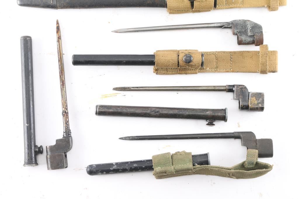 Six Total. Includes Three No.4 spike bayonets with Mk Ii round scabbards. one has tan web frog, one with a Mk III plastic scabbard, frog stud has broken off, and is in the green web frog, a P1907 WW2 bayonet dated 1944,tan web sling dated 1943, 11 1/2" blade, ricasso stamped 'N.W.R. II', M1907 Bayonet, same as above, un dated, ricasso stamped 'M.I.L.', frog dated 1943.