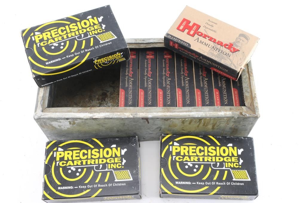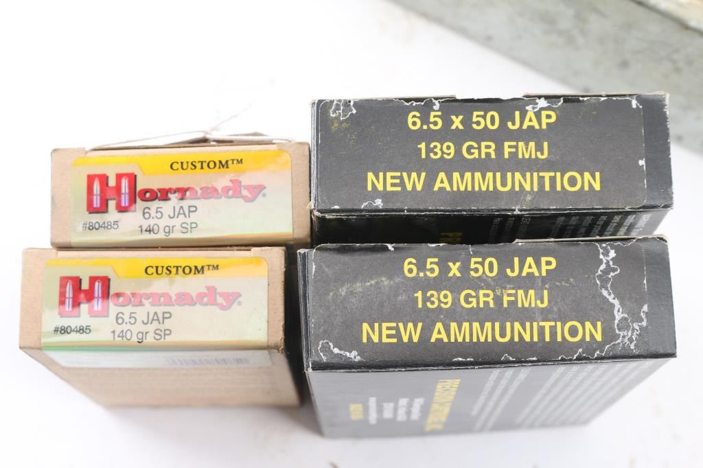 Approx. 220 rounds of 6.5 X 50mm Japanese factory new ammunition. 60 rds made in Indiana by Precision Cartridge Inc., 139 Gr. FMJ & Hornady 140 Gr. SP, all in 20 rd factory boxes, in tin box.