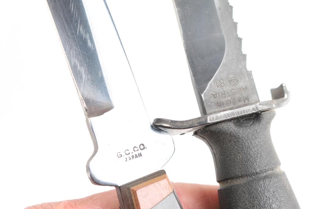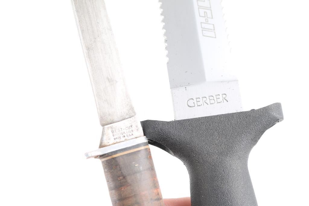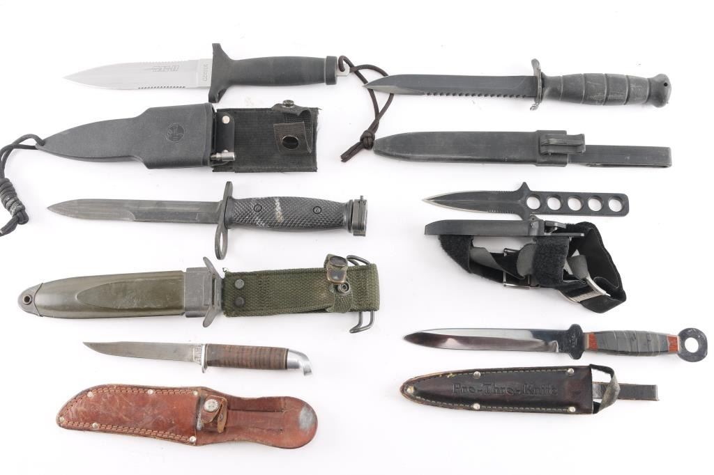 Includes 1 - Gerber TAC II w/ 6" blade & kydex sheath, 1 - Glock w/ 6 1/2" blade & kydex sheath, 1 - M7 bayonet w/ 6 3/4" blade & OD green hard sheath, 1- Tekna diving dagger w/ 3 1/2" blade & plastic sheath, 1 - GC Co. w/ 6" blade & leather sheath & 1 - West Cut w/ 4 1/2" & leather sheath.