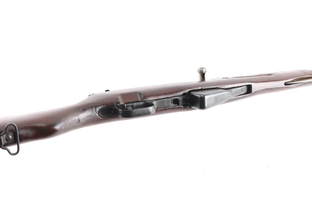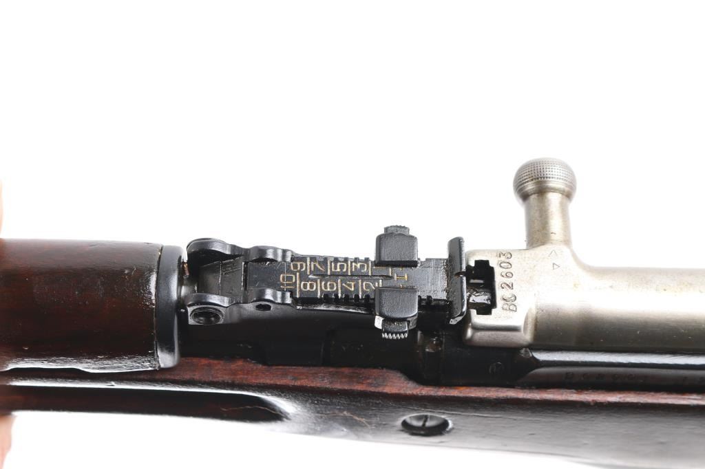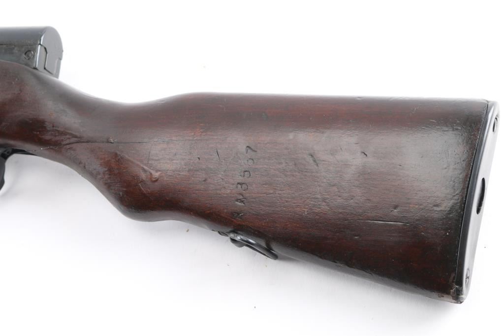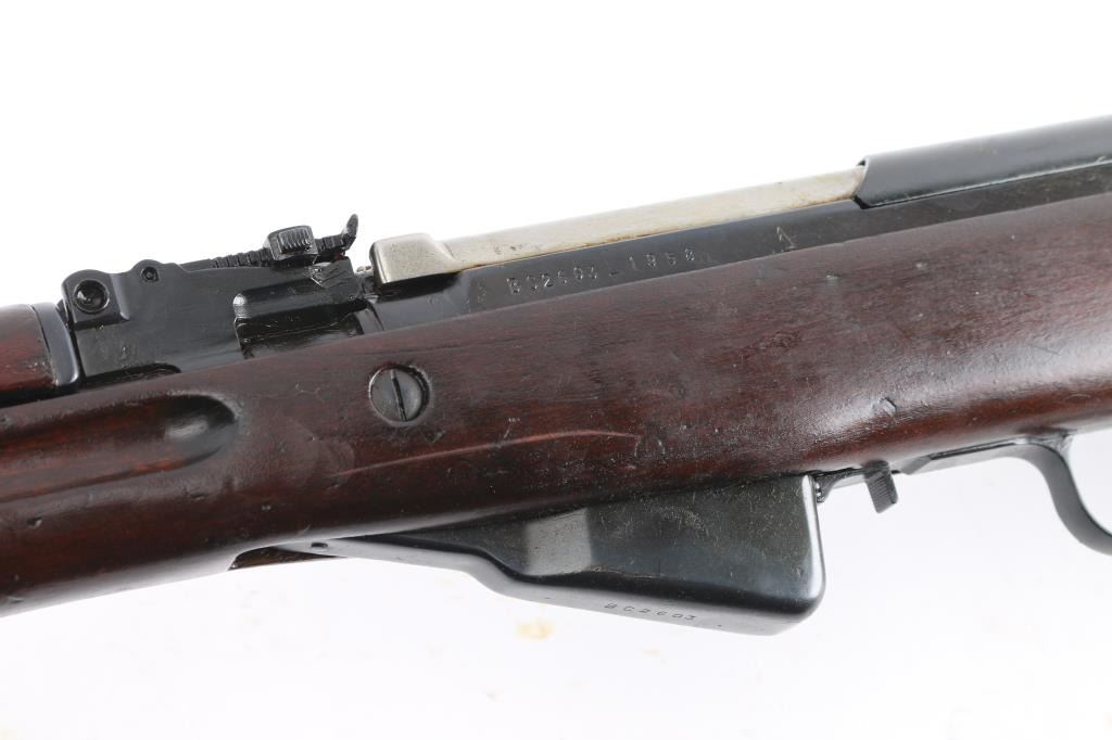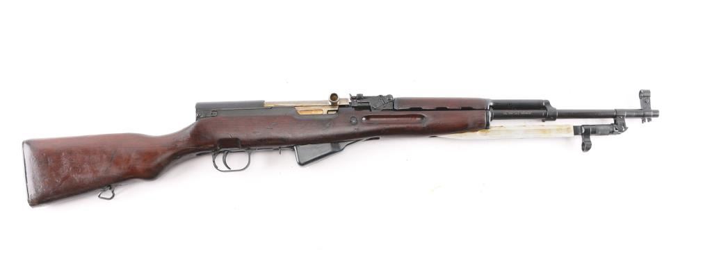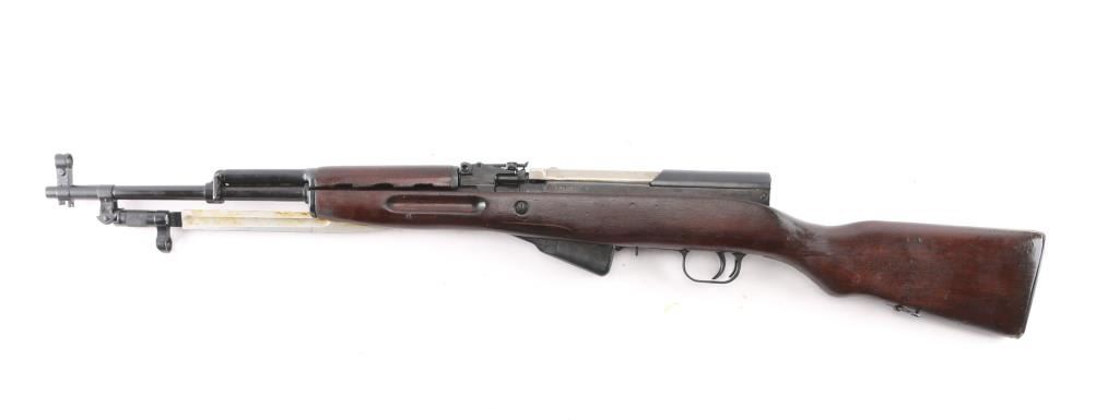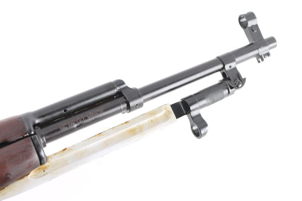 SN: BC2603-1958. 'M56' Romanian made gas-operated semi automatic rifle chambered in 7.62x39mm. Cugir factory mark on left receiver. Dated 1958. Features a blued finish, 20.4" barrel, hooded front sight, adjustable tangent rear sight, cleaning rod missing, folding blade bayonet, safety selector, fixed 10 round magazine, smooth wood handguard and pistol grip shoulder stock with trapdoor metal buttplate. Matching serial numbers on receiver, bolt carrier,cover, triggerguard, and magazine. Has coat of cosmoline from storage. Import marks on barrel. Rifle retains approximately 96% of it's blued finish, bore is very good/bright, and wood stock is sound with some scratches/dings, there is a hair line crack in the left grip, sound.