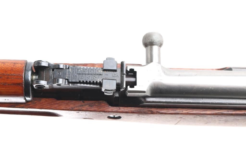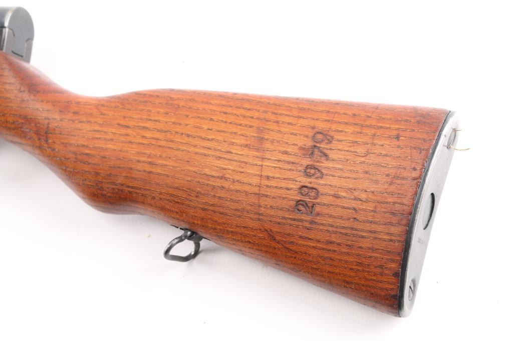 Zastava M59 PAP, also known as Papovka, is a Yugoslav licensed version of Soviet SKS semi-automatic rifle.'Mdl 59'' Yugoslavian made gas-operated semi automatic rifle chambered in 7.62x39mm. Imported by CAI, right barrel. Features a blued finish, 20.5" barrel, hooded post front sight, tangent rear sight graduated to1,000 meters, cleaning rod, folding blade bayonet, manual safety, smooth trigger, fixed 10 round magazine, smooth wood handguard, pistol grip shoulder stock and trapdoor metal buttplate. Serial number matches on the receiver, magazine, triggerguard, bolt carrier, and stock. Rifle retains approximately 90% of it's blued finish with scratches/edge wear, bore appears very good/bright, strong rifling, and wood stocks are very good. Serial numbers puts it at pre 1967,