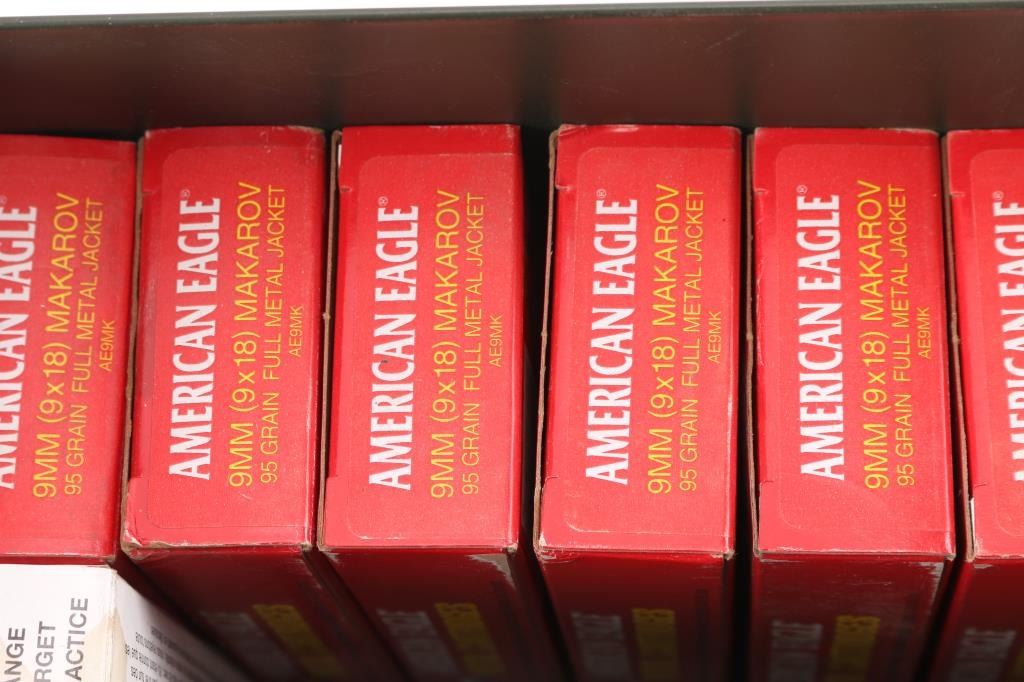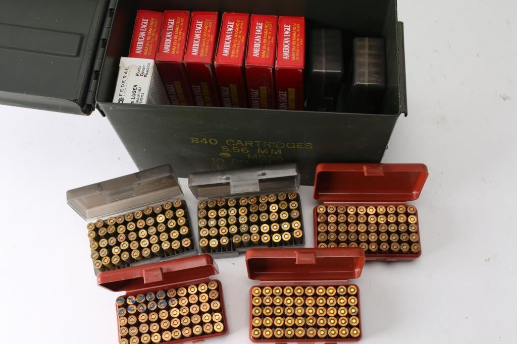 Approx. 700 rounds of 9mm Luger & 9mm Makarov factory new and reloaded ammunition. Various weights, mostly copper FMJ in plastic cases and factory box. All in metal ammo can.