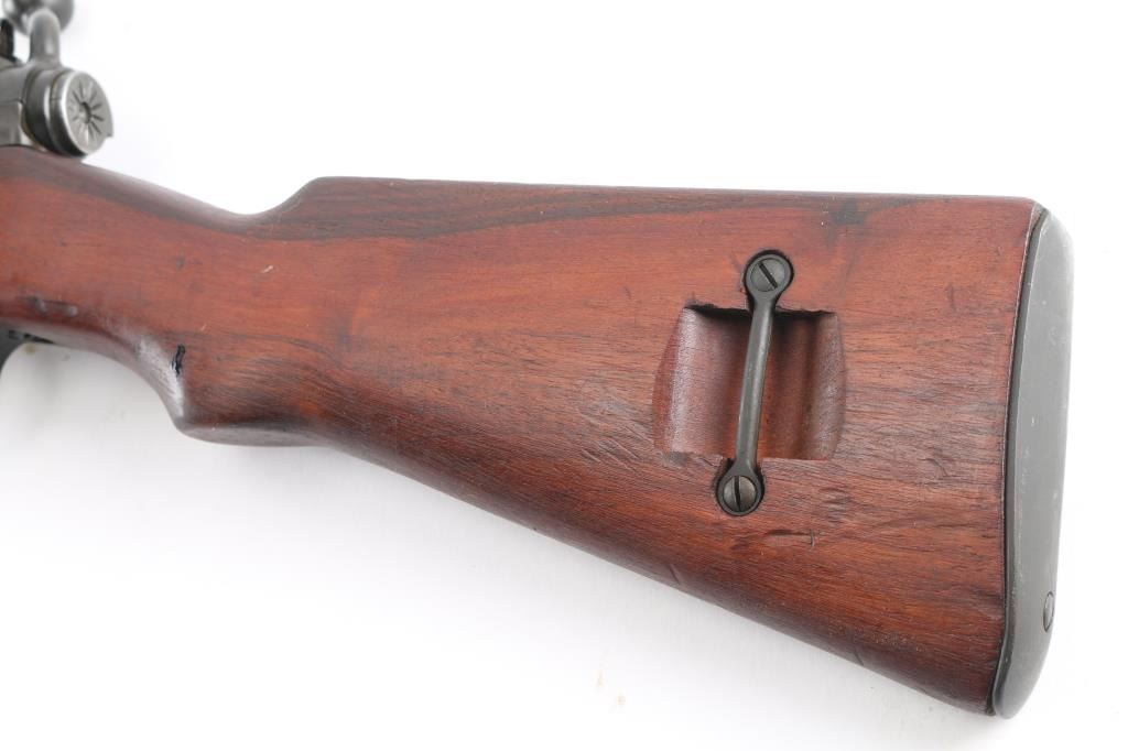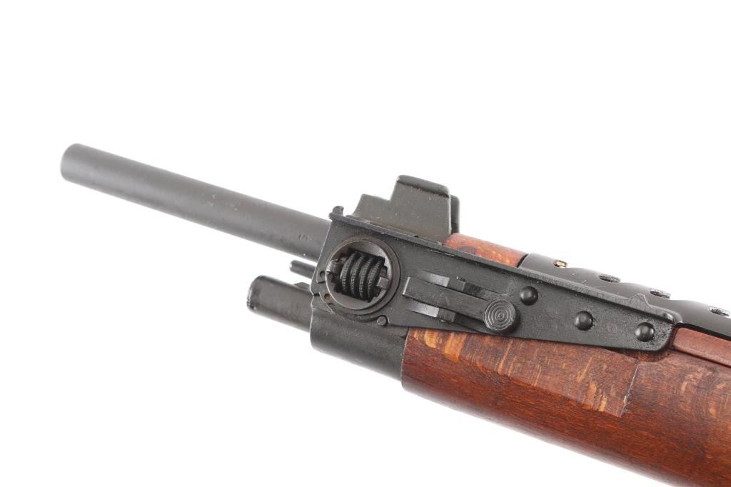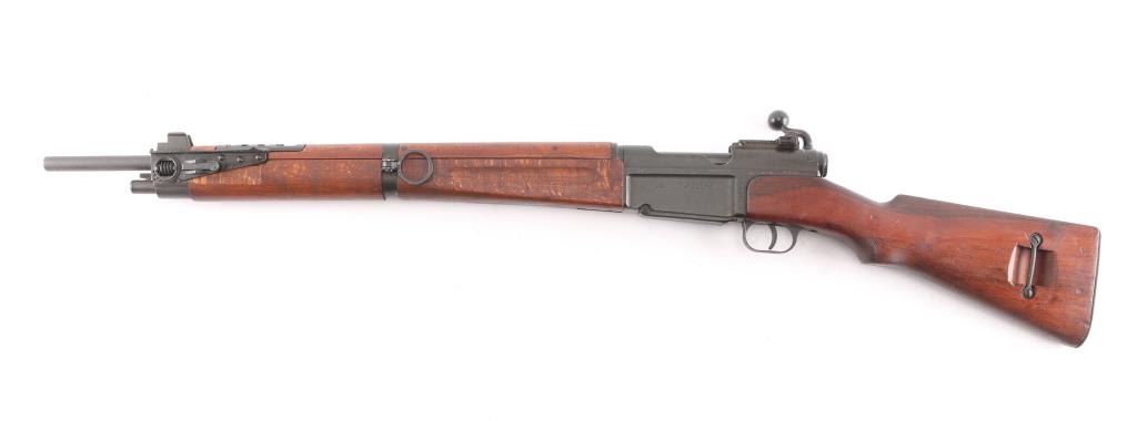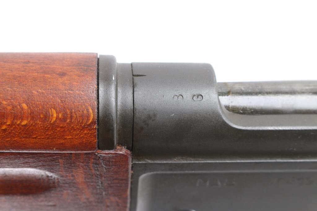 French military bolt action service rifle chambered in 7.5x54mm, circa 1948-1951. Imported by C.A.I. of St. Albans, Vermont with import marks on receiver. Features a parkerized finish, 25" barrel with grenade launcher sights, winged blade front sight, graduated rear aperture peep sight to 1,200 meters, spike bayonet in forearm, integral box magazine with mismatched serial number, angled bolt handle, sling swivels, smooth wood handguard and pistol grip shoulder stock with metal buttplate. Rifle shows an even dark grey finish throughout baring only a few light scuffs. Action is strong, bore is very good, needs cleaning are wood stocks are fine. A document in French with matching serial number, dated 8-5-72 is attached to the butt stock.