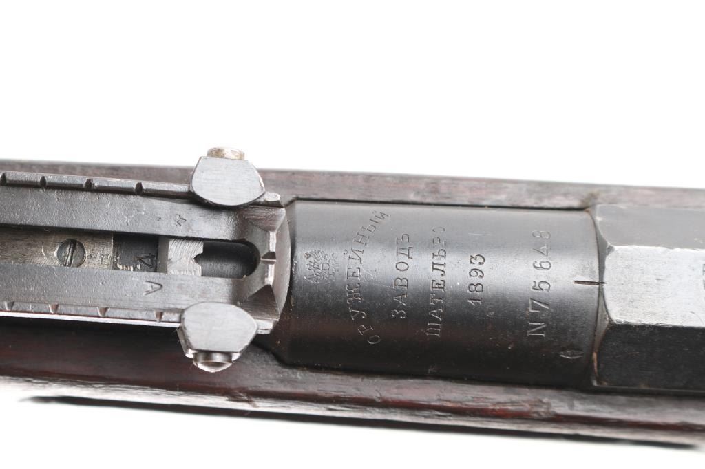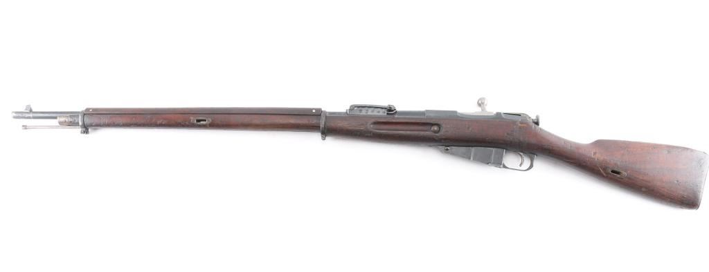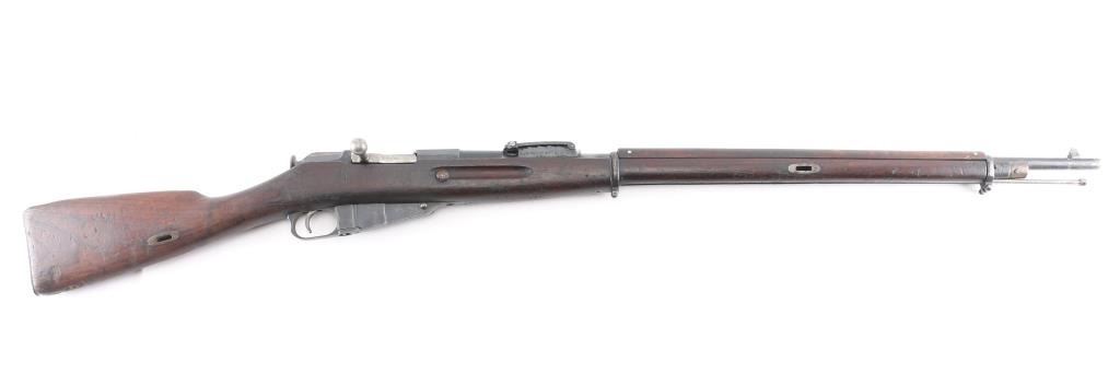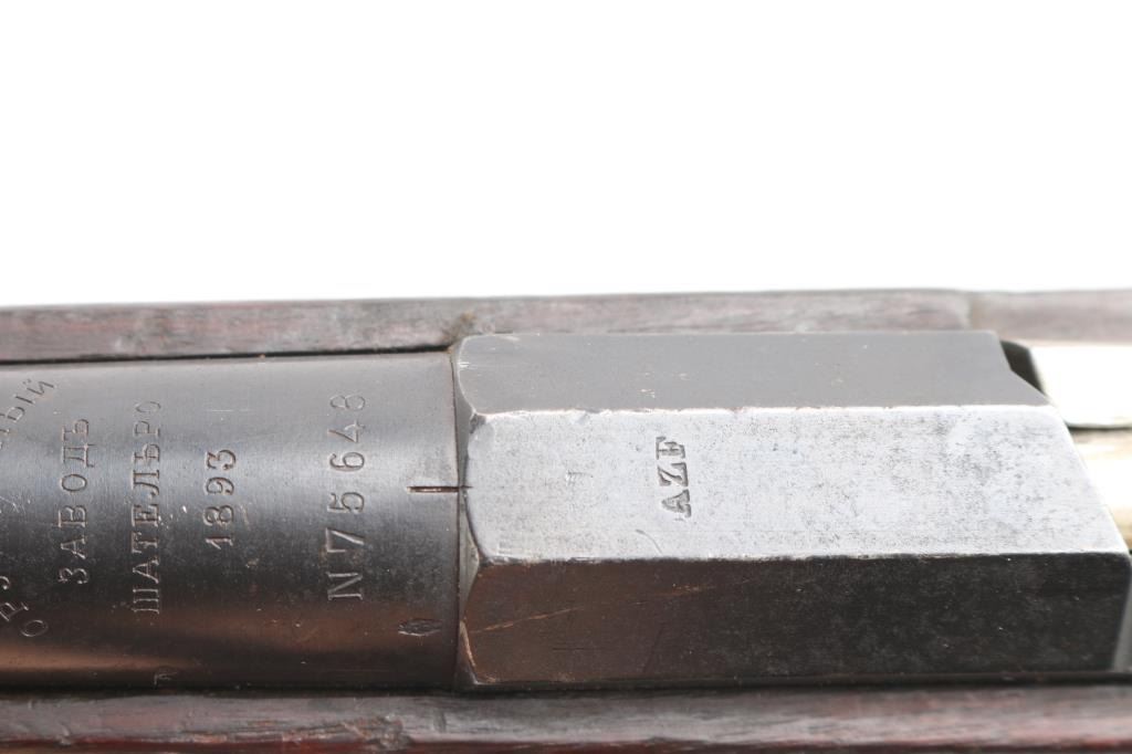 Chatellerault Arsenal Mosin Nagant M91 bolt action rifle. Manufactured in 1893. Russia's early M91 output was not sufficient to meet demand, and production was supplemented through a contract with France. The Chatellerault arsenal produced approximately one-half million Mosin Nagant M91's through the years of 1892 to 1895. Due to its age, relatively low production numbers, and attrition through several war periods, the Chatellerault is one of the more difficult of arsenals to locate and add to a Mosin collection. All captured and inspected rifles were marked with 'AZF' (Artillerie Zeugs Fabrik) stamped on the top chamber flat. 32”, Cylindrical Barrel with Hexagonal Receiver, with cleaning rod. The right side of the barrel is marked with SA inside a rectangle, for Suomi Armeija (Finnish Army). Chatellerault arsenal marked barrel markings in Cyrillic Russian. (''OPYKENHBIN 3ABONB IIIATEJIBPO 1893'' ) After WW1 many of these rifles were sold to Finland who mostly modified, & parted them out, it is extremely rare to find one in it's original configuration. Rifle retains most of its blue finish, wood is sound with the usual dings/dents, action is smooth, bore is rough, but has very strong rifling. Serial number matching on bolt. No import marks observed. A rare rifle with a fantastic history. Imported by CAI, marked on barrel, very feint.