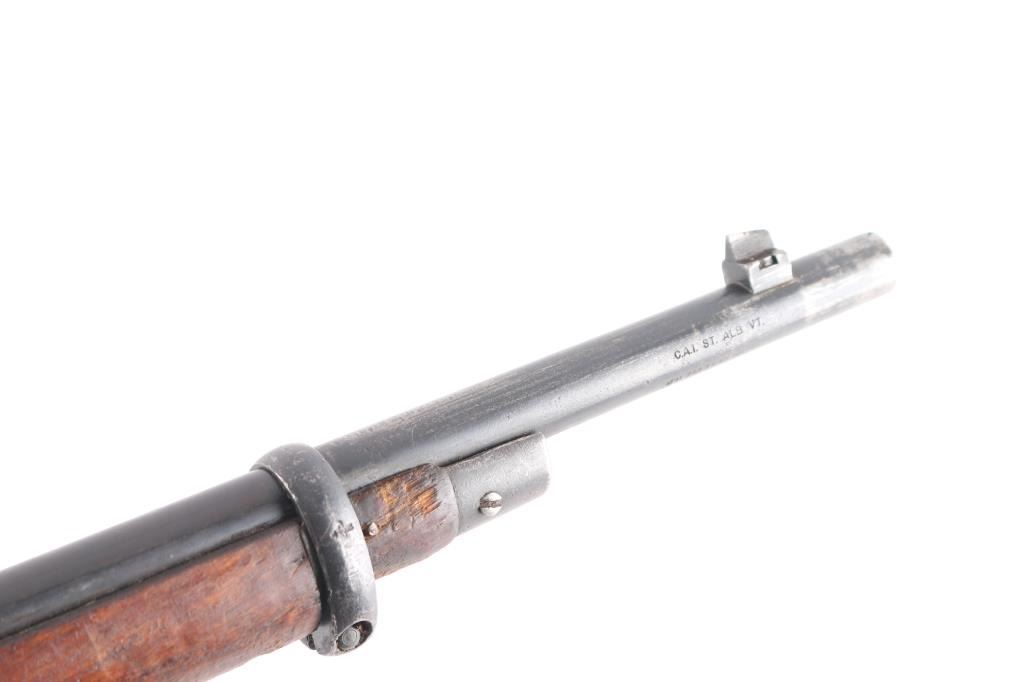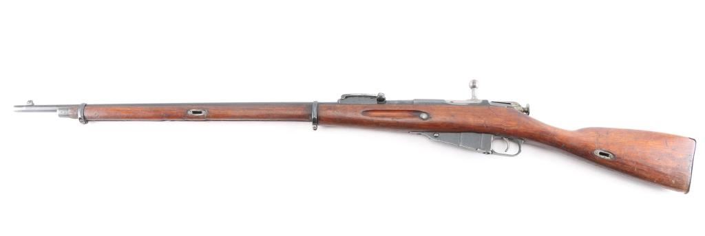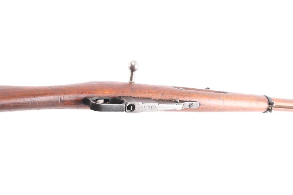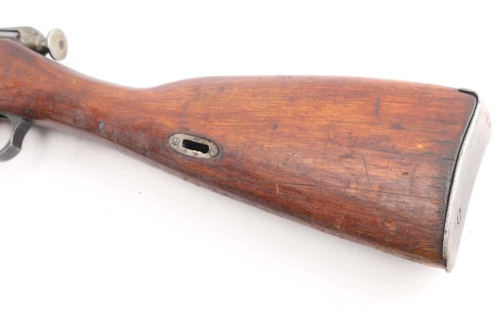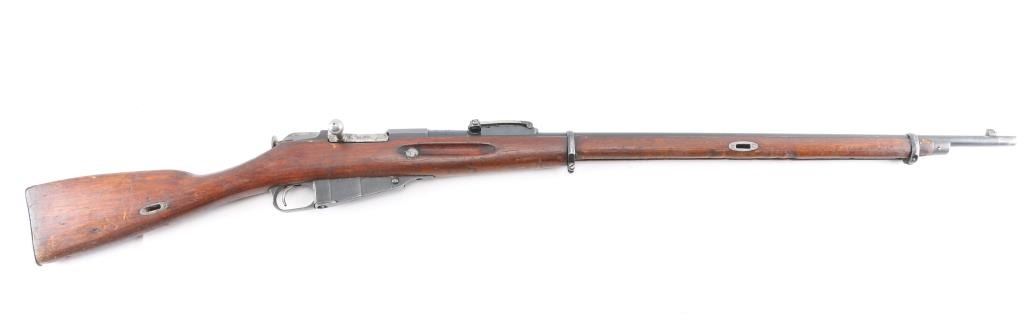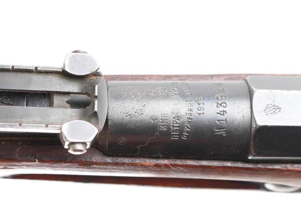 WW1 Imperial Russian military blued bolt action rifle with a 31-1/2" barrel Dated 1915. Made at the "Tula/ Emperor Peter the Great Ordnance Factory" (Marked on barrel). Imperial crest on barrel scrubbed,. CAI import mark on upper right barrel. Bore is a little rough/dark, but rifling present, Wood is good with the usual dents/dings. Action works well. Blued metal finish is mostly there, has dulled. Markings are clear, matched serial numbers on barrel,receiver, magazine, & butt plate,mismatched on bolt. Action works well. No cleaning rod.