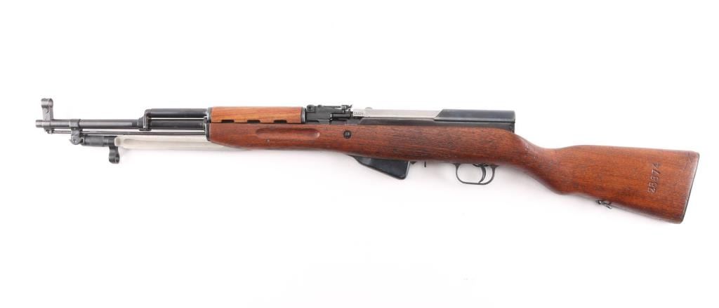 Zastava M59 PAP, also known as Papovka, is a Yugoslav licensed version of Soviet SKS semi-automatic rifle.'Mdl 59' Yugoslavian made gas-operated semi automatic rifle chambered in 7.62x39mm. Imported by CAI, right barrel. Features a blued finish, 20.5" barrel, hooded post front sight, tangent rear sight graduated to1,000 meters, cleaning rod, folding blade bayonet, manual safety, smooth trigger, fixed 10 round magazine, smooth wood handguard, pistol grip shoulder stock and trapdoor metal buttplate. Serial number matches on the receiver, bolt carrier, triggerguard, and stock. Rifle retains approximately 98% of it's blued finish, with slight edge wear, bore appears very good/bright, and wood stocks are very good. Serial numbers puts it at pre 1967,