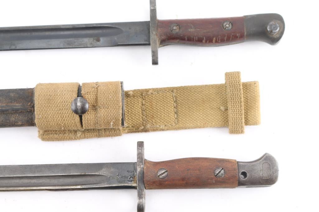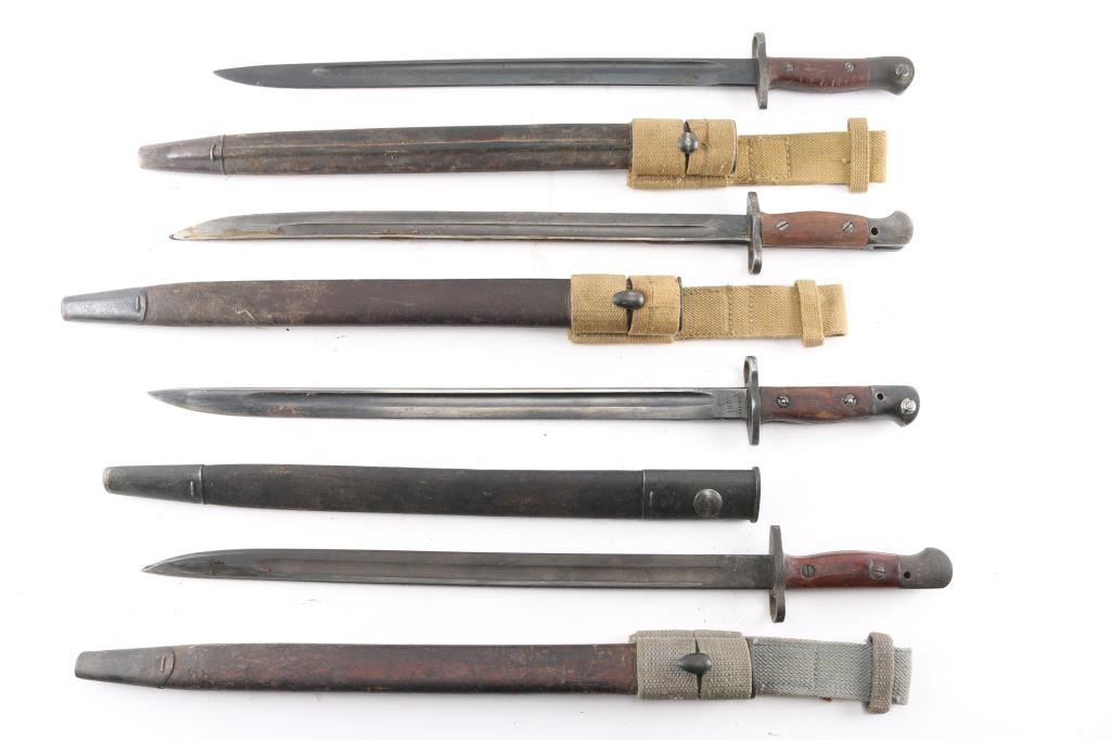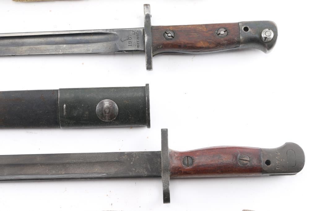 Lot of four Pattern 1907 bayonets, 17" blades, all have the standard marks, leather scabbards with metal fittings, three have web frogs, one is made by Wilkerson, dated 10-17, one is made by Lithgow, dated 8-20, one made by Vickers, dated 12-17, and one marked "MA", manufactured at Lithgow, dated 9-42. All in very good condition.