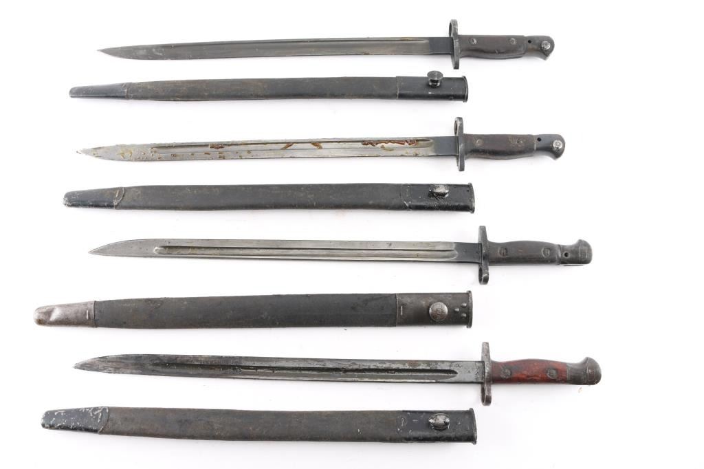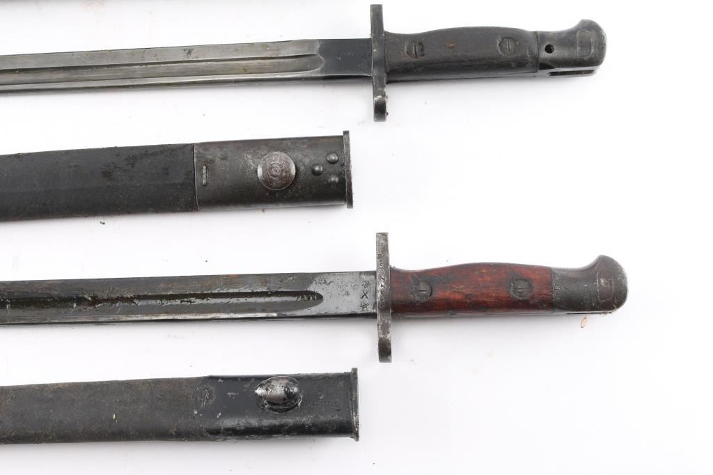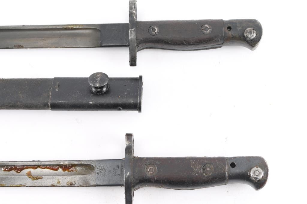 Lot of four Pattern 1907 bayonets, 17" blades, all have the standard marks, leather scabbards with metal fittings, one is made by Wilkerson, dated 9-18, one is made by Lithgow, dated 1919, crossguard stamped "2 M.D".2nd Military District (N.S.W.), one made by Sanderson, dated 11-16, and one made by Chapman, dated 3-16. All are coated in cosmoline from storage, need a good cleaning.
