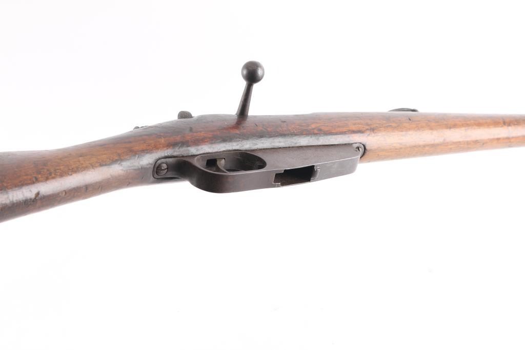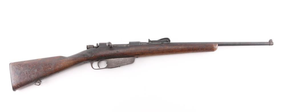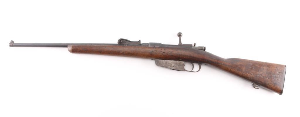 Italian military bolt action rifle had been shortened. Features 22" barrel, banded front sight blade, adjustable tangent rear sight, straight bolt handle, manual safety, Mannlicher type magazine accepts 6 round en-block clips. Walnut stock shortened, retains rear swivel and smooth buttplate. Bore is good condition, fairly bright, with slight erosion to rifling, frosting throughout. Metal retains dark color throughout, most has drifted to a brown color, much patina and some rust. Stock shows signs of heavy use with many small dents all over, shrinkage at buttplate.