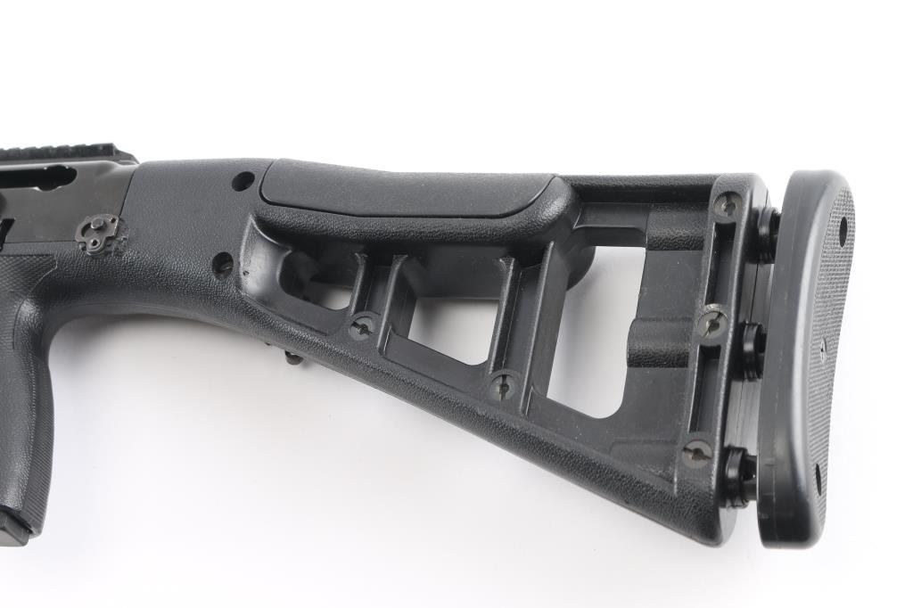 Economical magazine fed semi-automatic carbine. Features blued finish, 16.5" barrel, front sight removed, no rear sight, left side charging handle, smooth polymer trigger, thumb safety on the left side of the receiver, sling swivels, push button magazine release, 10 round magazine, black synthetic pistol grip shoulder stock. Bore is very good condition. Retains 85% finish with scratches and other handling marks. Polymer is very good. Includes one magazine.