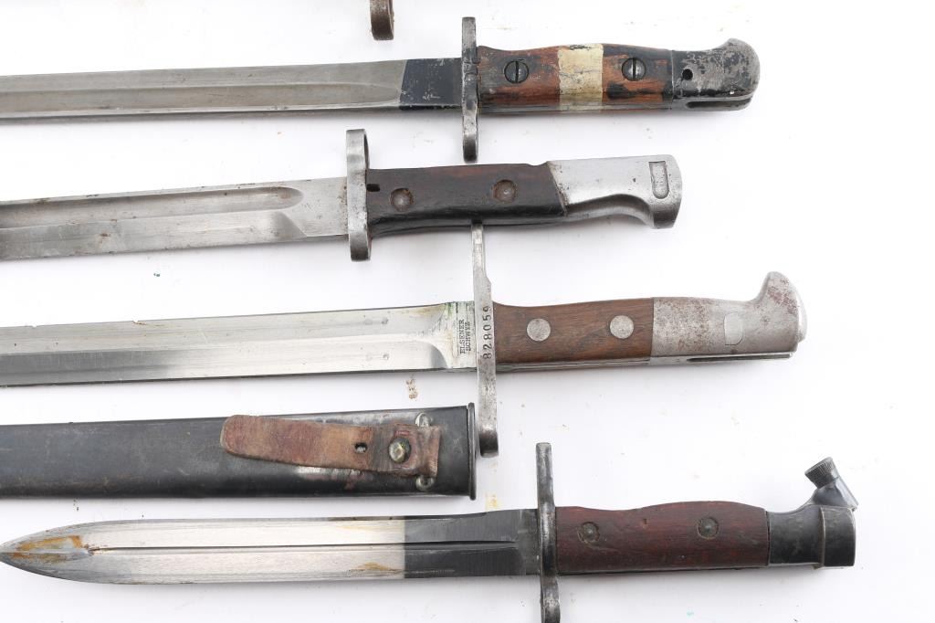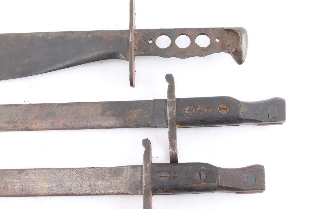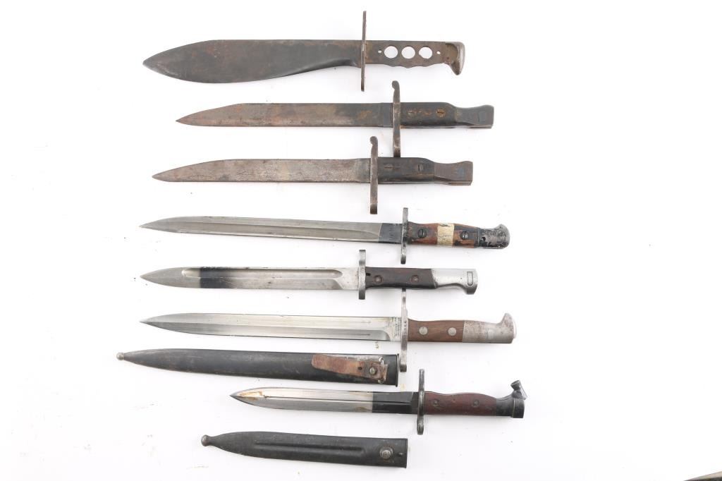 Seven Total. 1) Columbian M1912 Mauser Bayonet, no scabbard, unmarked except for serial number on the pommel, good condition. 2) Swiss M1918 bayonet for use with the K31, and M1911 rifles, with scabbard, very good condition. 3) Egyptian Hakim Bayonet, very good condition. 4) Two rare U.S. marked Ross Mk I rifles bayonets, no scabbards, marked "U.S." on the wood grips with flaming ordnance bomb. Both are covered in dried cosmoline, need a good cleaning. 5) British P1907 Mk I bayonet, no scabbard, grip painted with white stripe, R.F.I. maker, ricasso ,& crossguard stamped "DP" (Drill Purpose Only), overall good condition. 6) WWI US Bolo Knife Model 1917 Plumb Phila. 1918 no scabbard or grips.