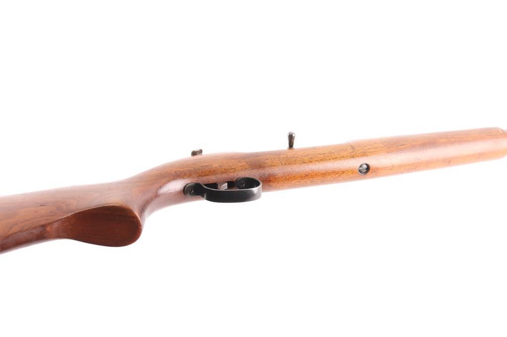 Semiautomatic rifle features approx 24" blued barrel, blade front & adjustable rear sights, 3/4 length tube magazine under barrel and manual safety on right side of receiver. Smooth walnut stock with black serrated Remington butt plate. Bore is very good condition. Retains 80% finish with fading, edge losses, scratches. Left side of receiver drilled and tapped four places for a side scope mount. Wood is good or better condition, solid, some finish losses, scratches and small dings. Safety has been labeled "OFF" and "ON" in large letters in black paint, on right side of stock.